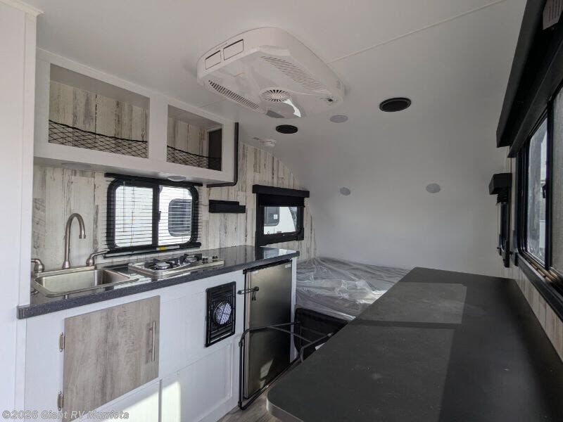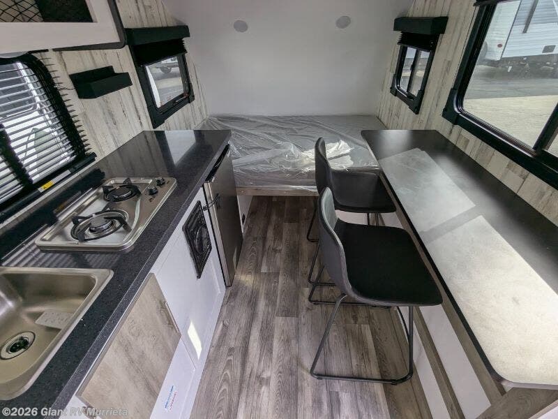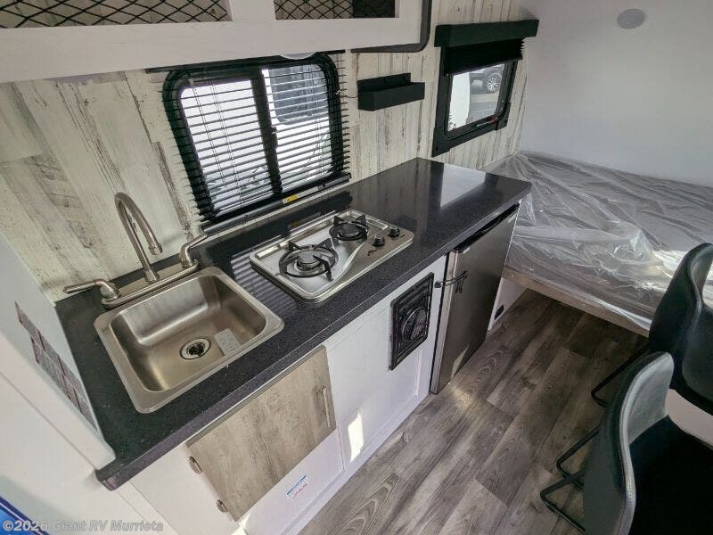 - Compact Kitchen: 3 cu. ft. 12V refrigerator, two-burner stovetop, and single-bowl sink for efficient meal prep.