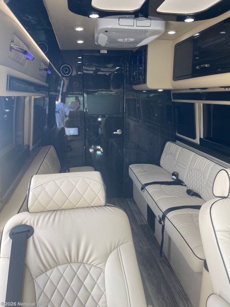 Luxury Class B Mercedes-Benz 3500 Sprinter designed for versatile travel, seating up to 10 and sleeping 2. It features a unique rear bathroom, full kitchen, premium amenities like dual HDTVs and Apple TV, and upgraded, massaging captain's chairs. It is designed to function as both a high-end mobile office and a comfortable camper.