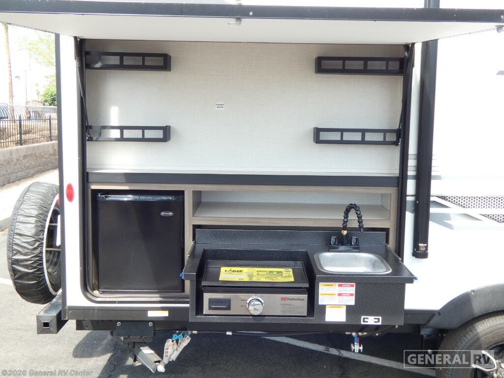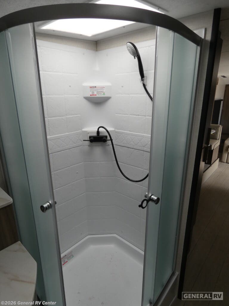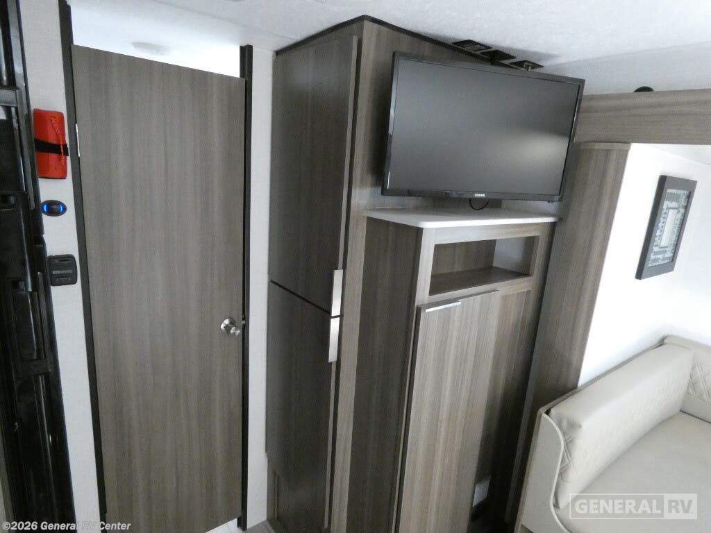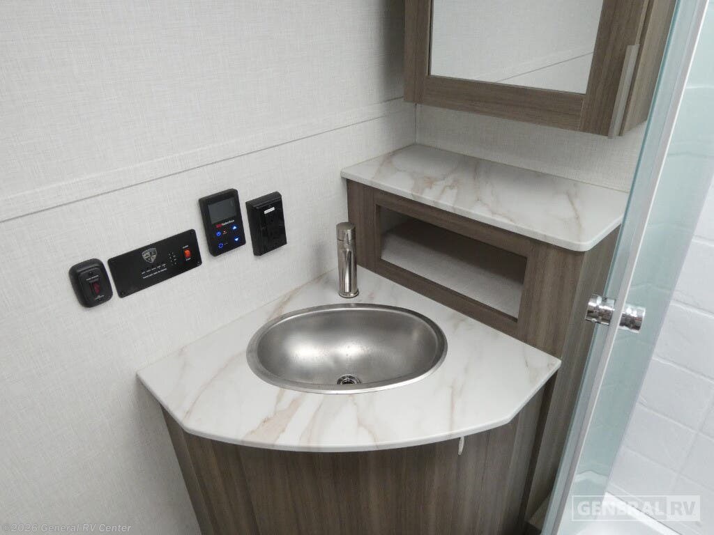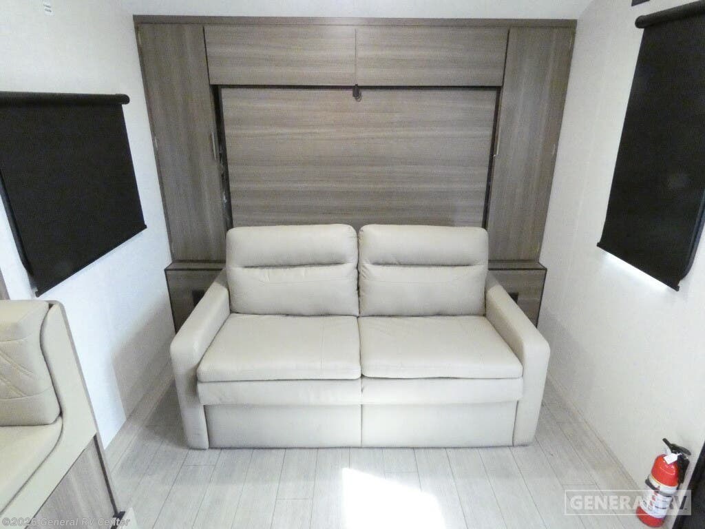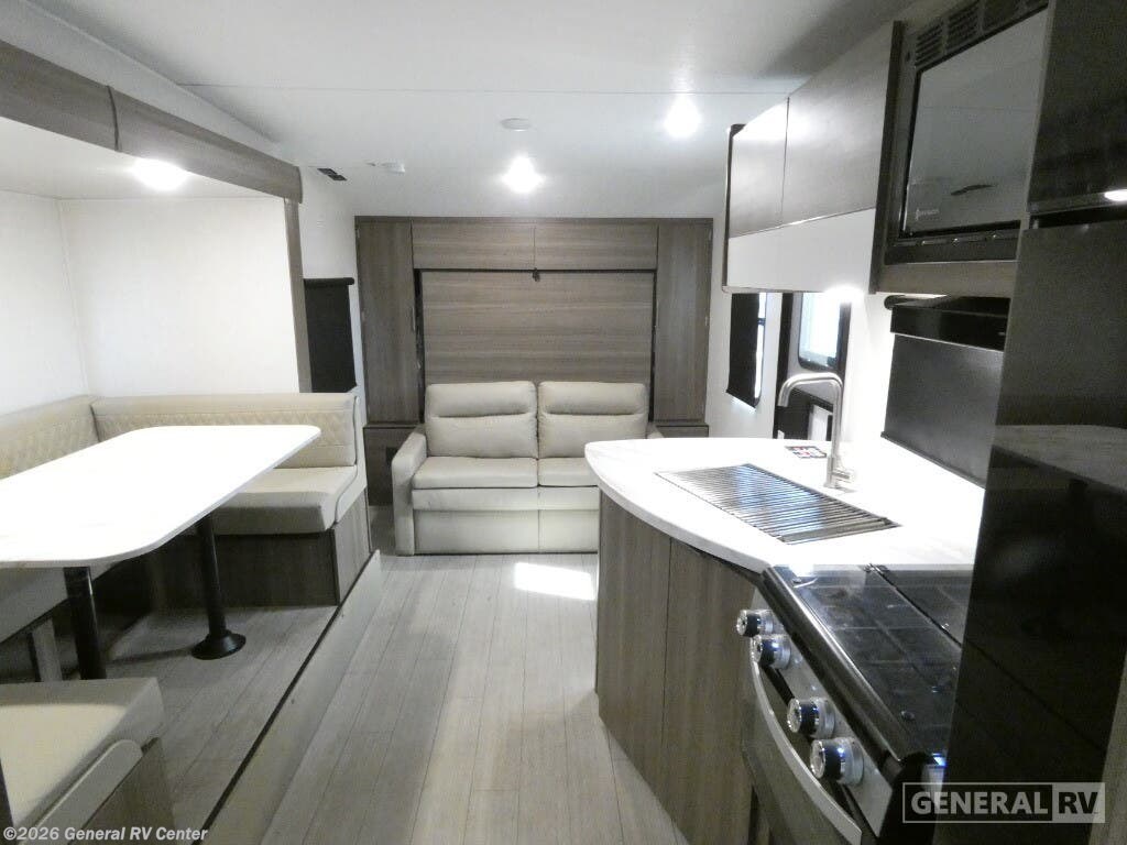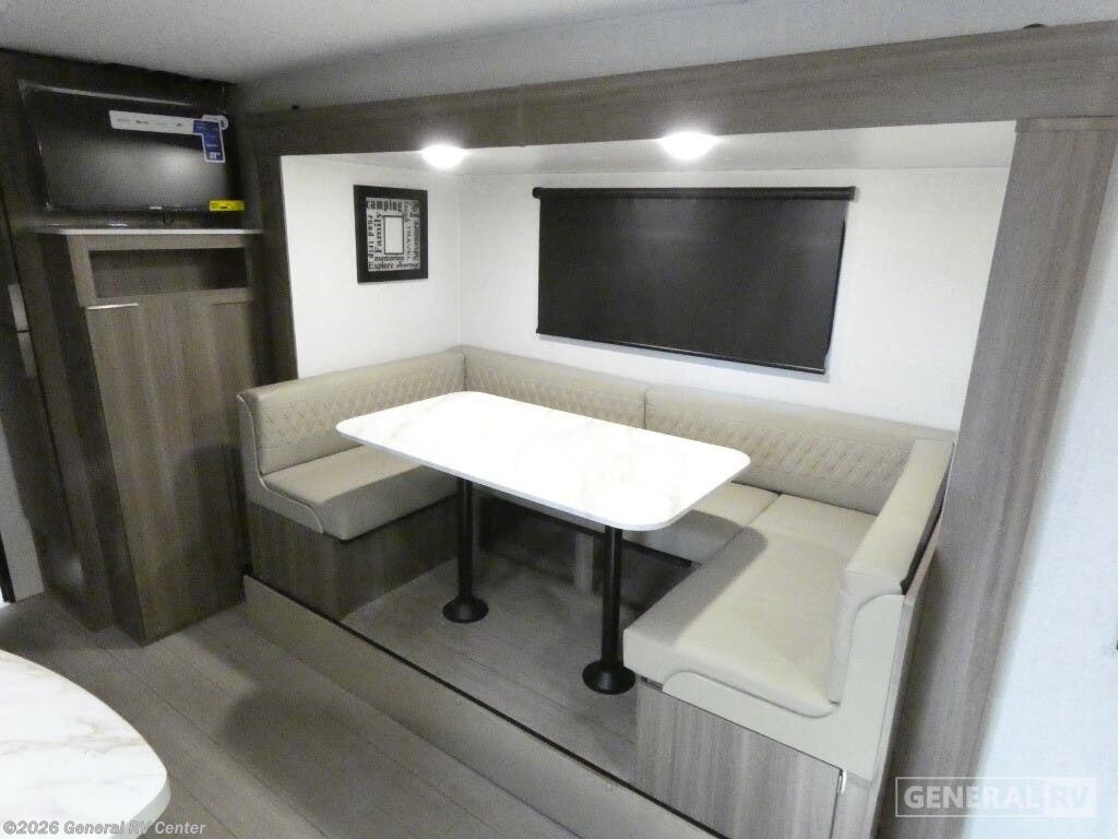 The 2025 Venture RV Sonic SN220VRB is a charming travel companion designed for those who crave comfort and convenience on the road. At just over 27 feet in length, this sleek and stylish RV offers a perfect blend of functionality and modern design. As you enter, the center kitchen greets you with a spacious layout featuring a three-burner cooktop and a mid-size electric refrigerator, ensuring you have all the essentials to whip up delicious meals. The U-shaped dinette provides a cozy spot for dining or relaxing, easily converting into an additional sleeping area when needed. The front of the RV houses a luxurious queen-sized Murphy bed, cleverly designed to maximize space and comfort. With ample overhead storage and pass-through storage compartments, you'll find plenty of room for all your travel gear. The rear bath offers a private retreat with a 34" shower, complemented by a linen closet to keep your essentials organized. Outside, the 13-foot powered retractable awning creates an inviting space for outdoor gatherings, while the Campfire Cafe griddle ensures you can enjoy al fresco dining with ease. Whether you're embarking on a weekend getaway or an extended adventure, the Sonic SN220VRB is equipped to elevate your travel experience. Discover more about this model and explore your options at your nearest General RV dealership location.