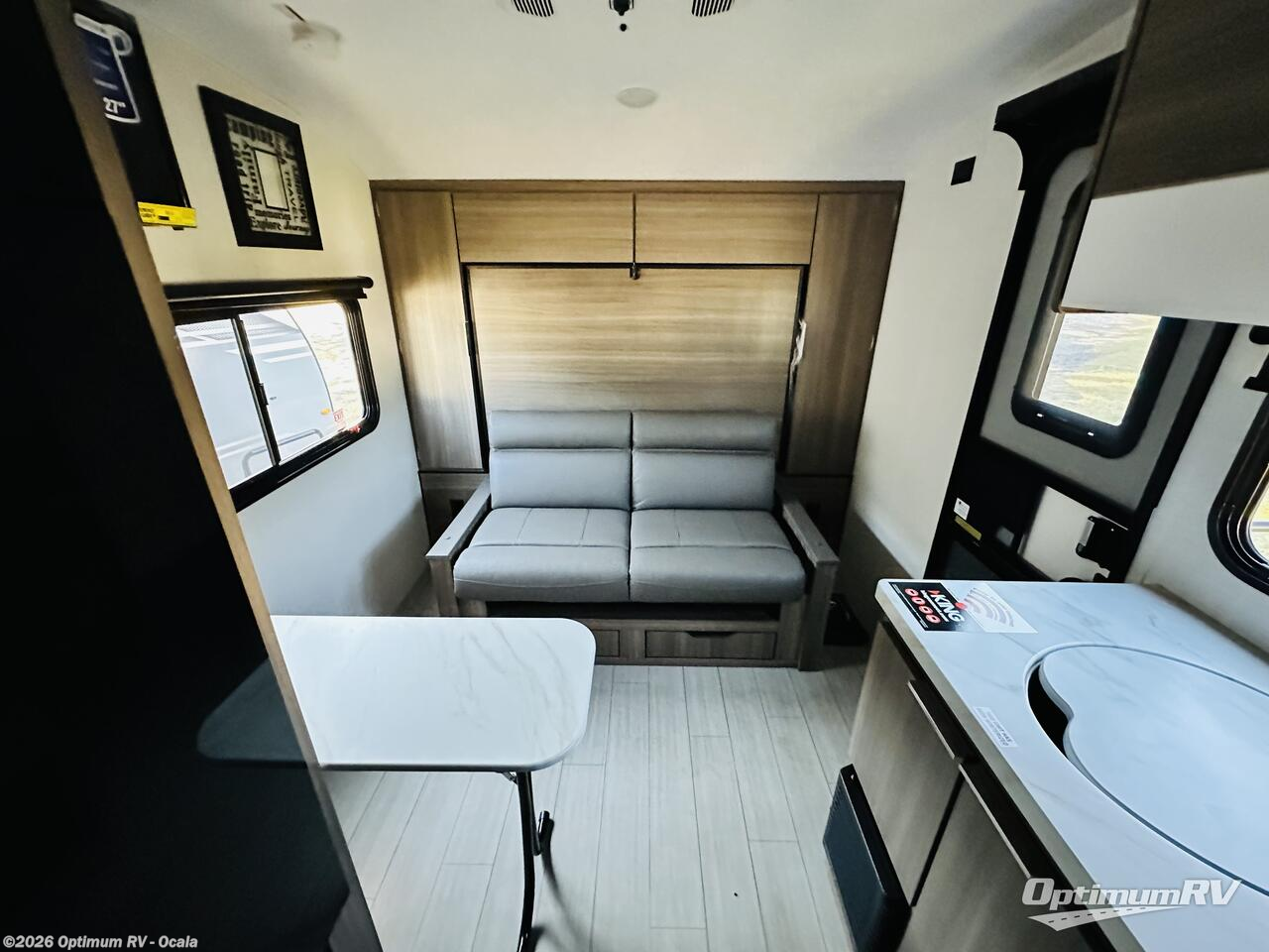 Get ready for last-minute plans to camp in this easy to tow and setup trailer. Some might even call this the "perfect couple's trailer" because of the versatile Murphy RV queen bed and sofa combination up front! You can also dine while at the sofa thanks to the removable table and charge your electronics from the StorMore bedside nightstands with a 110V outlet and USB charging just below the front wardrobes. You will have privacy in the rear bathroom that includes a wardrobe for more clothing and linens. The convection microwave along with the two-burner cooktop will allow you to make warm meals when you aren't cooking over a campfire, and the 11' power awning offers an outdoor living area to enjoy the scenery.