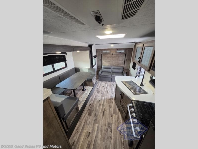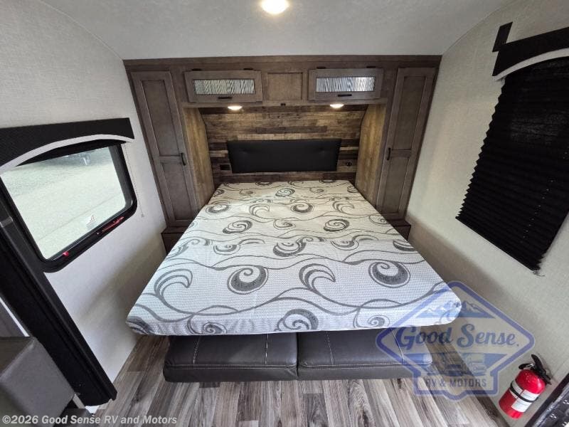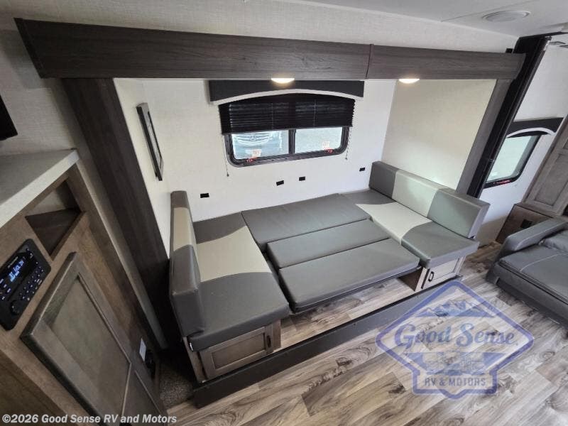 A cook will love this trailer with the choice to make meals inside with full amenities including an 8 cu. ft. refrigerator and a pantry, or outside while using the campfire cafe which offers a griddle and refrigerator, plus counter space to prepare and serve meals. There is sleeping space for four when you utilize the U-shaped dinette slide out that also provides more interior floor space along with the versatile Murphy bed and sofa up front. You will also find a privacy curtain that will section off this area that also features StorMore bedside nightstands with a 110V outlet and USB charging, and two wardrobes.