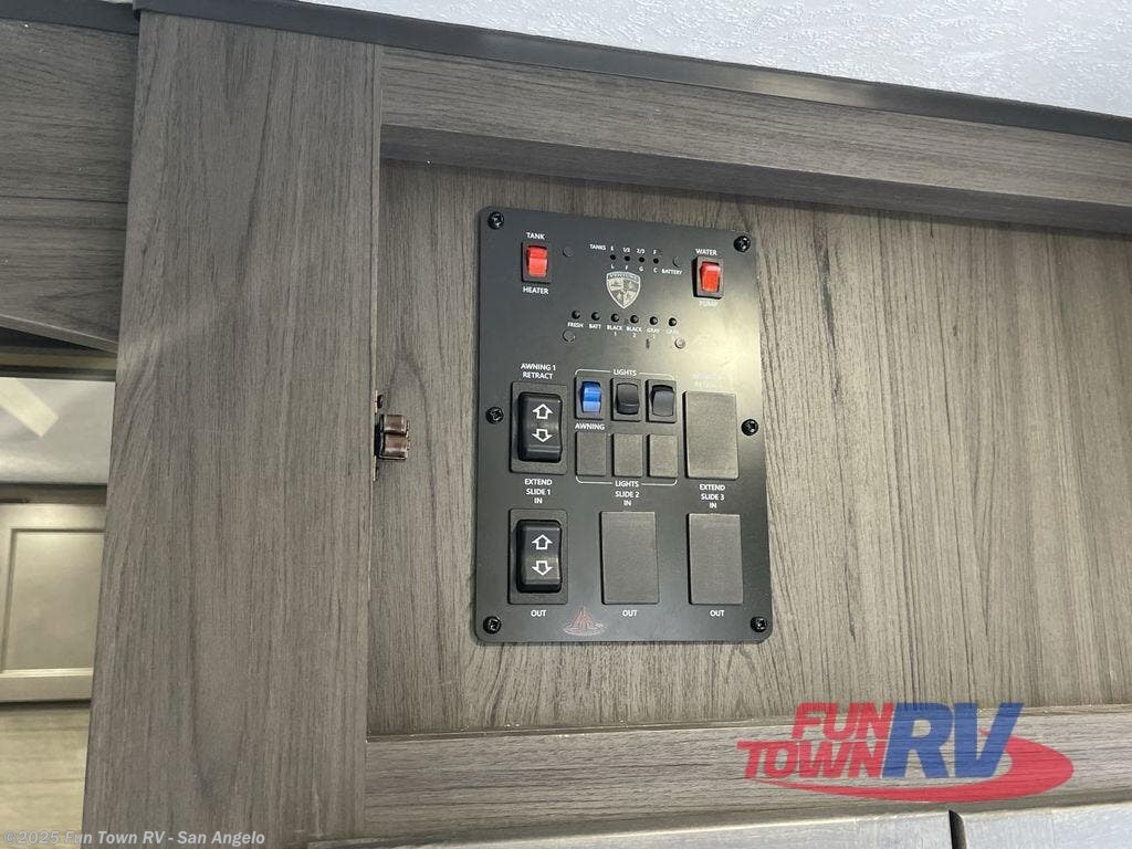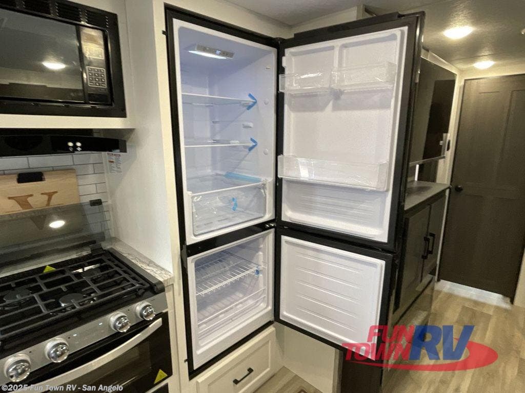 You, your kids and/or friends, and your pets can all have a relaxing camping trip in this travel trailer! The unique rear private bunkhouse has a set of 32" x 70" bunk beds, and a set of 28" x 70" bunks where the top bunk flips up, and its ability to convert into a desk, king bed, storage, or a pet palace. Just outside the bunkhouse is a full bathroom with a 30" x 36" shower to freshen up in each morning. Everyone can gather together at the 70" sofa and 42" booth dinette while watching a movie and enjoying the fireplace at the entertainment center. The front private bedroom has sliding doors to shut when you're ready to sleep on the sleep tight queen bed. Prepare your meals either indoors with the three burner cooktop or at the outside campfire café with the griddle, refrigerator, and sink!