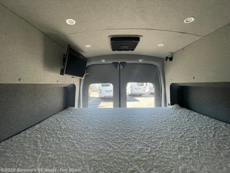 This camper van is perfect for two looking to start their van life or just enjoy weekend trips to the lake. The rear bed includes a 24" TV with a swivel mount so you can watch shows in bed, and there are storage drawers in the bedroom wall to keep your things organized. A wet bath includes a bath mirror, toilet paper holder, Eco Eclipse dispenser system, and more features that will allow you to easily clean up each day. You can make meals using the rear kitchen set up on the cooktop with a bamboo top, and there is a drawer refrigerator to keep food fresh.