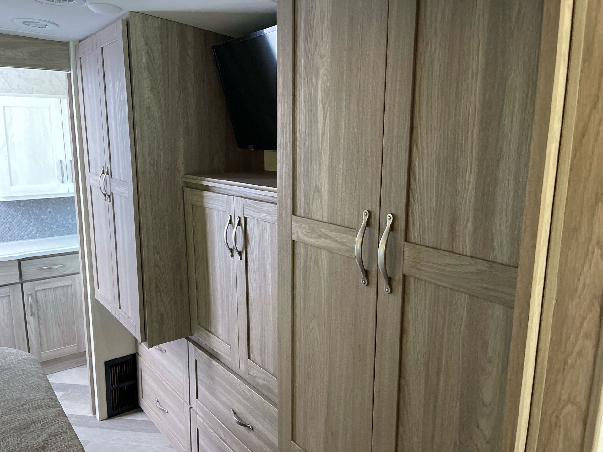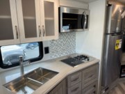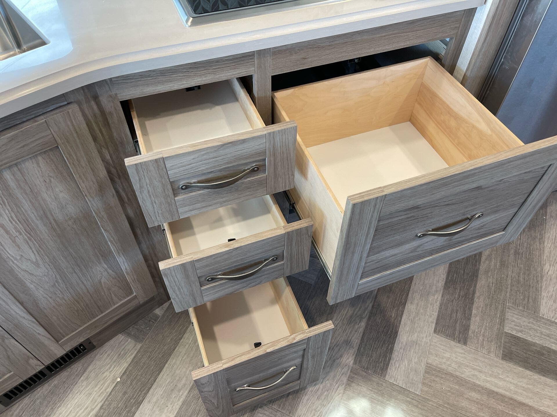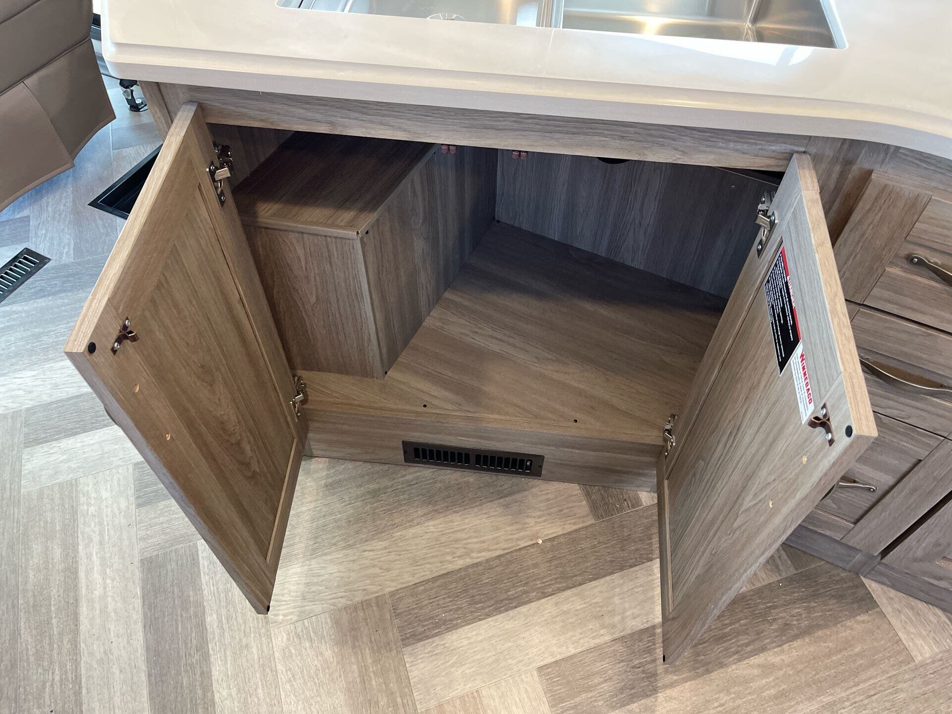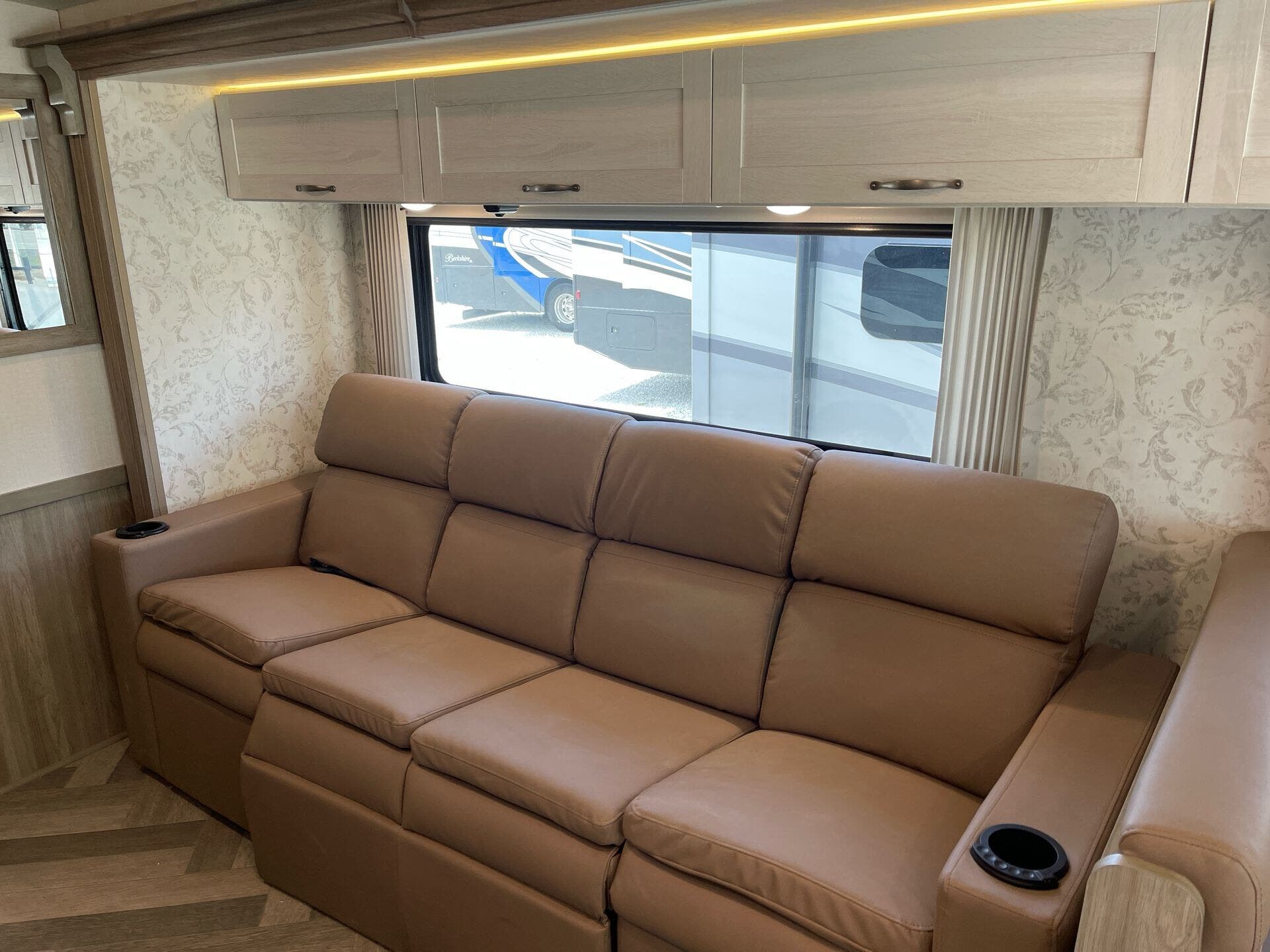 Inside, the 35F boasts a spacious layout with two slide-outs, providing ample living space. The main living area features an extendable sectional sofa (or optional theater seating), a 39-inch HDTV, and an electric fireplace, creating a cozy environment for relaxation . The kitchen is equipped with a Corian countertop, microwave/convection oven, gas/induction range top, and a large residential refrigerator with an icemaker, ensuring meal preparation is a breeze .