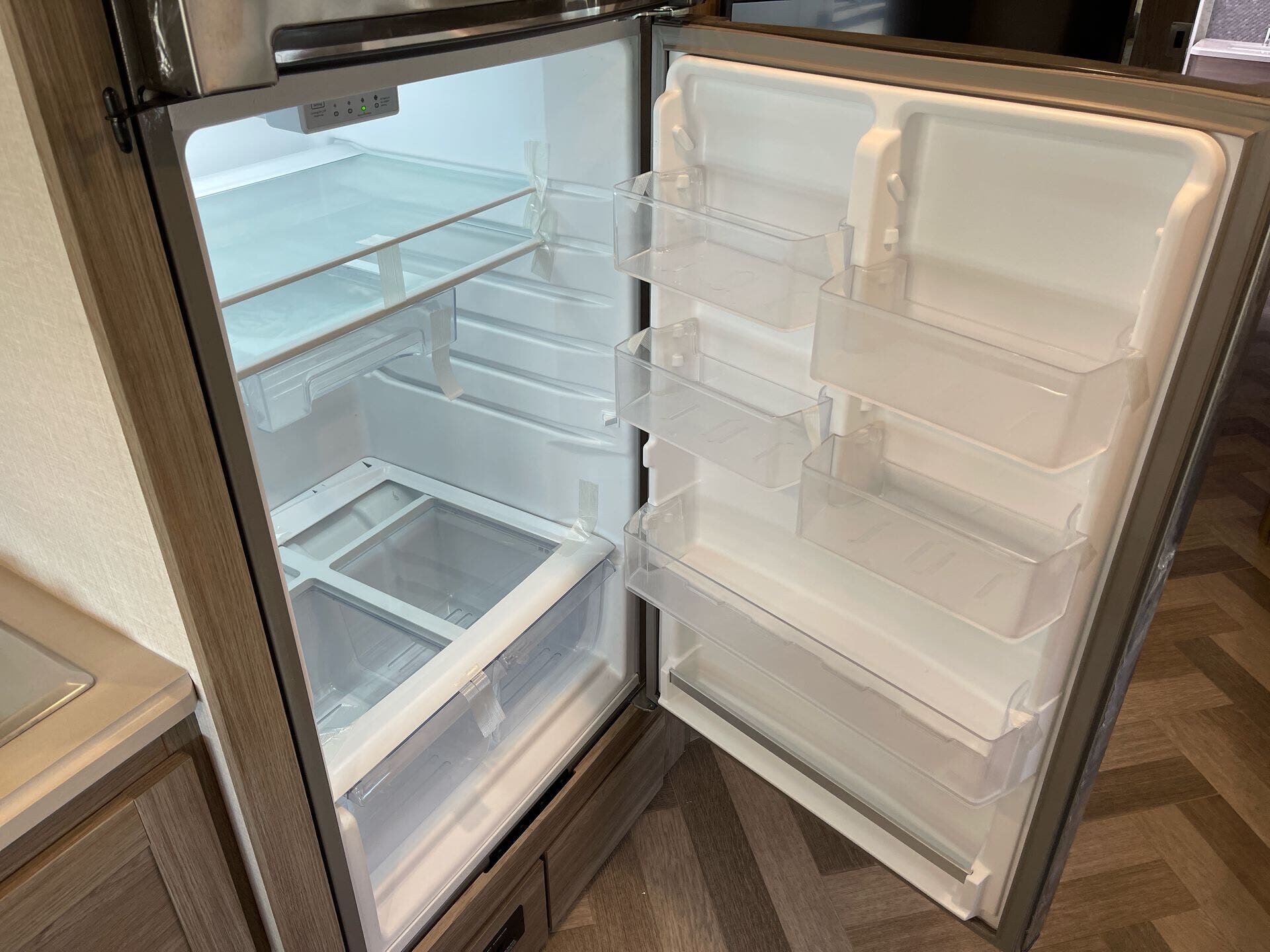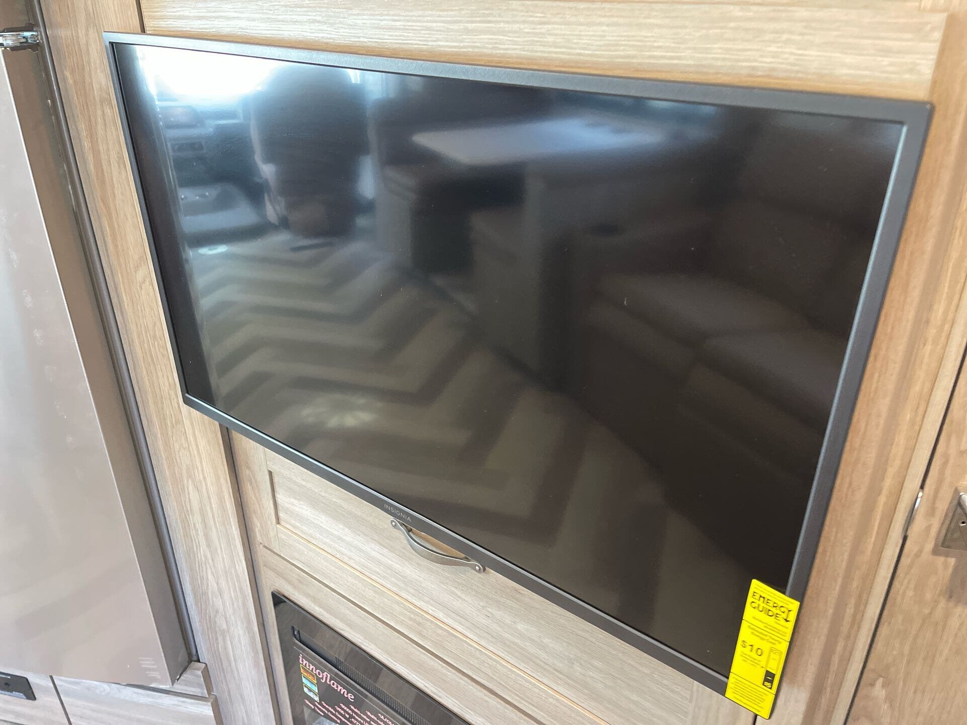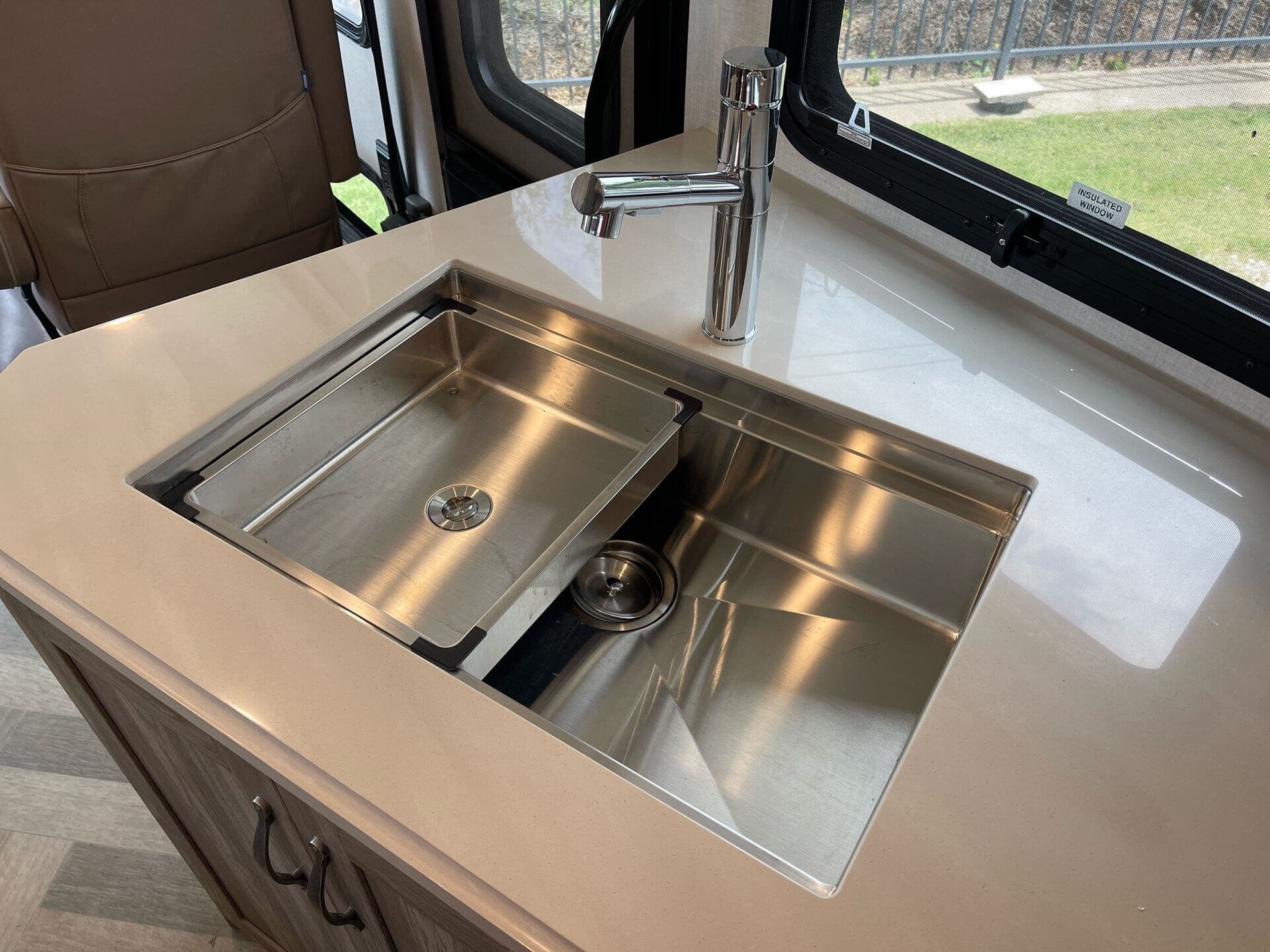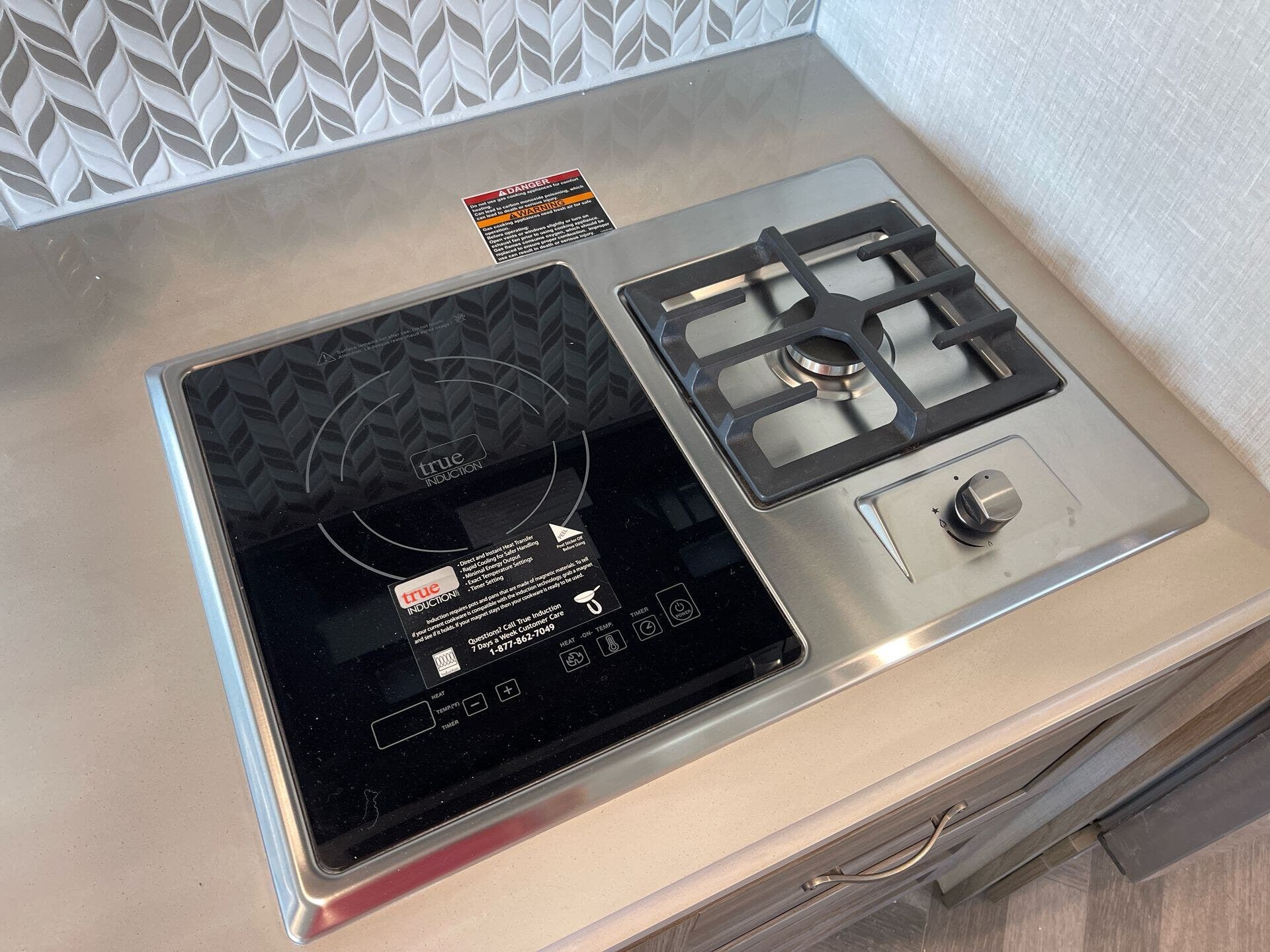 Inside, the 35F boasts a spacious layout with two slide-outs, providing ample living space. The main living area features an extendable sectional sofa (or optional theater seating), a 39-inch HDTV, and an electric fireplace, creating a cozy environment for relaxation . The kitchen is equipped with a Corian countertop, microwave/convection oven, gas/induction range top, and a large residential refrigerator with an icemaker, ensuring meal preparation is a breeze .