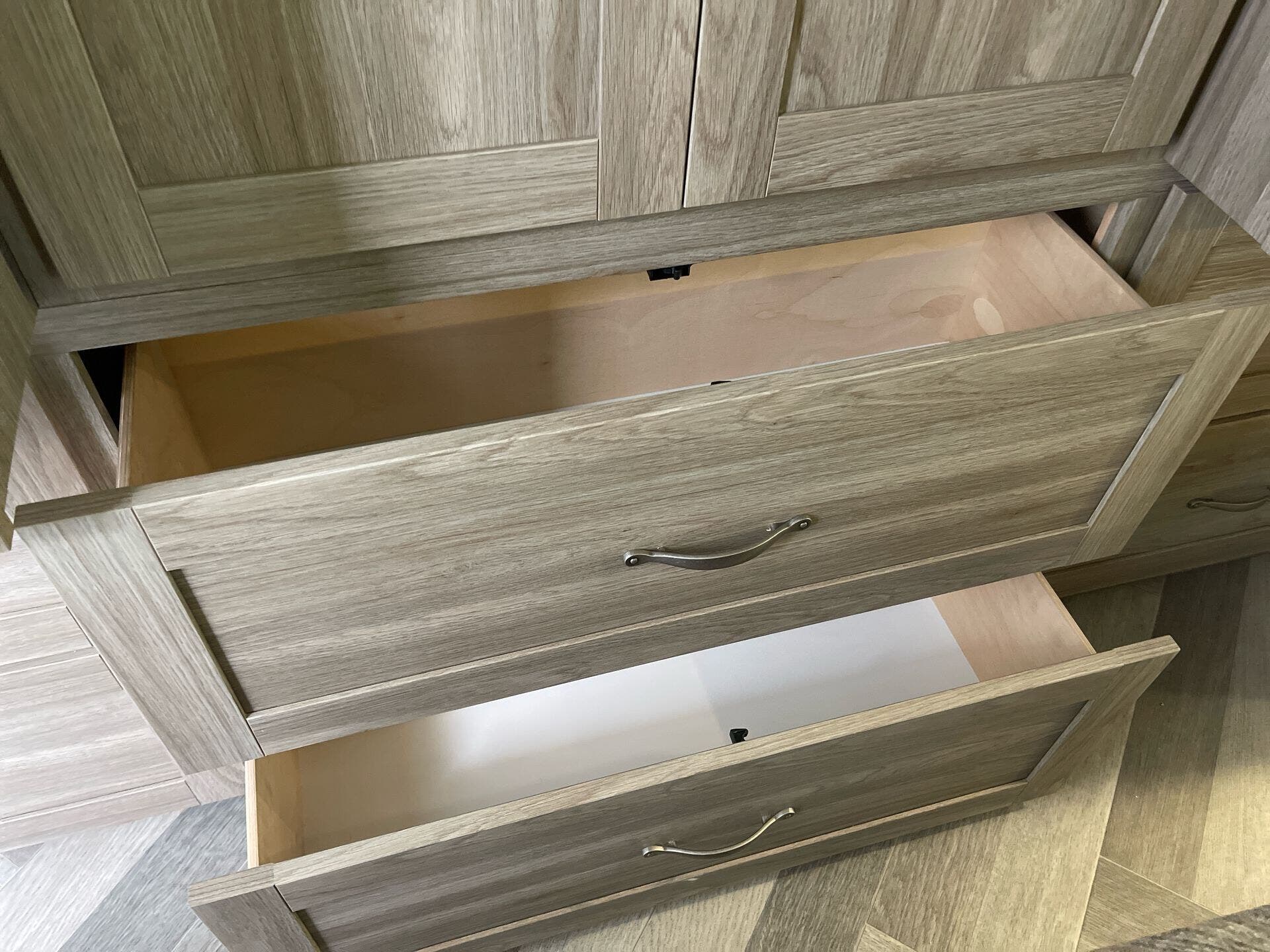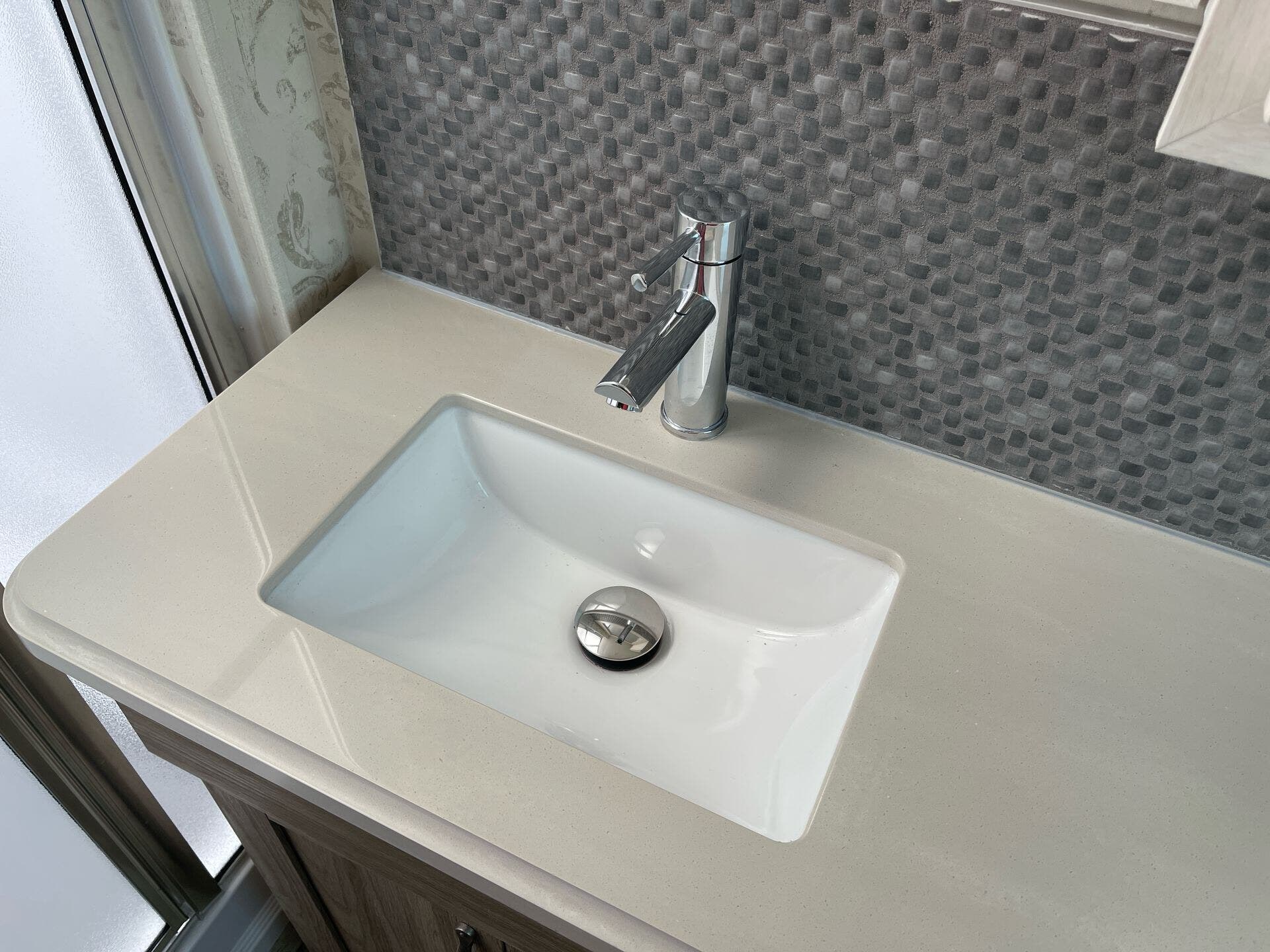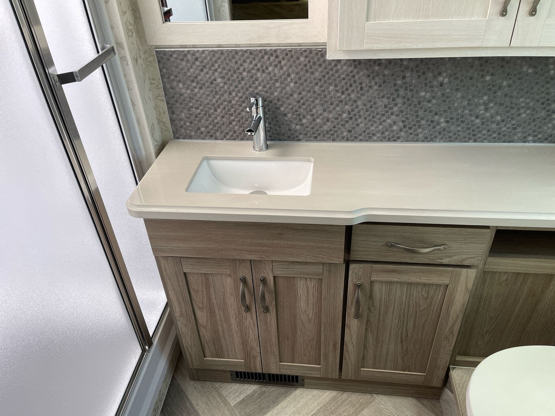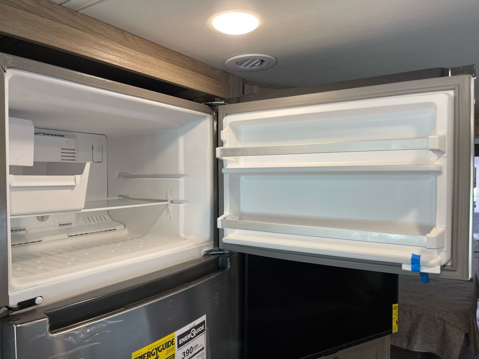 Inside, the 35F boasts a spacious layout with two slide-outs, providing ample living space. The main living area features an extendable sectional sofa (or optional theater seating), a 39-inch HDTV, and an electric fireplace, creating a cozy environment for relaxation . The kitchen is equipped with a Corian countertop, microwave/convection oven, gas/induction range top, and a large residential refrigerator with an icemaker, ensuring meal preparation is a breeze .