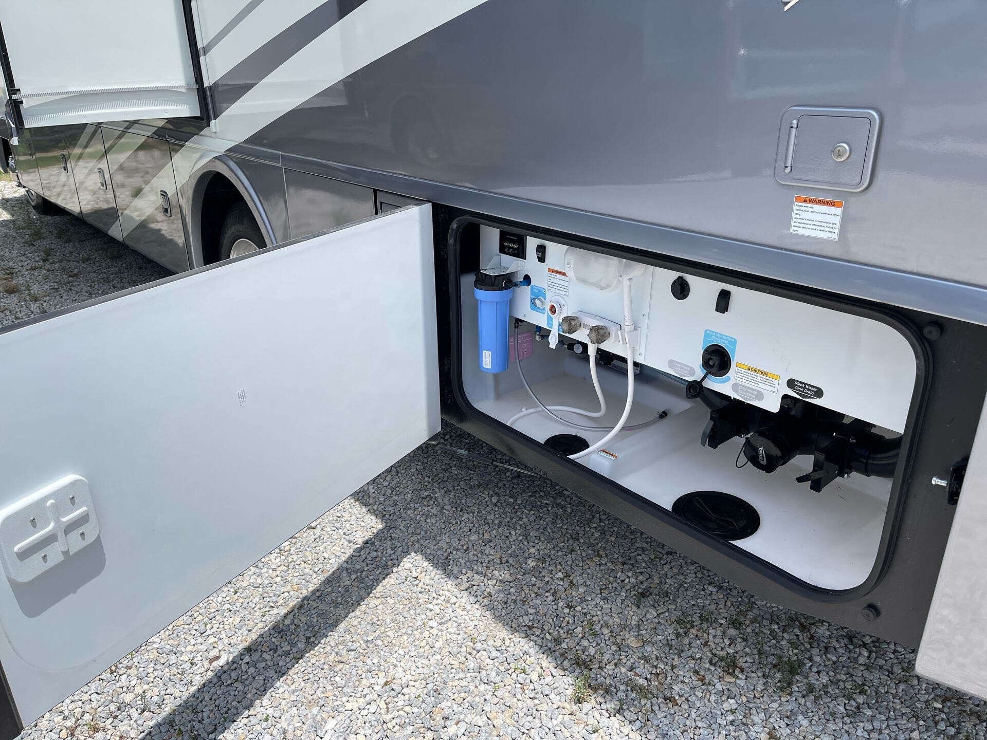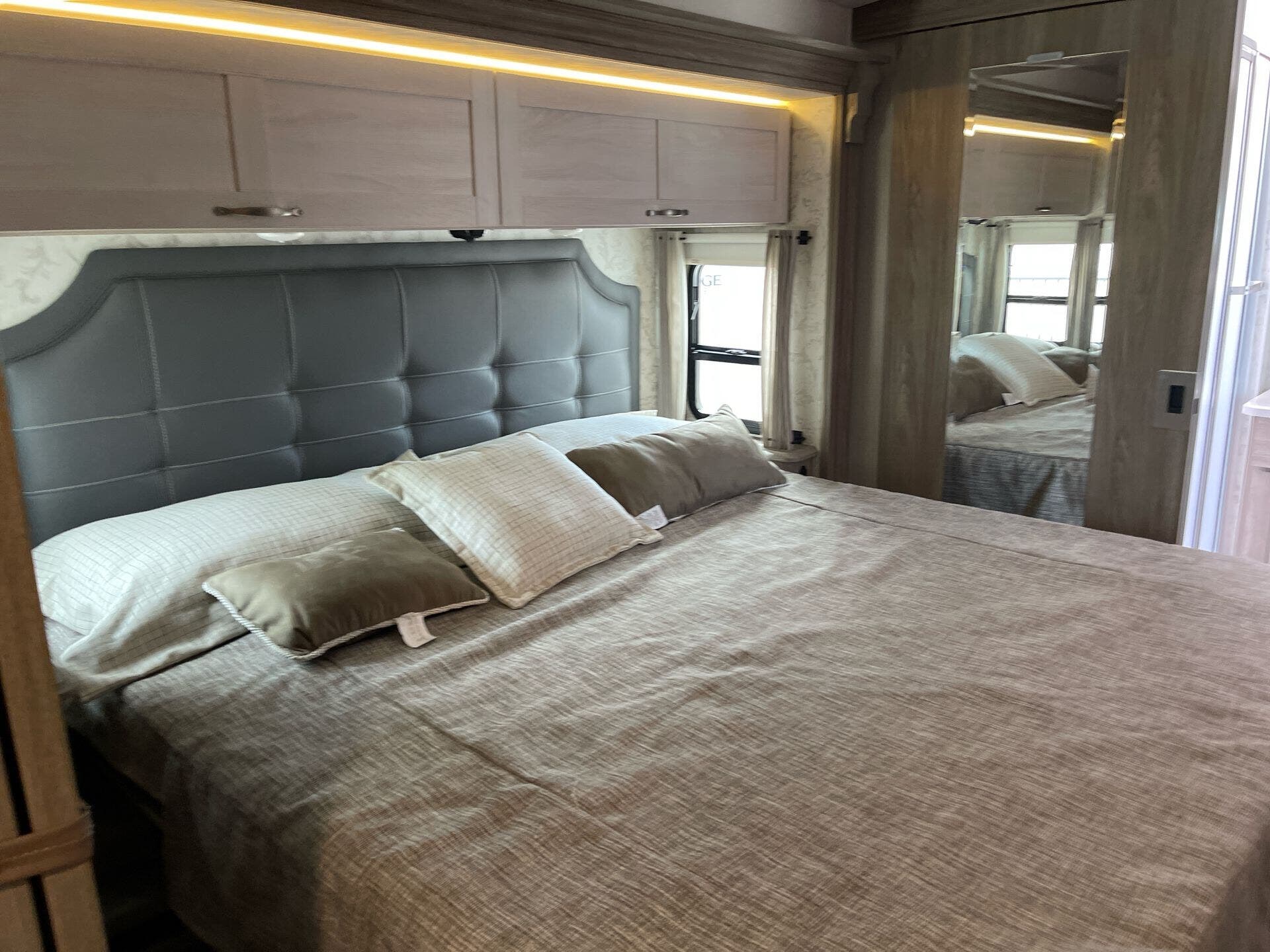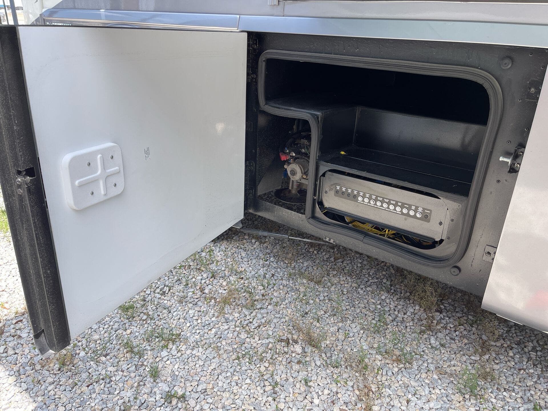 Additional amenities include dual 13,500 BTU A/C units with heat kits, a 40,000 BTU ducted furnace, a 5,500-watt Cummins Onan® Marquis Gold™ gas generator, and a 2,000-watt inverter/charger, ensuring comfort and self-sufficiency on the road .