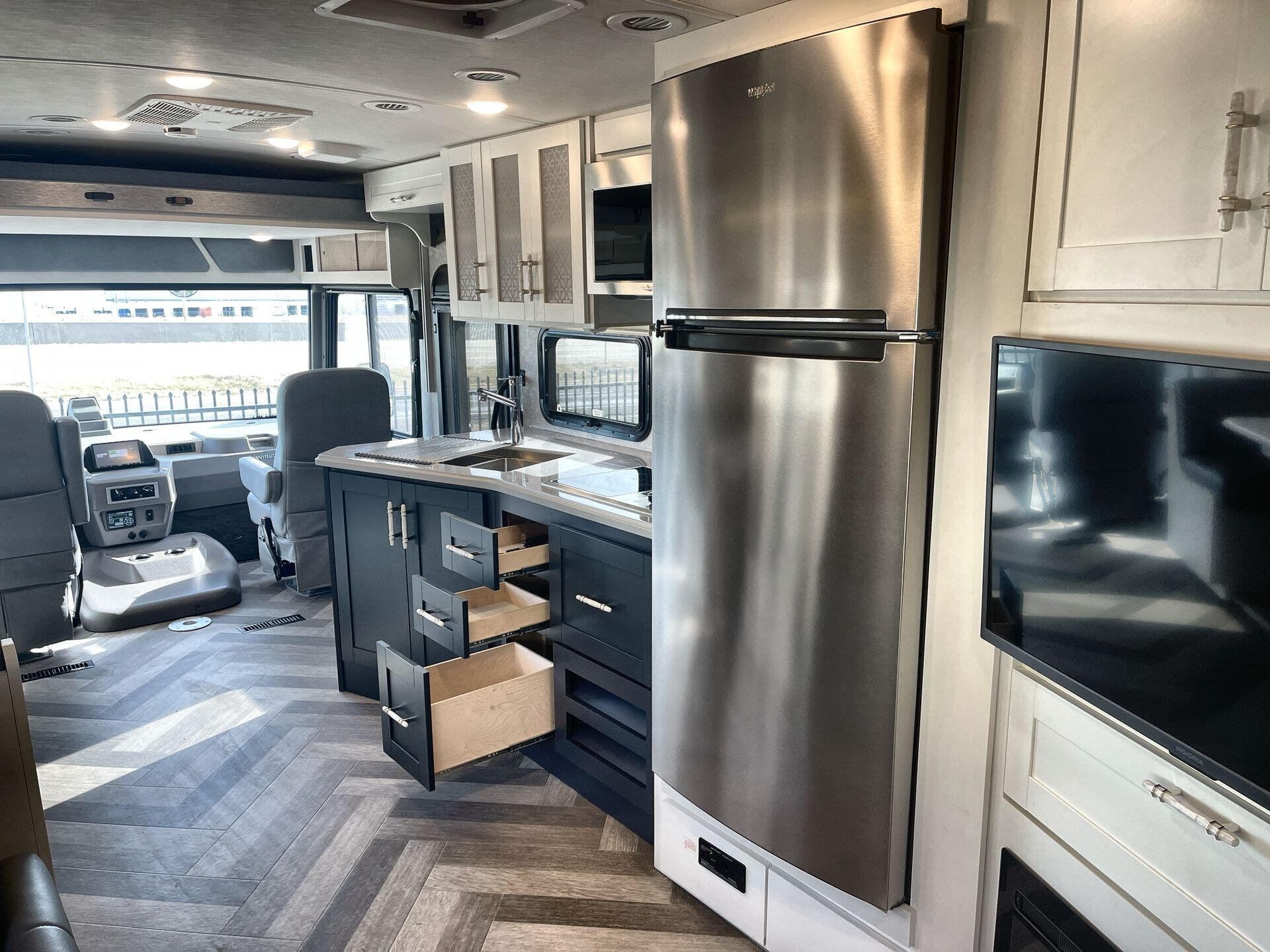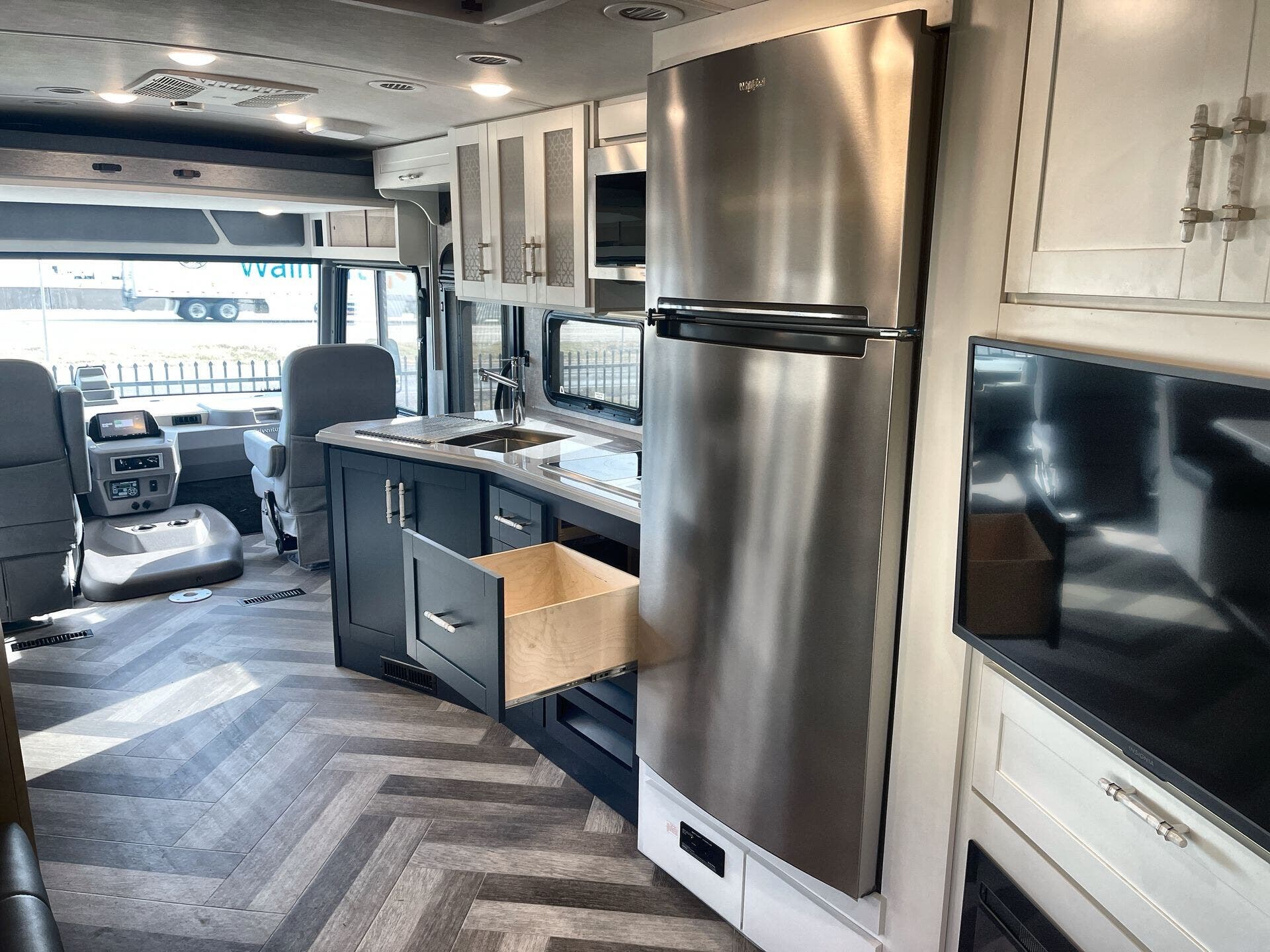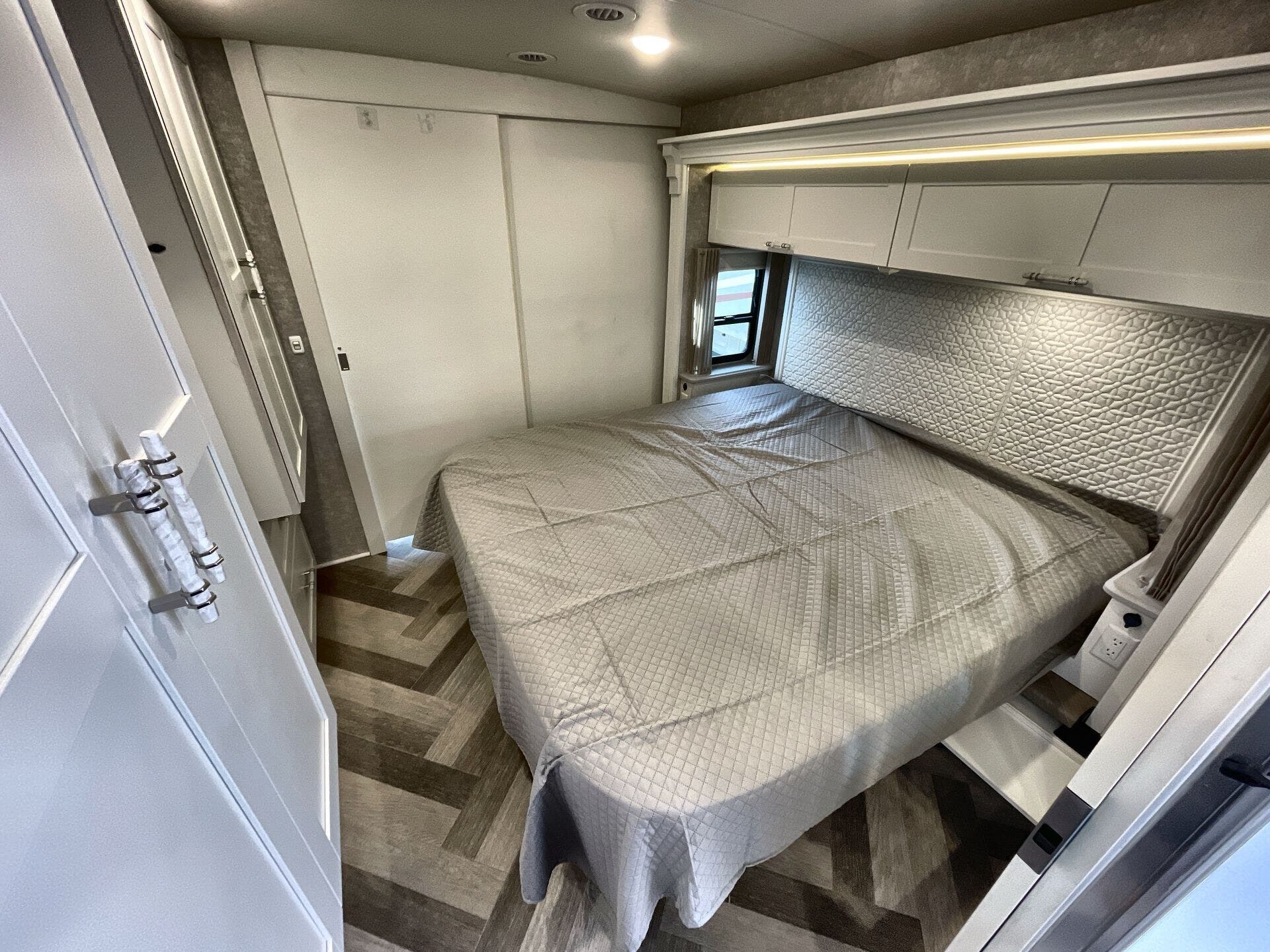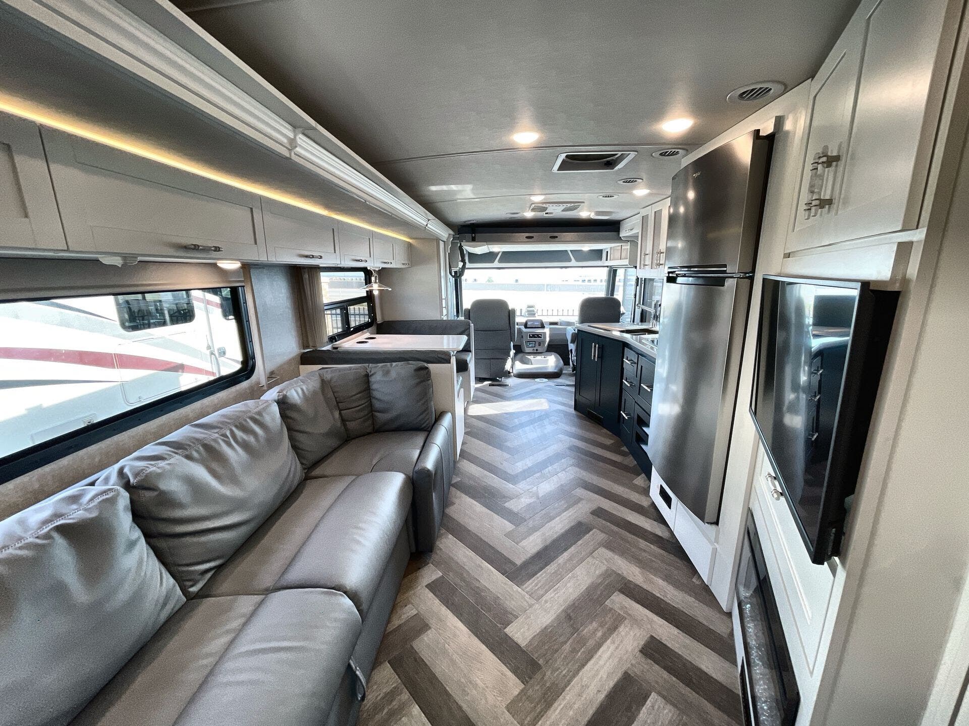 The Adventurer combines practical RV layout with high-end touches. Two slideouts open up the living space, creating an airy kitchen and lounge area that’s easy to navigate. The living room centers around a comfortable L-shaped sofa and a dinette, ideal for family meals or work on the road. A fireplace adds ambiance on cool evenings, while the residential refrigerator ensures ample storage for groceries on longer trips. A dedicated pantry keeps essentials organized, and the glass shower door adds a touch of luxury to the bathroom. With room for five sleepers, this motorhome is well-suited for couples who love weekend getaways or small families enjoying extended adventures.