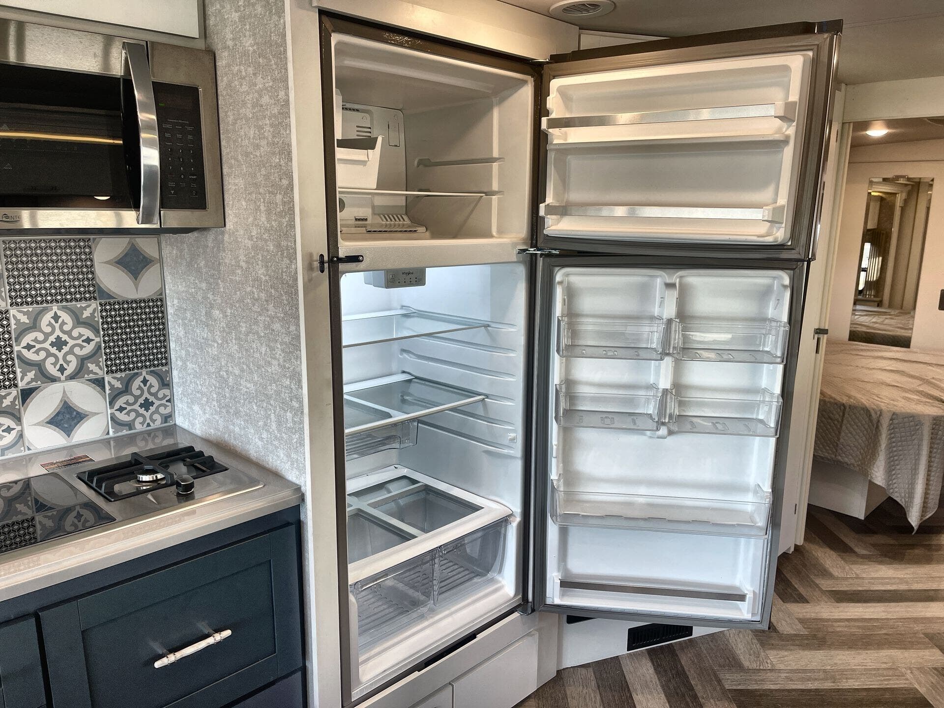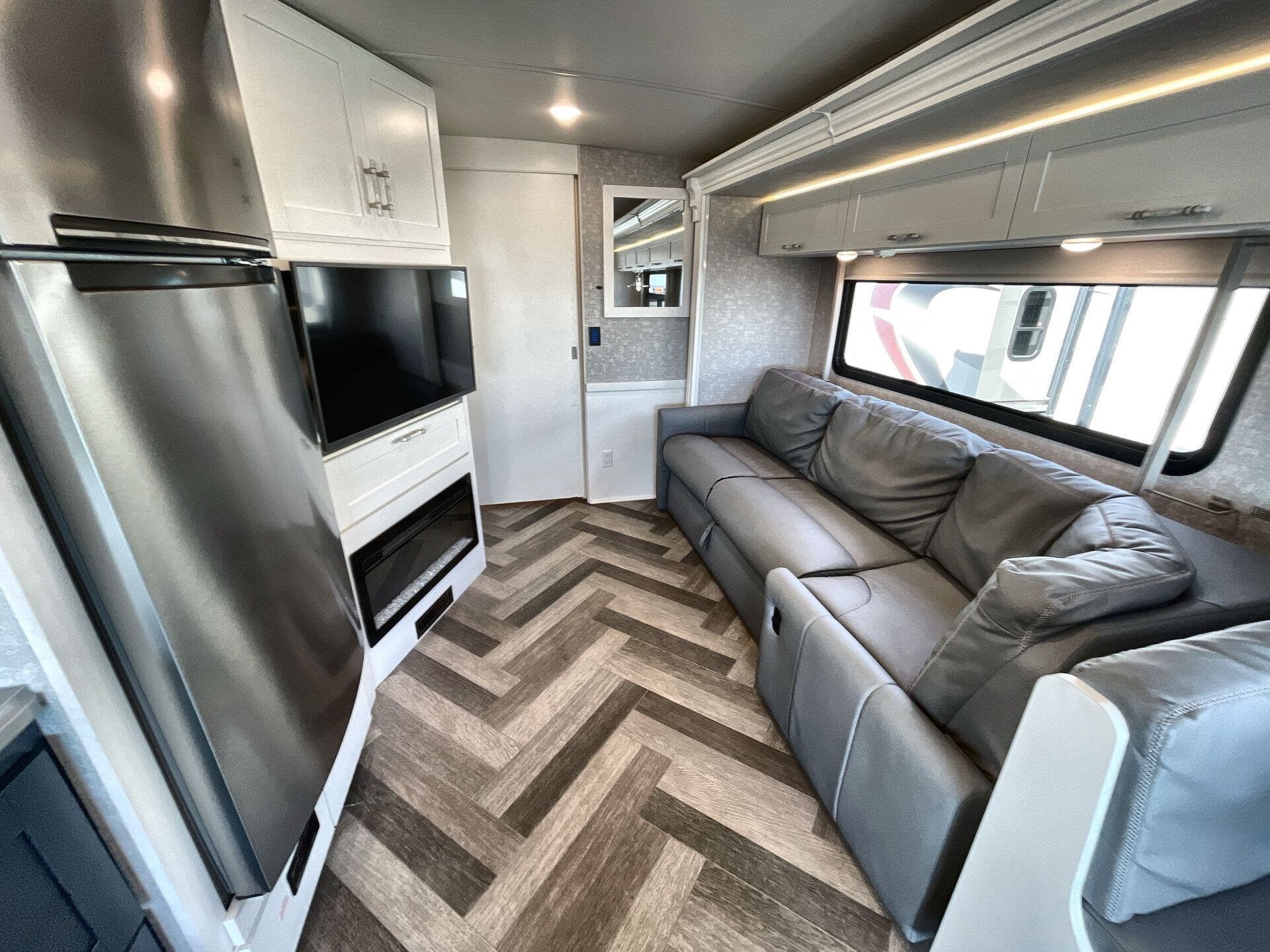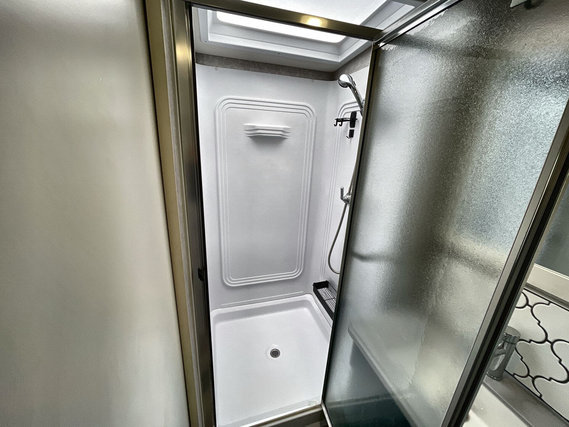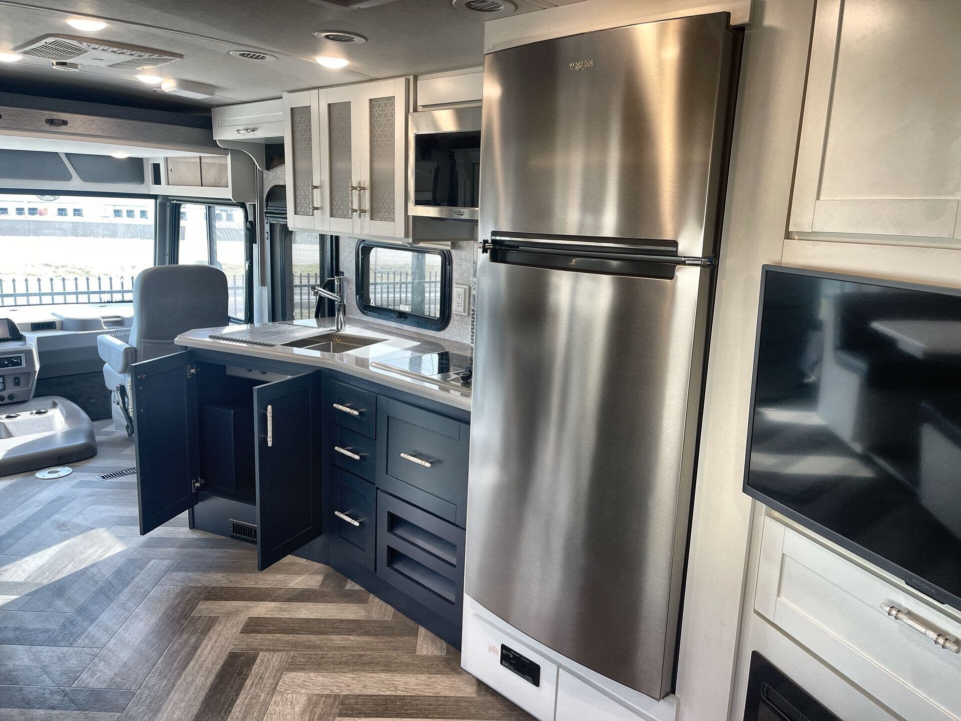 The Adventurer combines practical RV layout with high-end touches. Two slideouts open up the living space, creating an airy kitchen and lounge area that’s easy to navigate. The living room centers around a comfortable L-shaped sofa and a dinette, ideal for family meals or work on the road. A fireplace adds ambiance on cool evenings, while the residential refrigerator ensures ample storage for groceries on longer trips. A dedicated pantry keeps essentials organized, and the glass shower door adds a touch of luxury to the bathroom. With room for five sleepers, this motorhome is well-suited for couples who love weekend getaways or small families enjoying extended adventures.