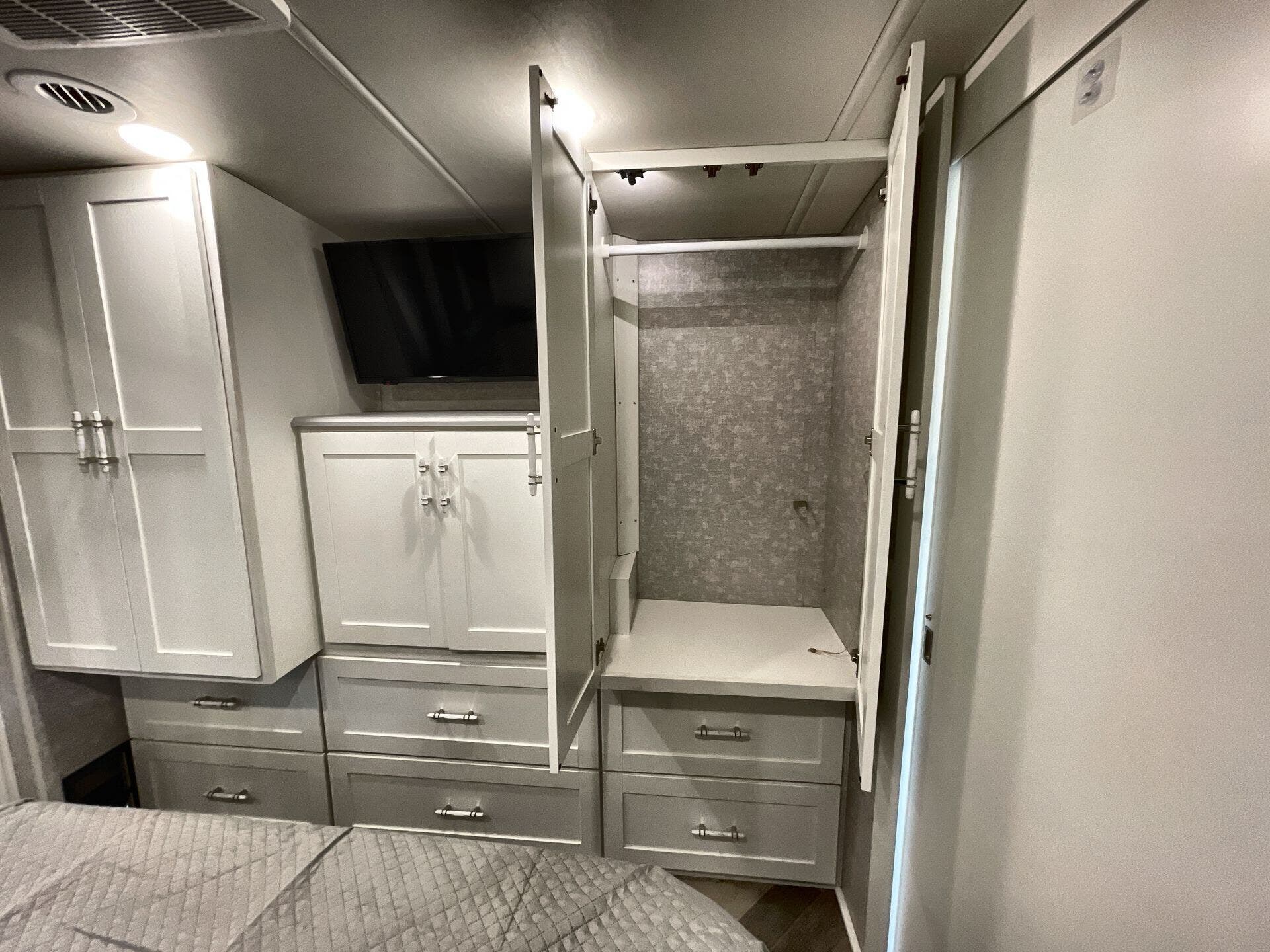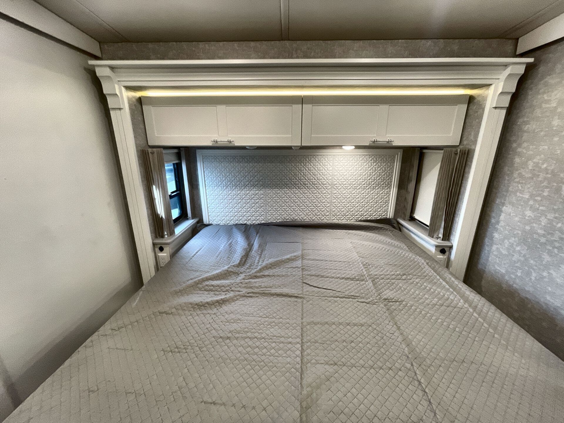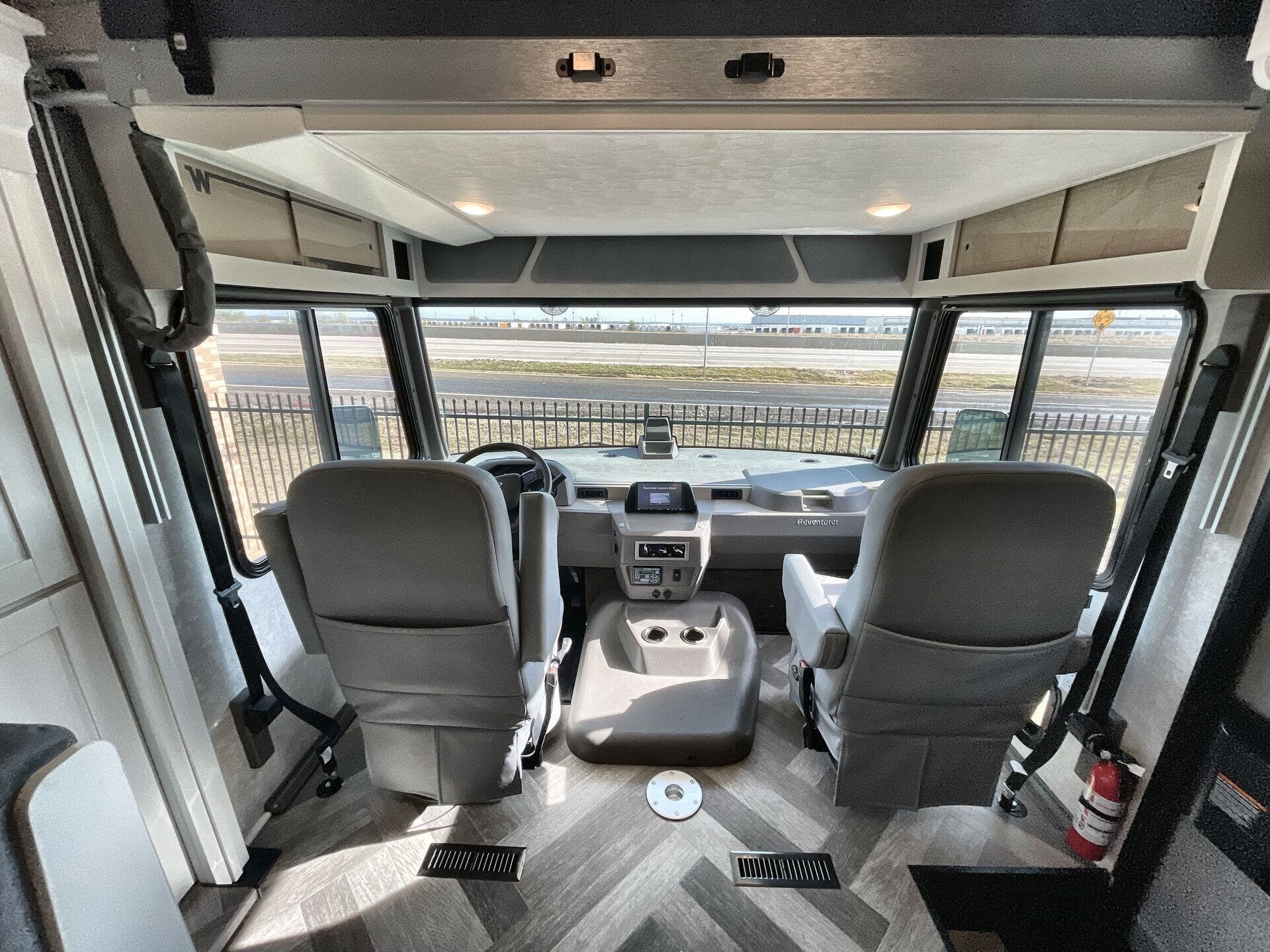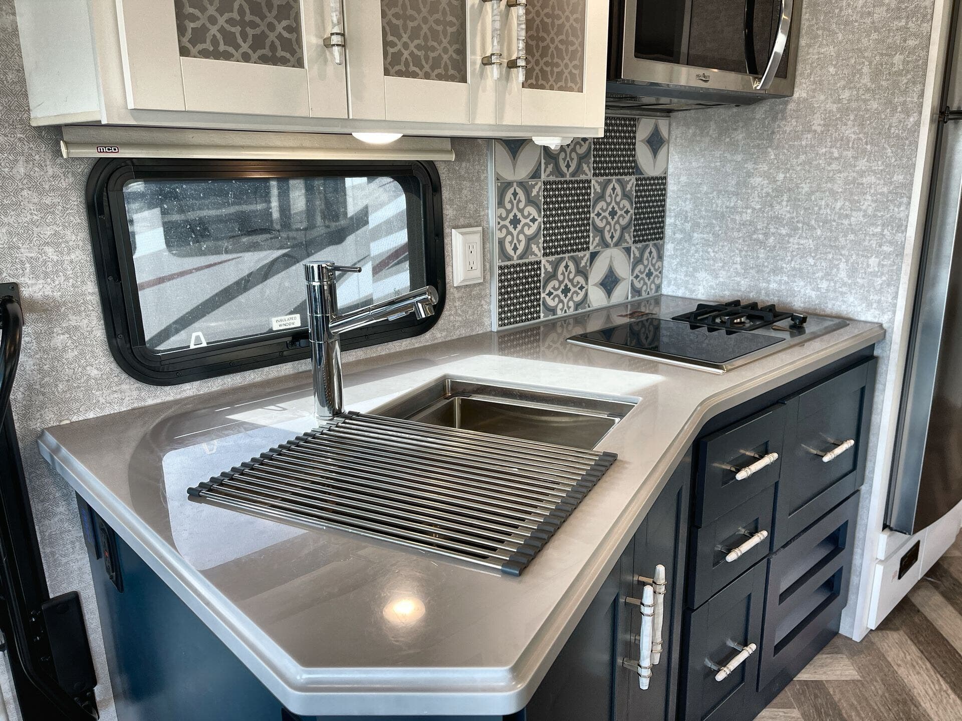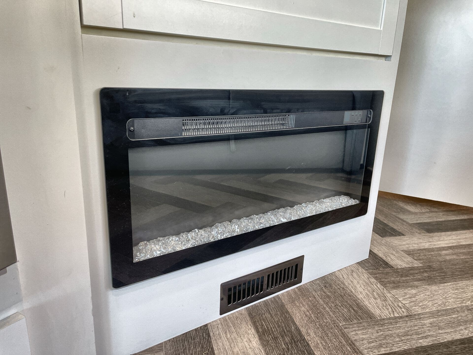 The Adventurer combines practical RV layout with high-end touches. Two slideouts open up the living space, creating an airy kitchen and lounge area that’s easy to navigate. The living room centers around a comfortable L-shaped sofa and a dinette, ideal for family meals or work on the road. A fireplace adds ambiance on cool evenings, while the residential refrigerator ensures ample storage for groceries on longer trips. A dedicated pantry keeps essentials organized, and the glass shower door adds a touch of luxury to the bathroom. With room for five sleepers, this motorhome is well-suited for couples who love weekend getaways or small families enjoying extended adventures.
