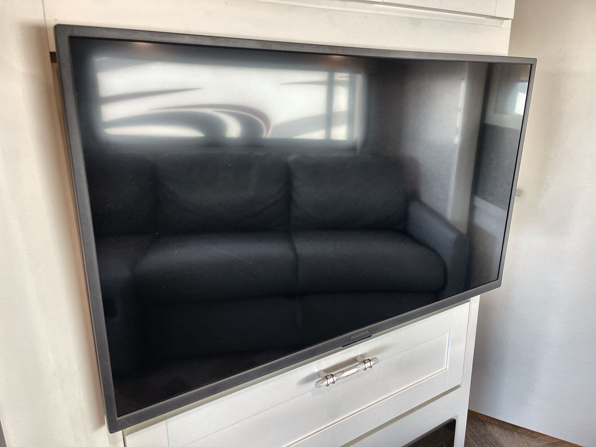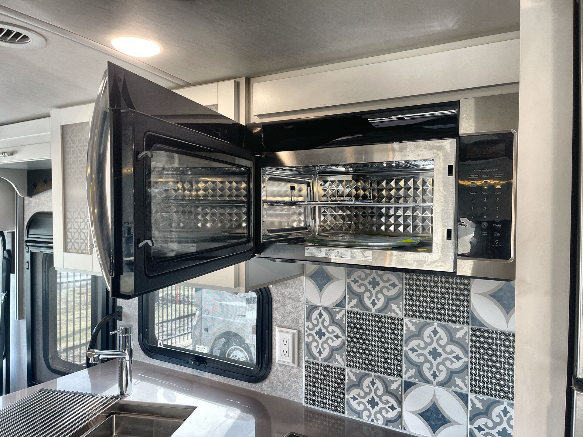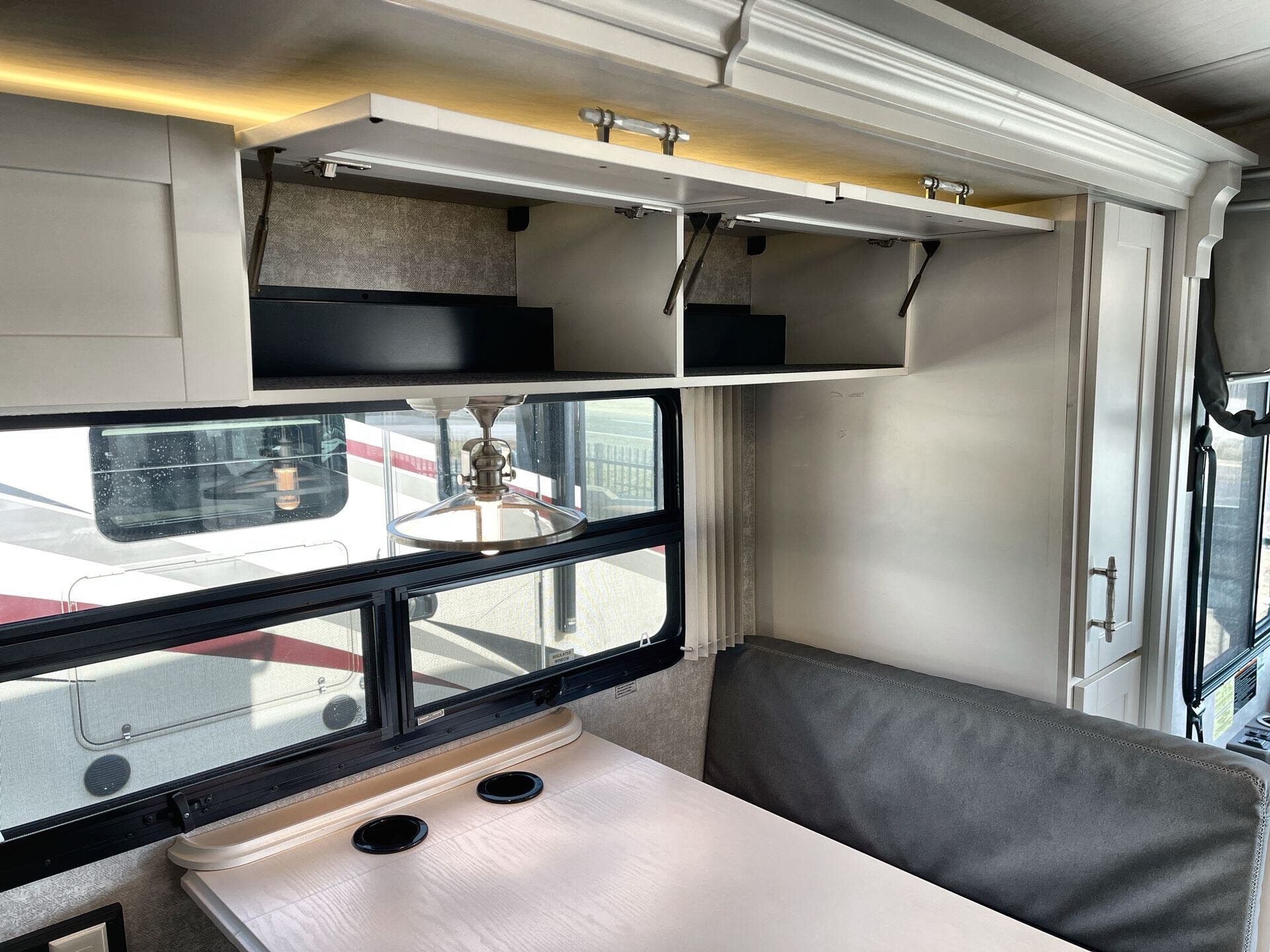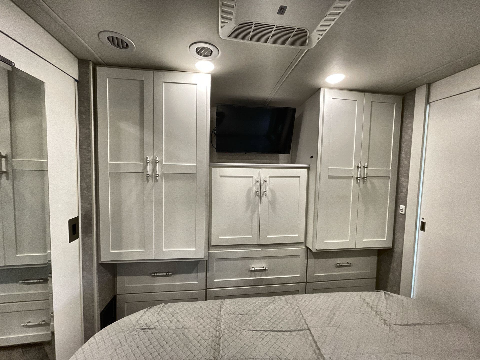 The Adventurer combines practical RV layout with high-end touches. Two slideouts open up the living space, creating an airy kitchen and lounge area that’s easy to navigate. The living room centers around a comfortable L-shaped sofa and a dinette, ideal for family meals or work on the road. A fireplace adds ambiance on cool evenings, while the residential refrigerator ensures ample storage for groceries on longer trips. A dedicated pantry keeps essentials organized, and the glass shower door adds a touch of luxury to the bathroom. With room for five sleepers, this motorhome is well-suited for couples who love weekend getaways or small families enjoying extended adventures.