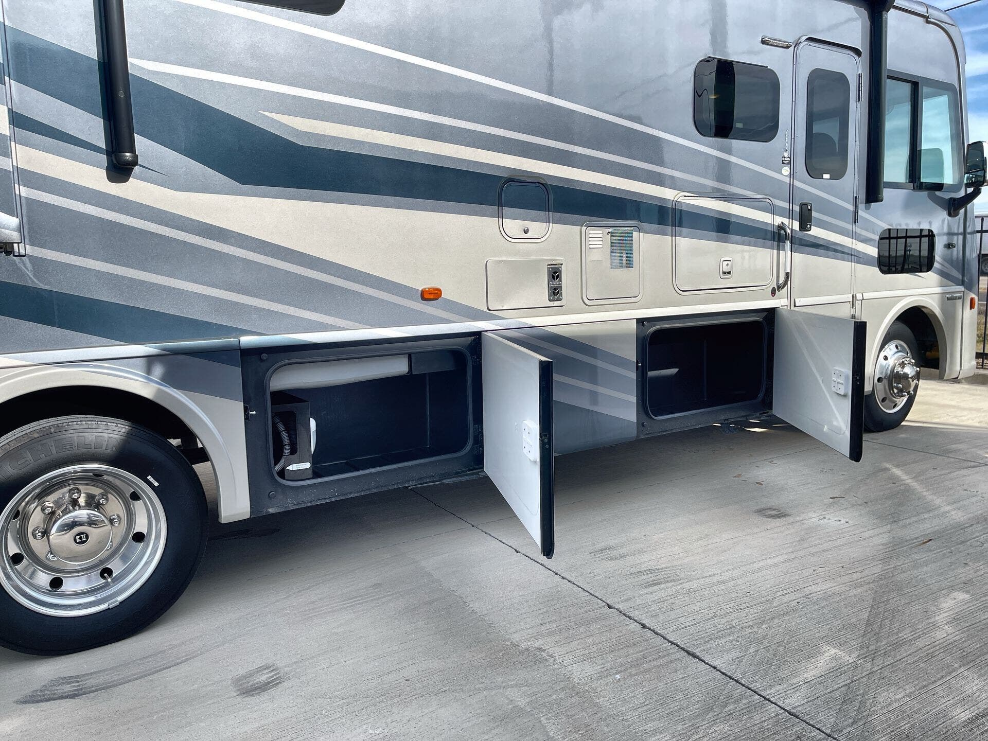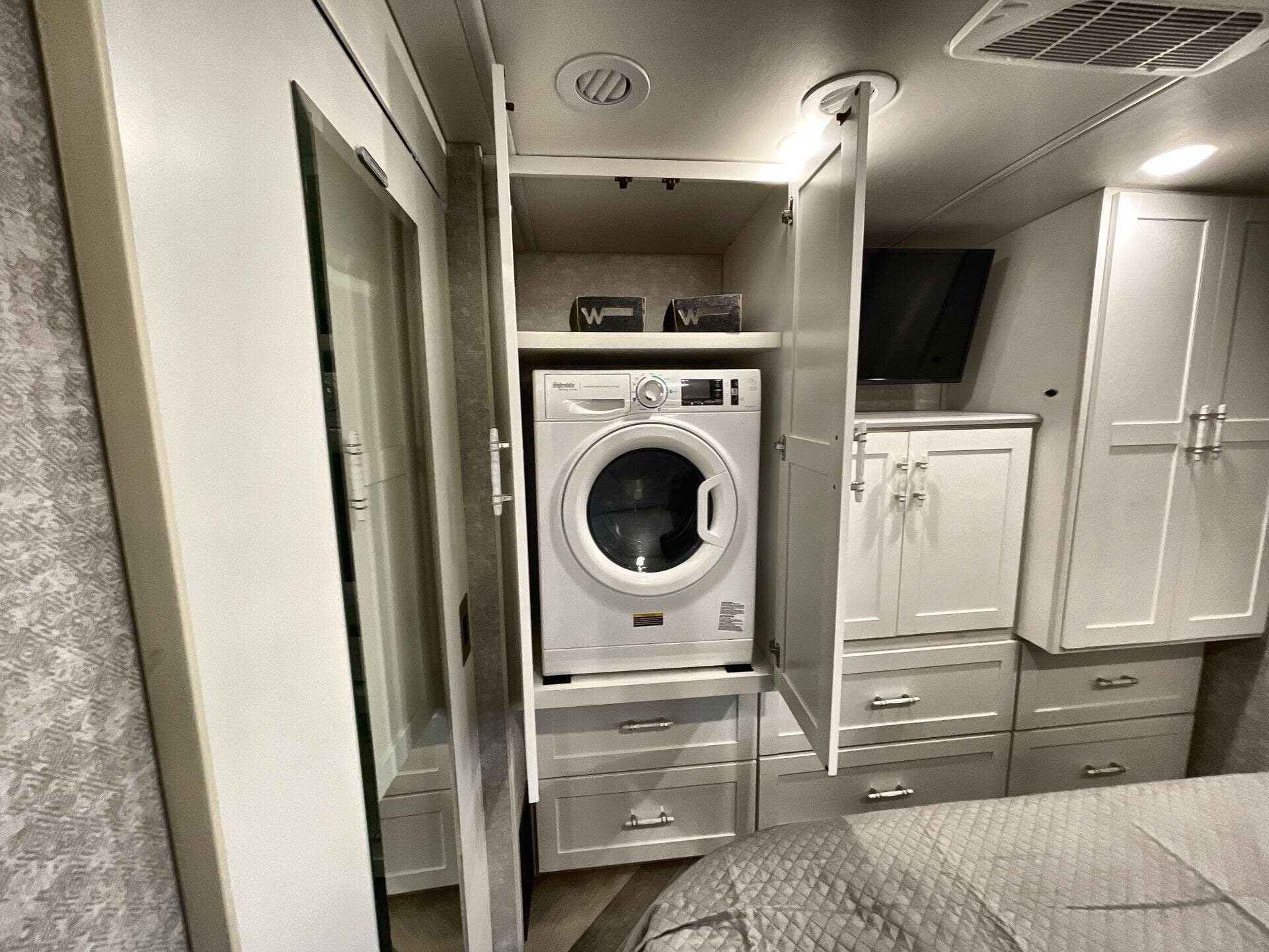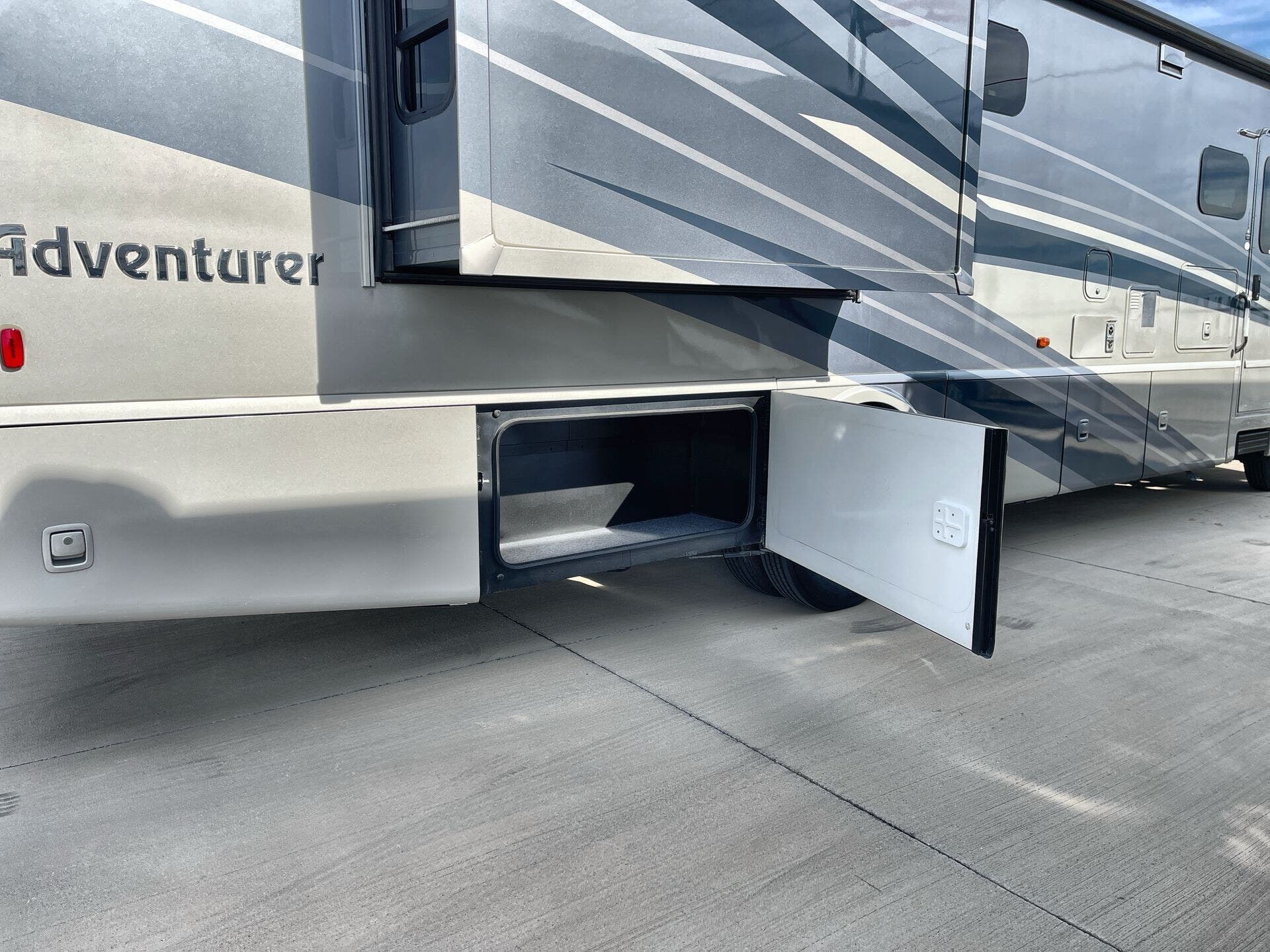 Designed for versatility, this Winnebago Adventurer features a comprehensive power package: batteries, battery charger, converter, inverter, generator, and solar panel. Two air conditioners with a heat pump ensure comfort in any season, while the water system supports long trips with generous fresh, grey, and black tank capacities. Washer and dryer prep adds convenience for travelers who prefer self-contained laundry options. The combination of reliable gas power, abundant storage, and modern appliances makes this motorhome a strong choice for road-ready travel.
