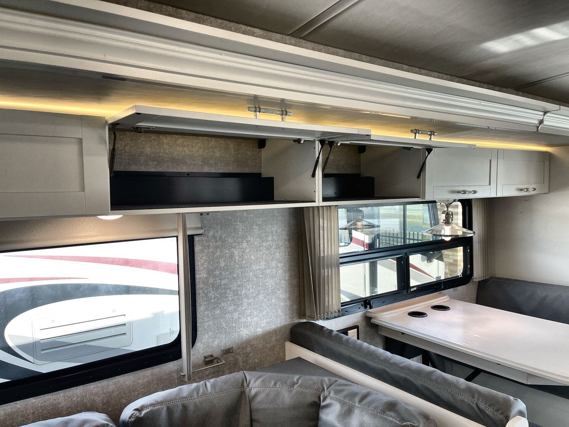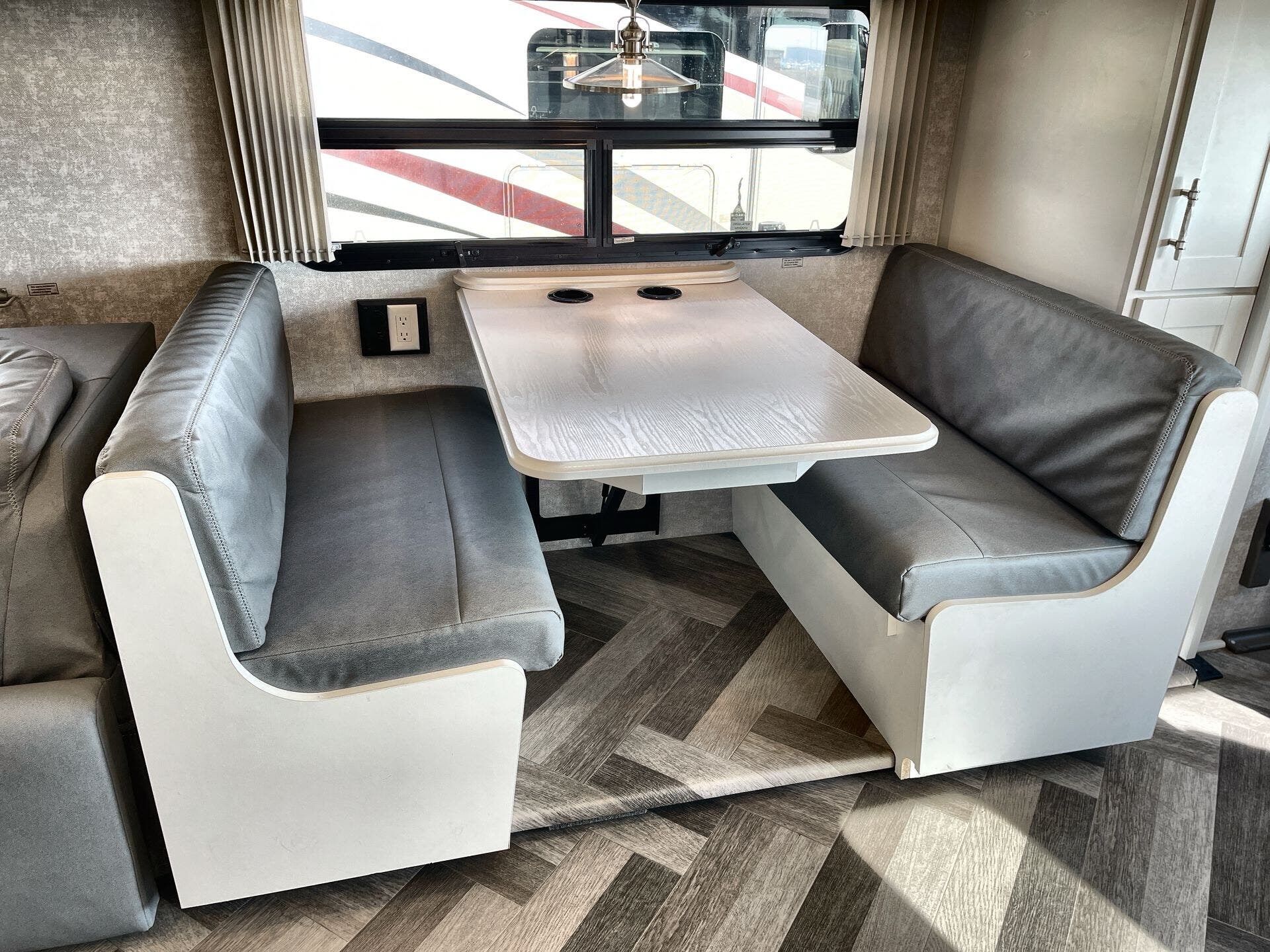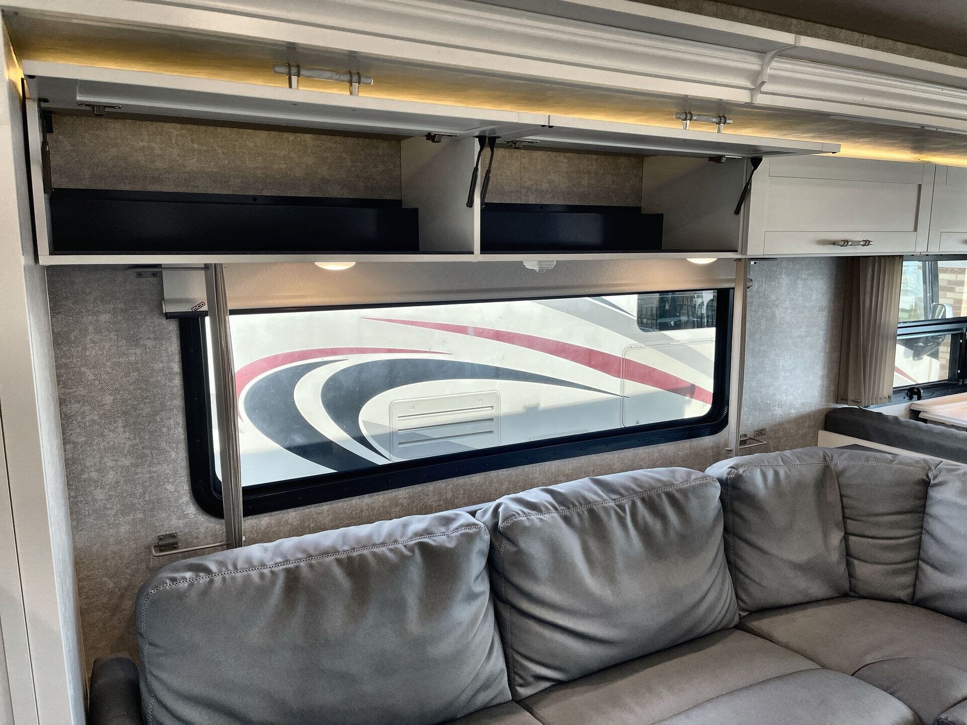 Designed for versatility, this Winnebago Adventurer features a comprehensive power package: batteries, battery charger, converter, inverter, generator, and solar panel. Two air conditioners with a heat pump ensure comfort in any season, while the water system supports long trips with generous fresh, grey, and black tank capacities. Washer and dryer prep adds convenience for travelers who prefer self-contained laundry options. The combination of reliable gas power, abundant storage, and modern appliances makes this motorhome a strong choice for road-ready travel.