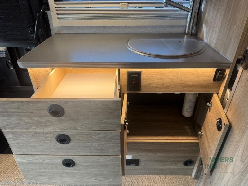 You will love the versatility found throughout this motorhome! Starting with the multifunctional lounge that can convert into four different modes. The flexible wet-dry bath has a pivoting lavatory wall, a 24" x 30" shower, an Oxygenics shower head to wash up, and even robe hooks to hang your towel afterwards. Keep your bellies full with delicious home cooked meals prepared in the versatile galley with the portable single burner induction range top, convection microwave oven, and 5.3 cu. ft. single door 12V refrigerator, plus a galley drawer/counter extension base. The heated gear garage has a L-track cargo tie down system with removable floor liner, 110V/12V charging ports and LED lighting to see clearly day or night!