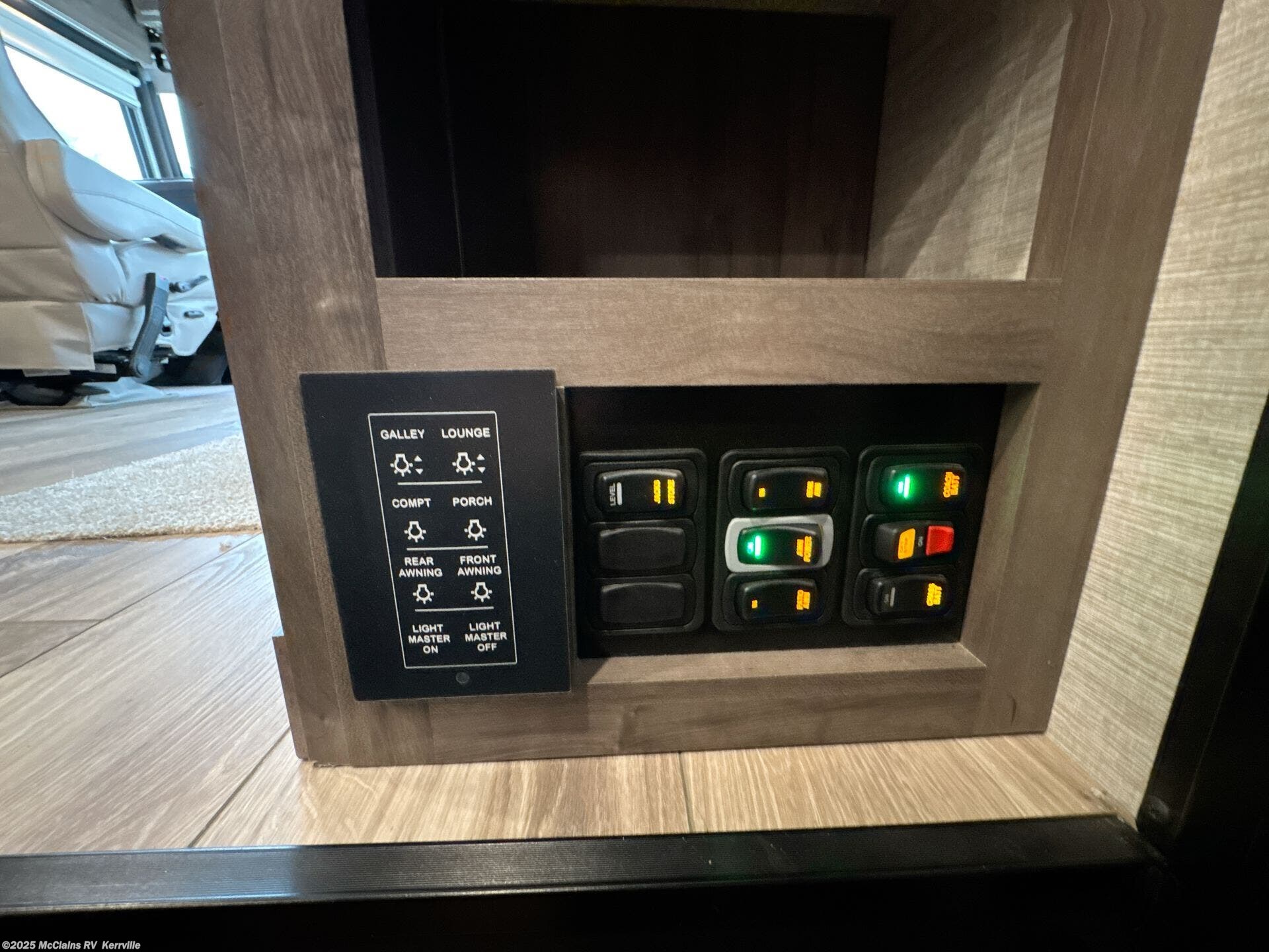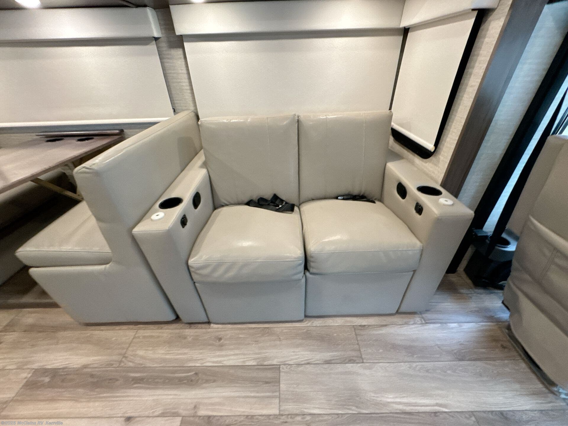 Enjoy your favorite entertainment on the road with a surround sound system, TV, DVD player, and CD player. Additional comfort features include theater seating, a king-size bed, a booth dinette, and a side-mounted rocking recliner. Practical features like leveling jacks, a power roof vent, skylight, and roof vents enhance comfort and usability. The RV also includes multiple safety devices, such as smoke and CO detectors, LP detector, fire extinguisher, and backup monitor for secure travel.