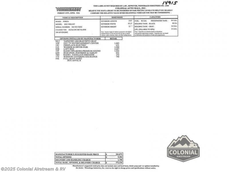 Request More Info on this 2025 Winnebago Forza 34T Offered for sale by Colonial Airstream & RV