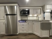 - Full kitchen setup with a microwave, refrigerator, and stove top burner