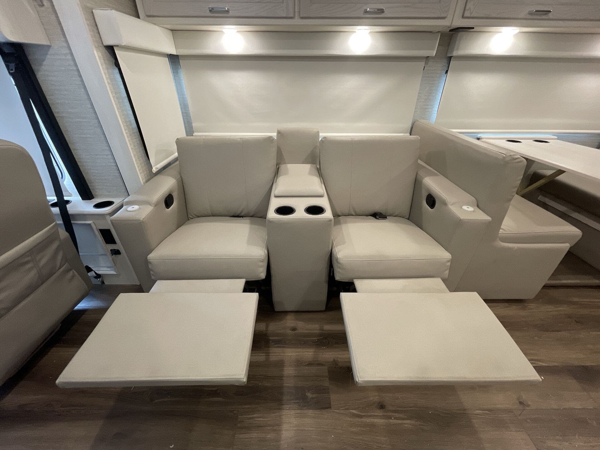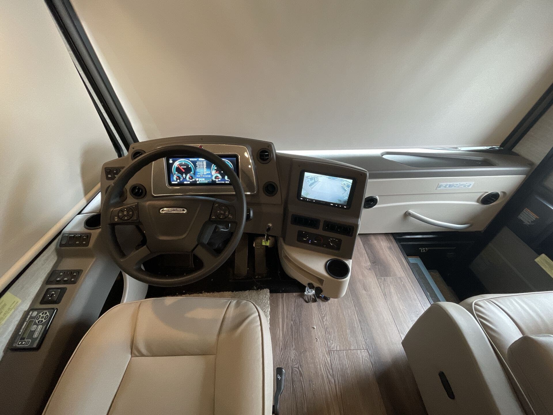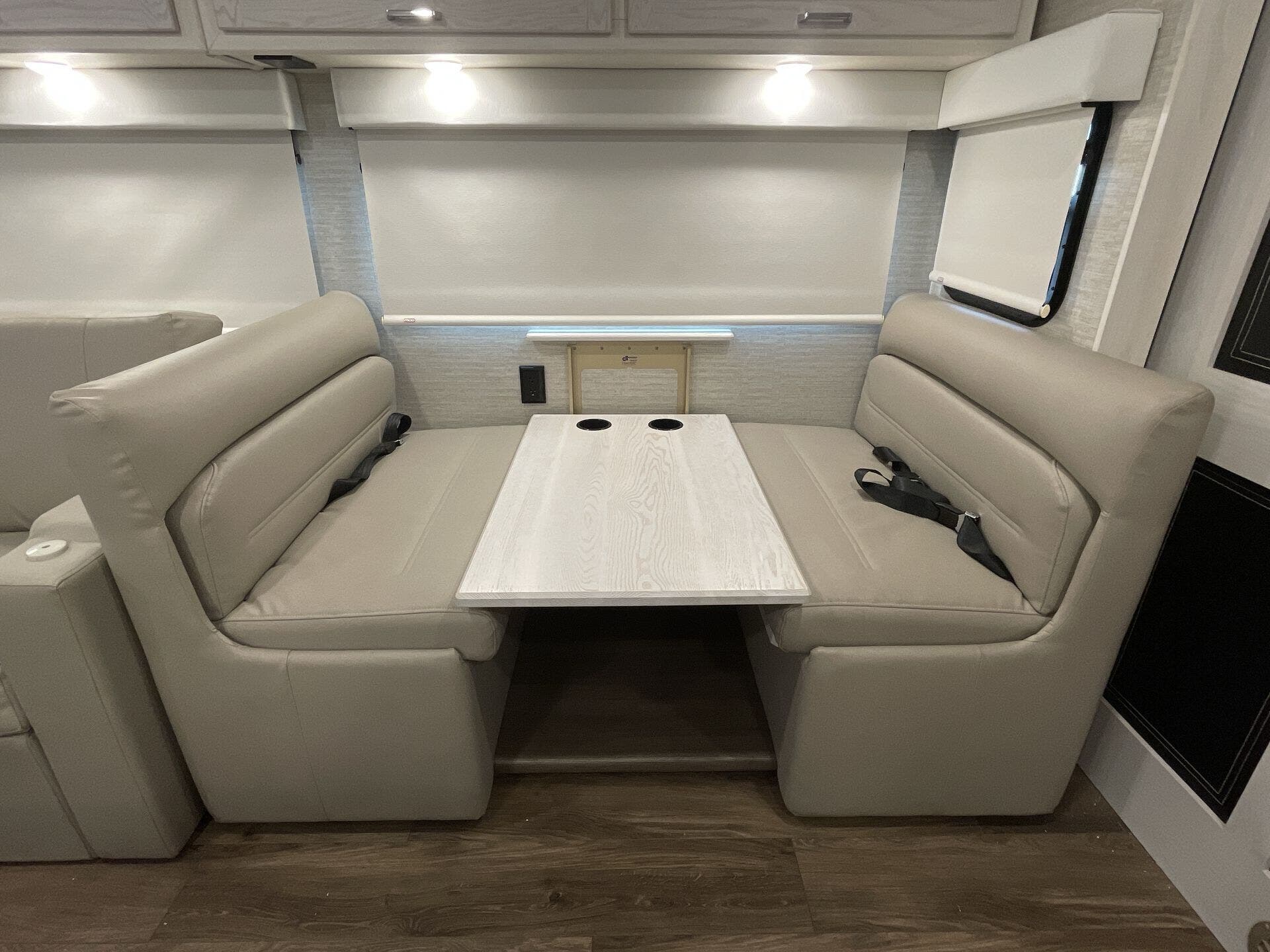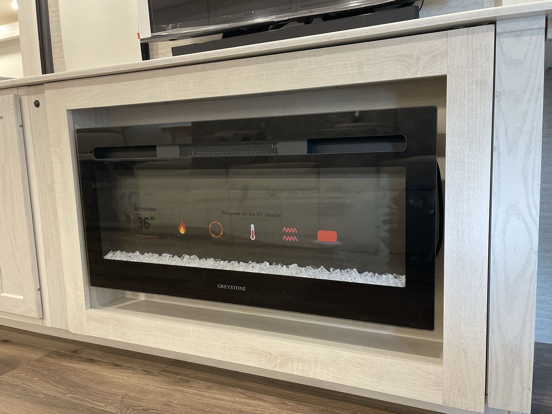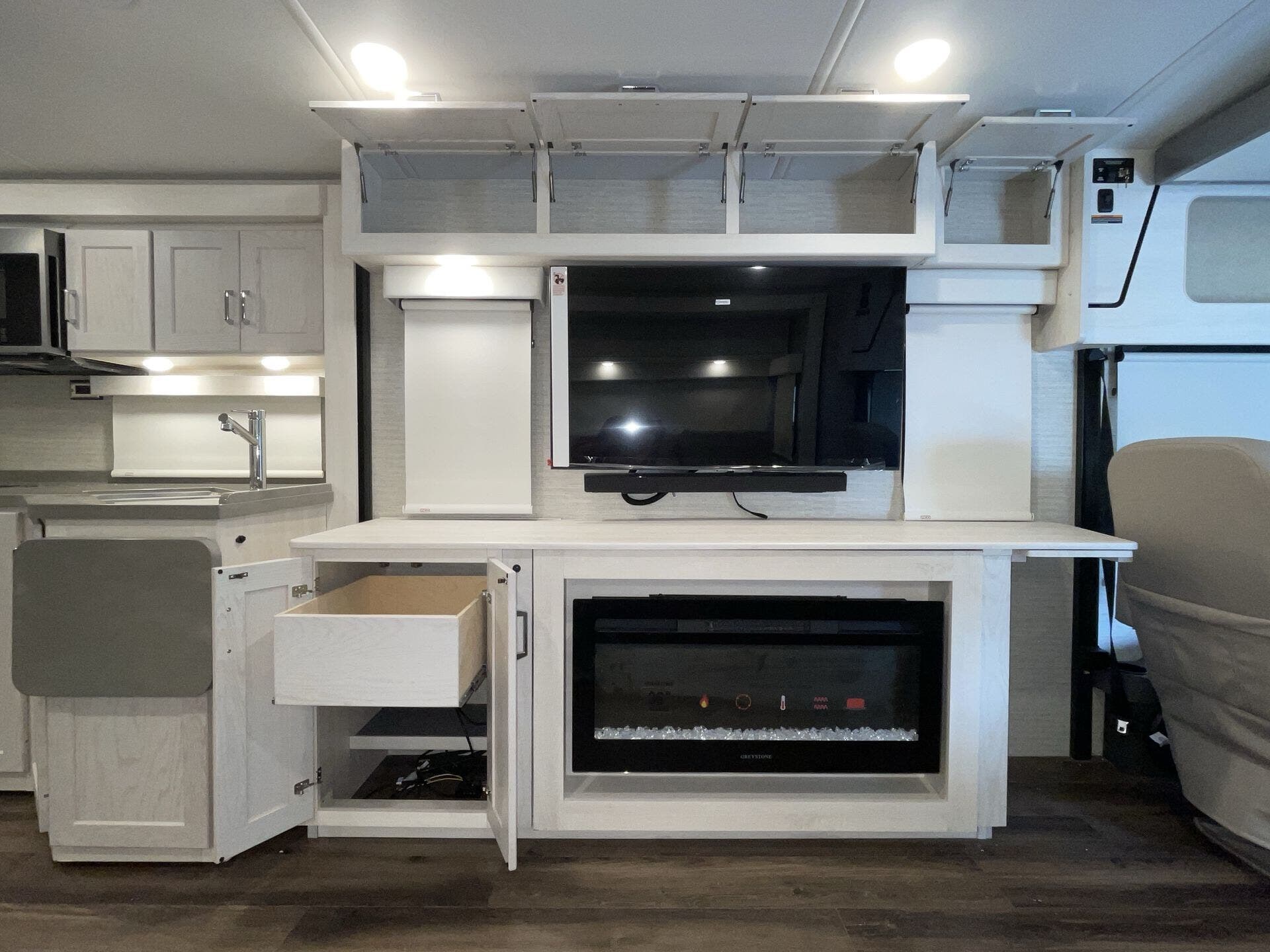 The Forza provides ample space with a length of approximately 38 feet 2 inches and a width of 8 feet 5 inches, accommodating up to 8 sleepers comfortably. Inside, you'll find an elegant interior featuring modern amenities such as a cozy Queen bed, booth dinette, fireplace, and spacious bathroom with a shower and toilet. The RV’s interior is designed for relaxation and convenience, with well-thought-out storage options like medicine cabinets and skylights for natural light.