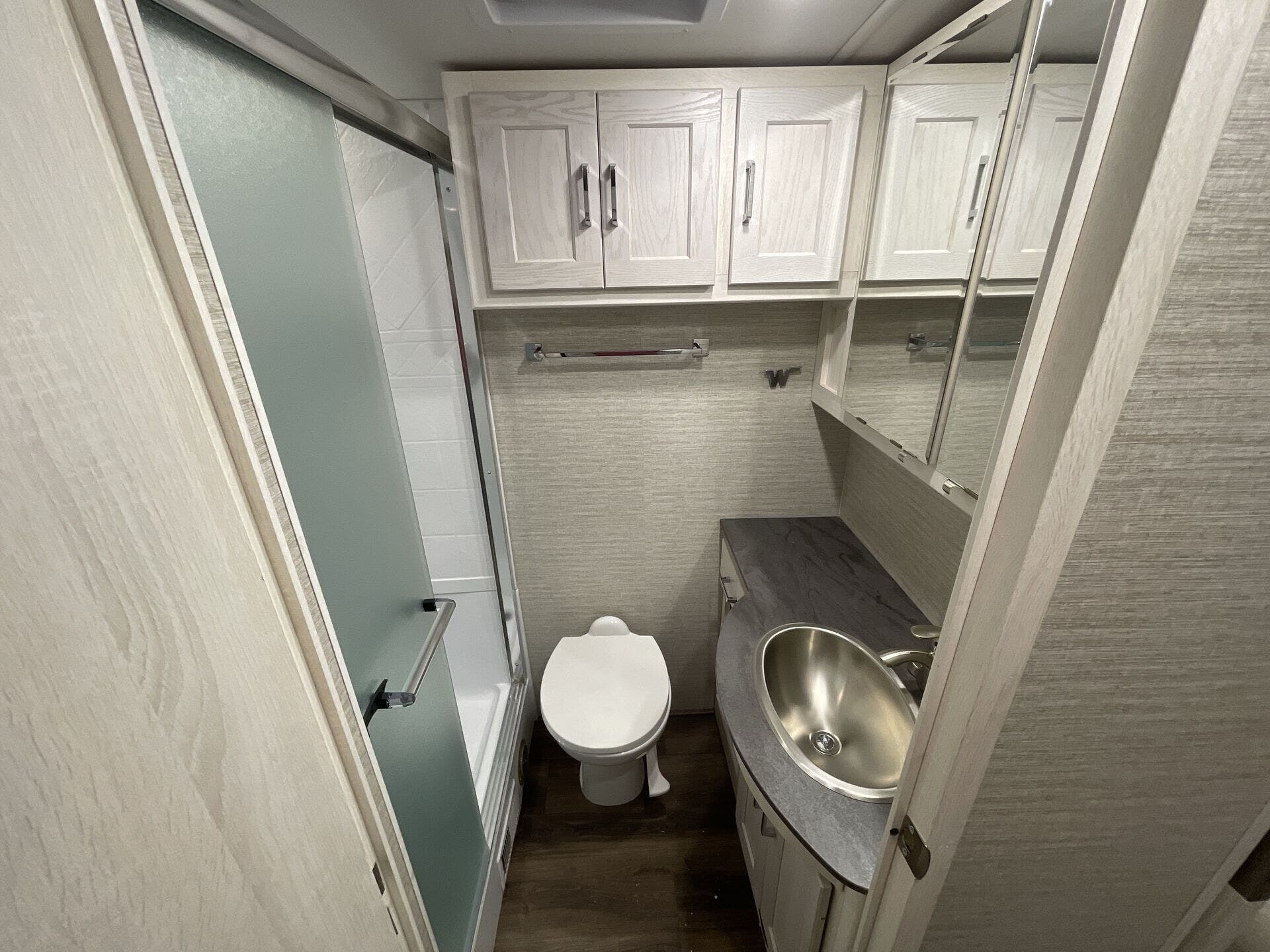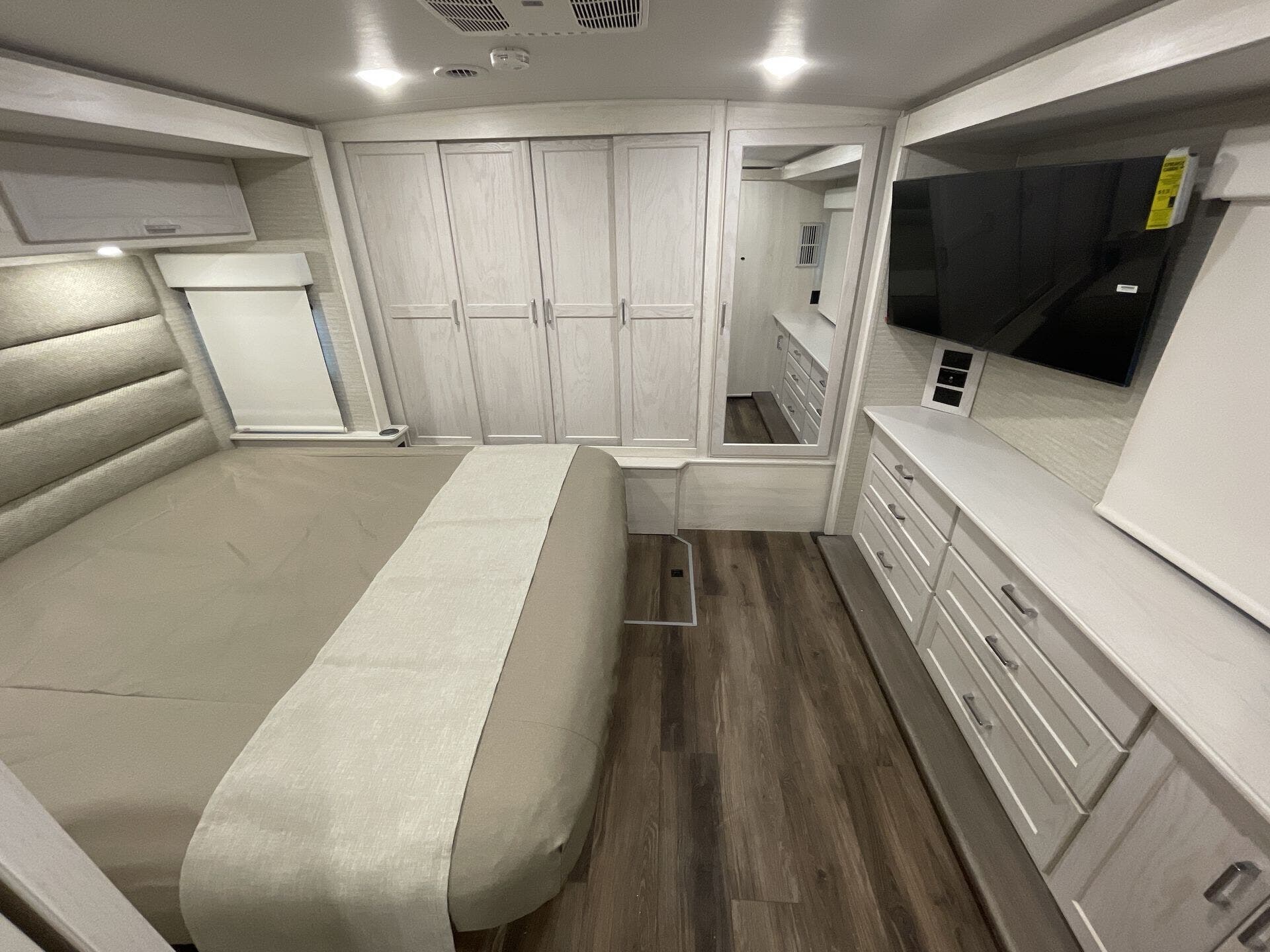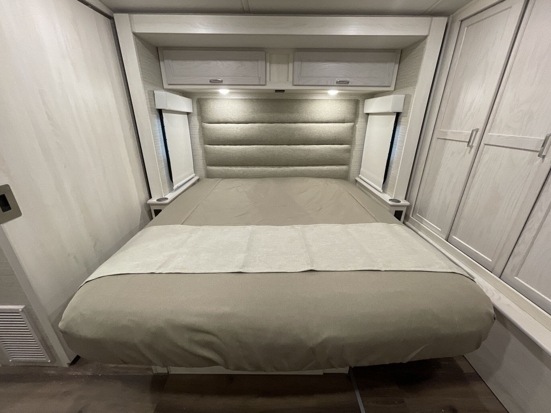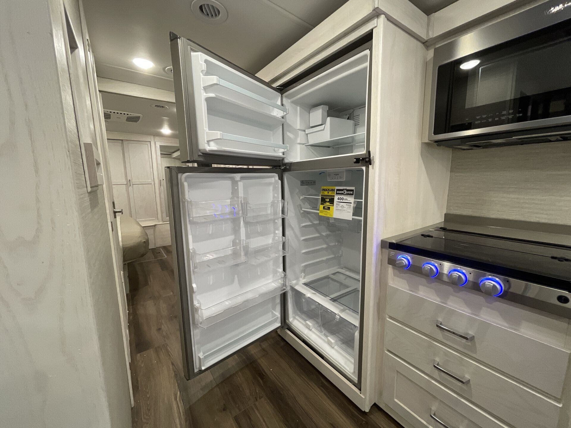 The Forza provides ample space with a length of approximately 38 feet 2 inches and a width of 8 feet 5 inches, accommodating up to 8 sleepers comfortably. Inside, you'll find an elegant interior featuring modern amenities such as a cozy Queen bed, booth dinette, fireplace, and spacious bathroom with a shower and toilet. The RV’s interior is designed for relaxation and convenience, with well-thought-out storage options like medicine cabinets and skylights for natural light.