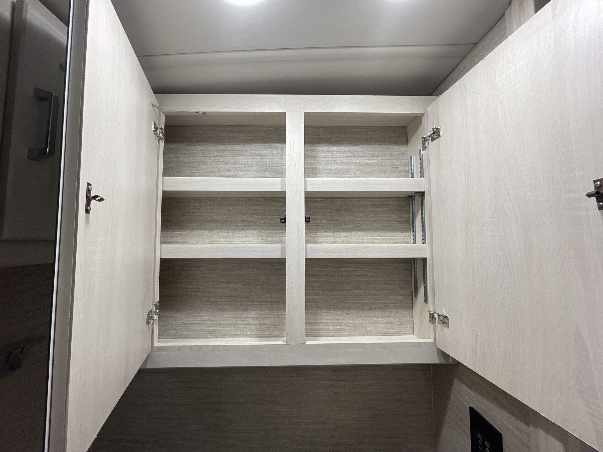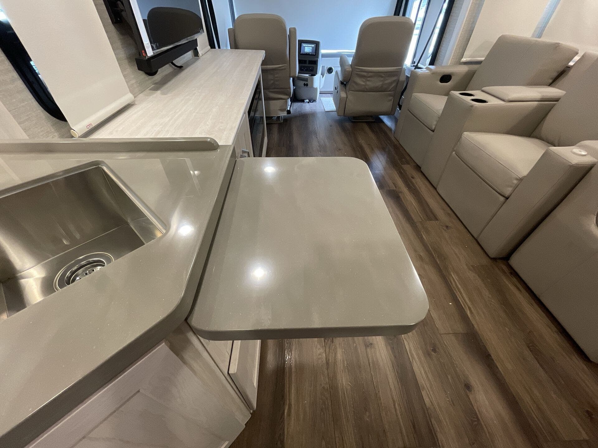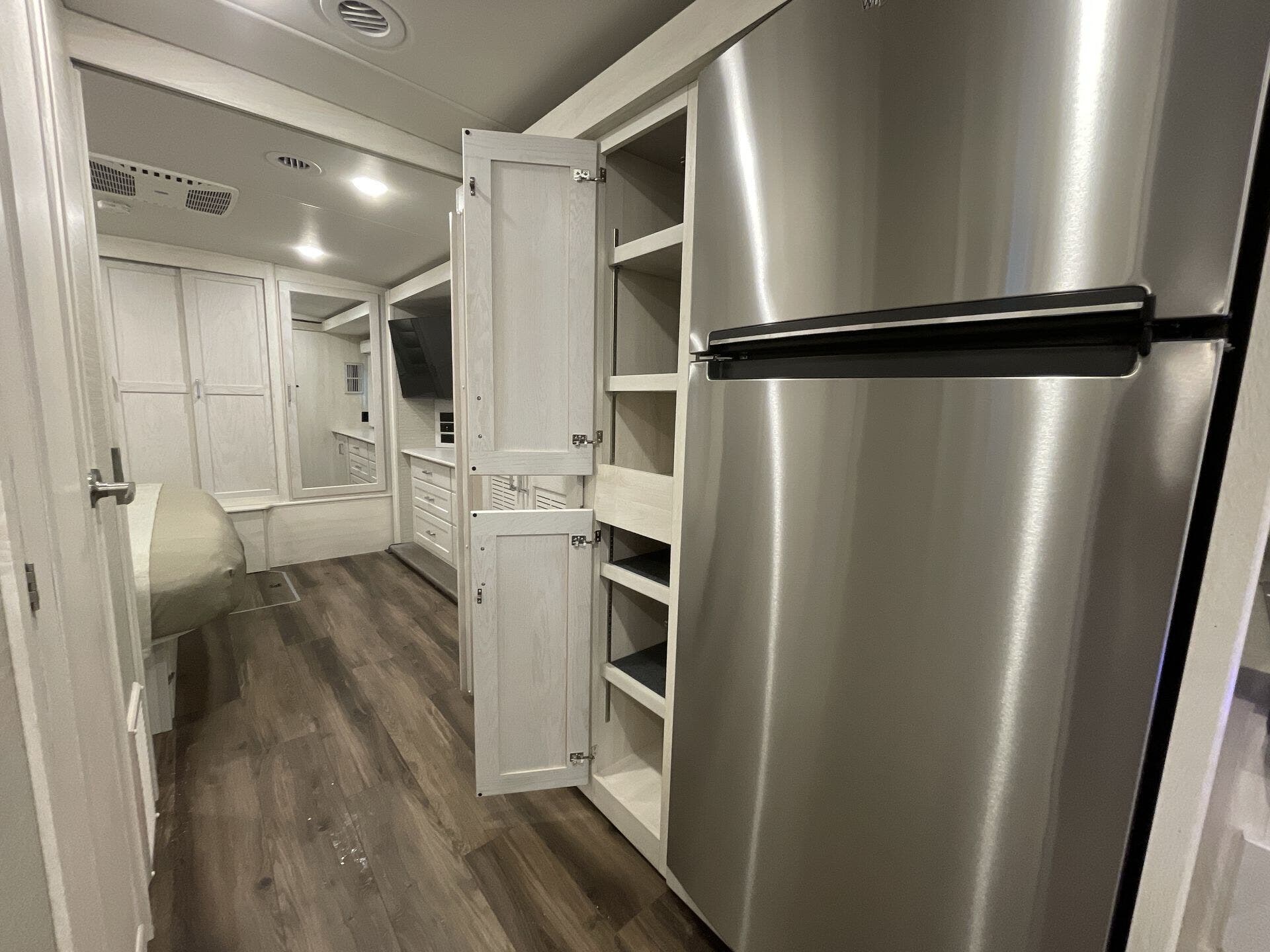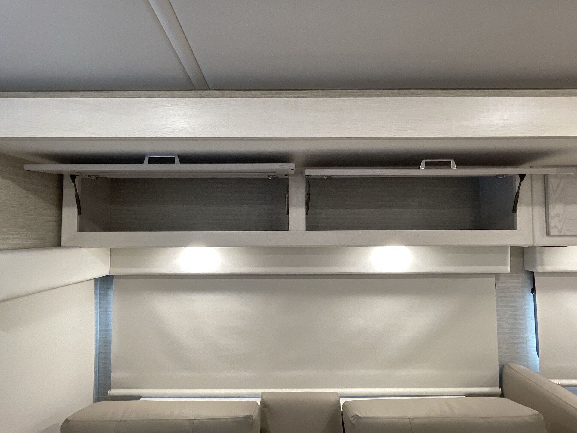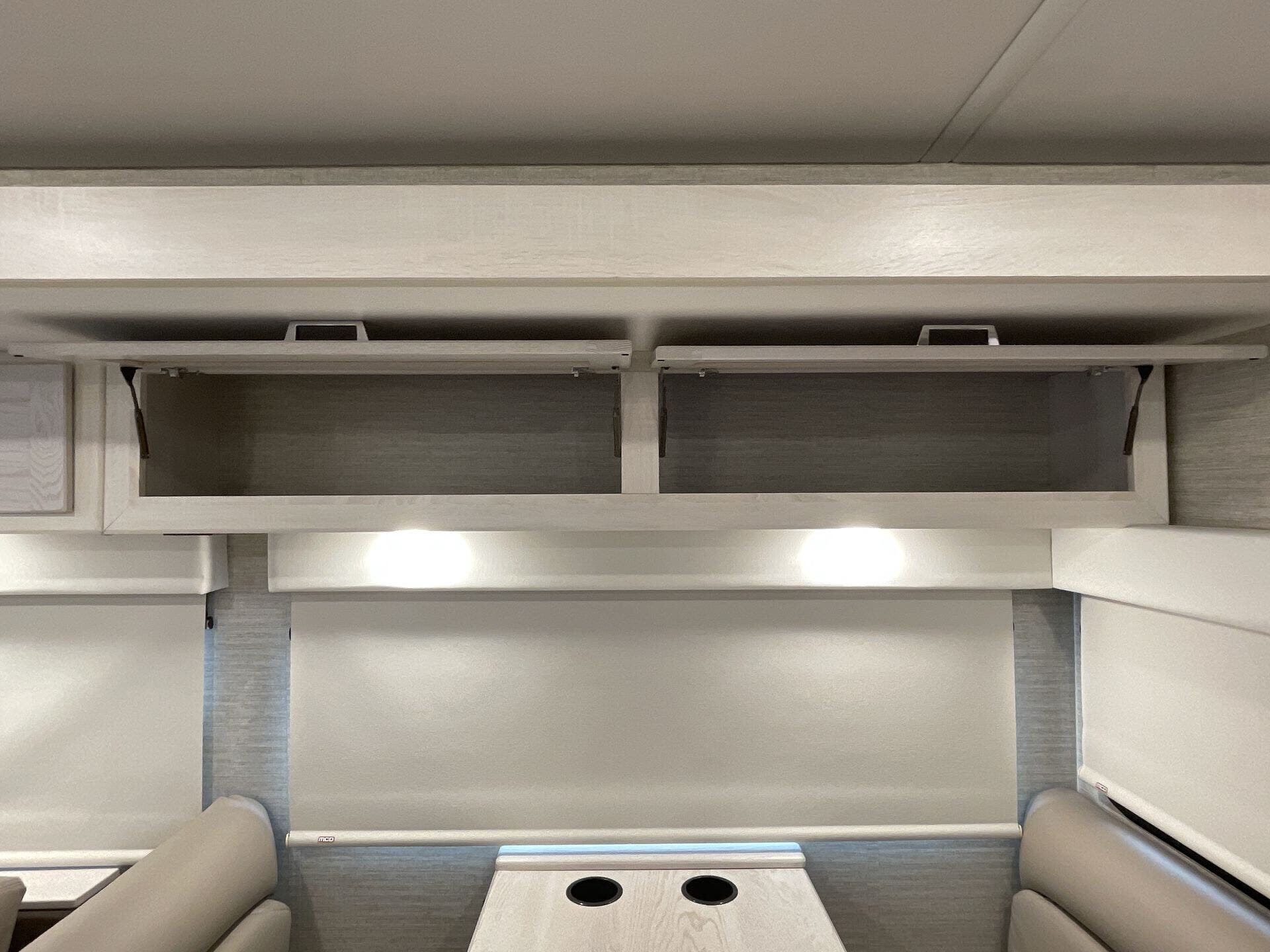 The Forza provides ample space with a length of approximately 38 feet 2 inches and a width of 8 feet 5 inches, accommodating up to 8 sleepers comfortably. Inside, you'll find an elegant interior featuring modern amenities such as a cozy Queen bed, booth dinette, fireplace, and spacious bathroom with a shower and toilet. The RV’s interior is designed for relaxation and convenience, with well-thought-out storage options like medicine cabinets and skylights for natural light.