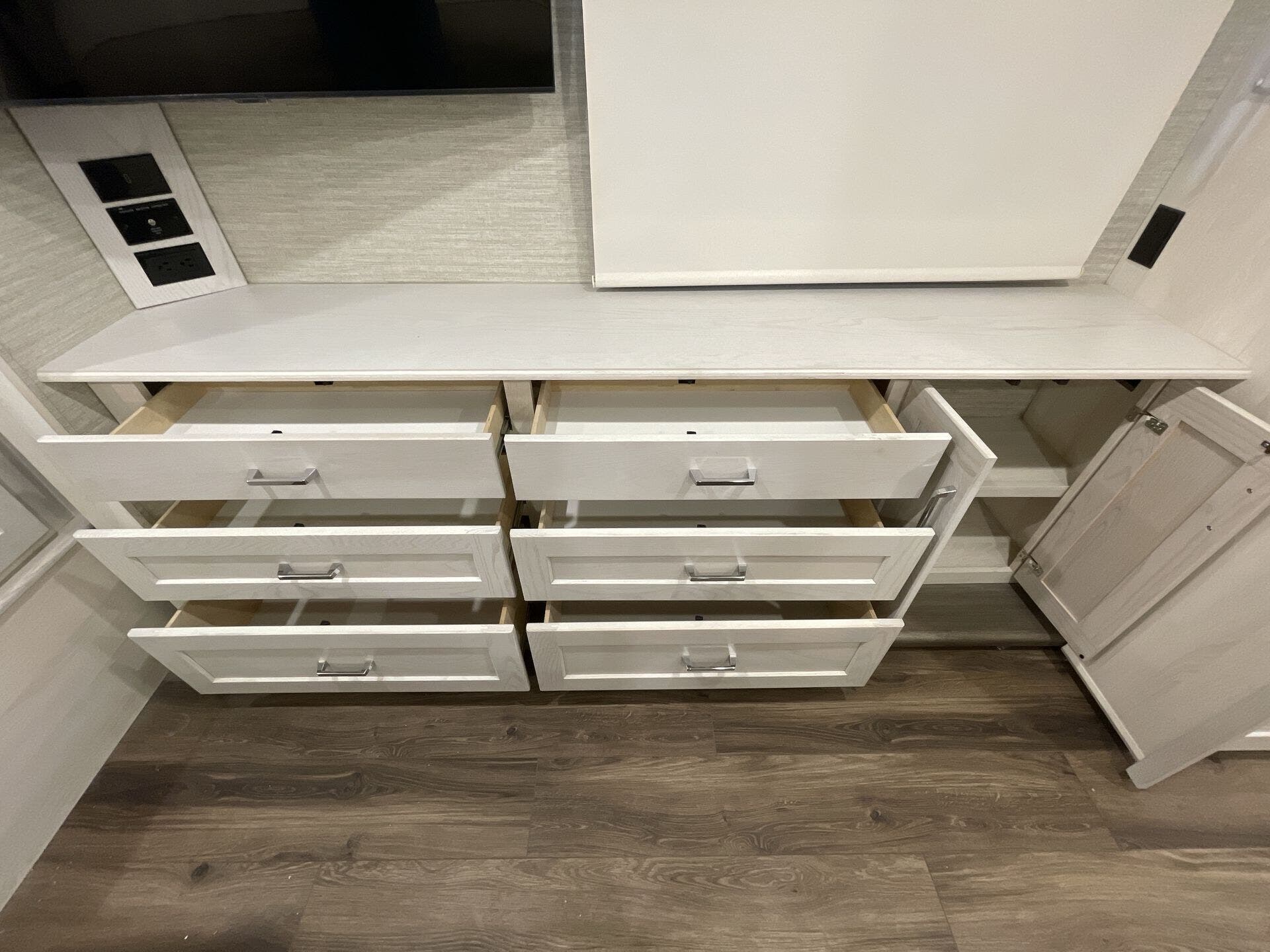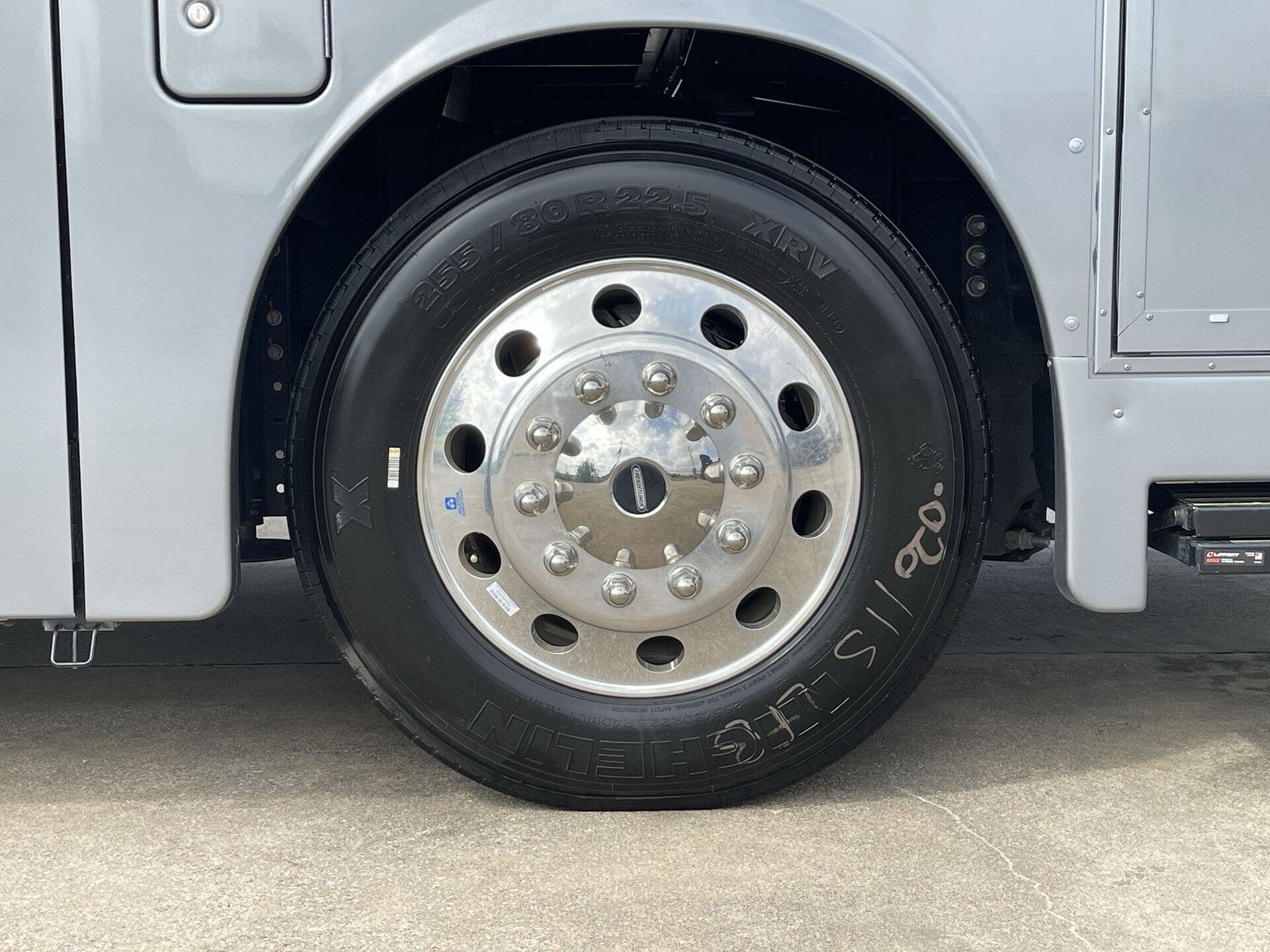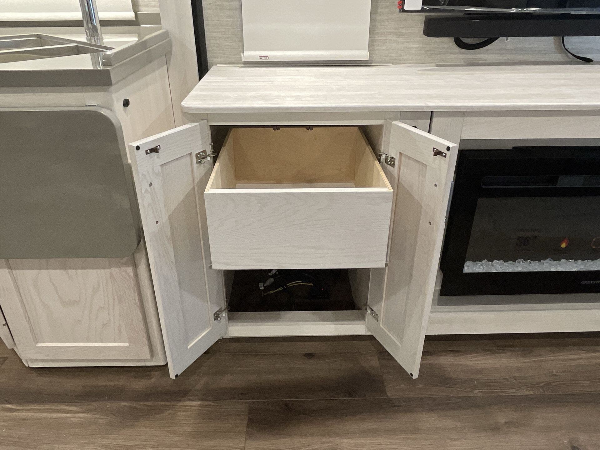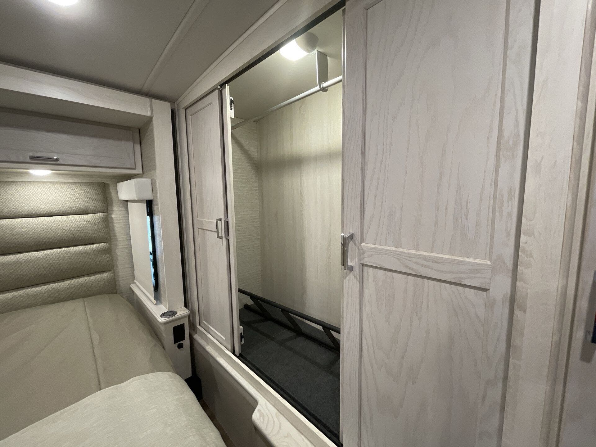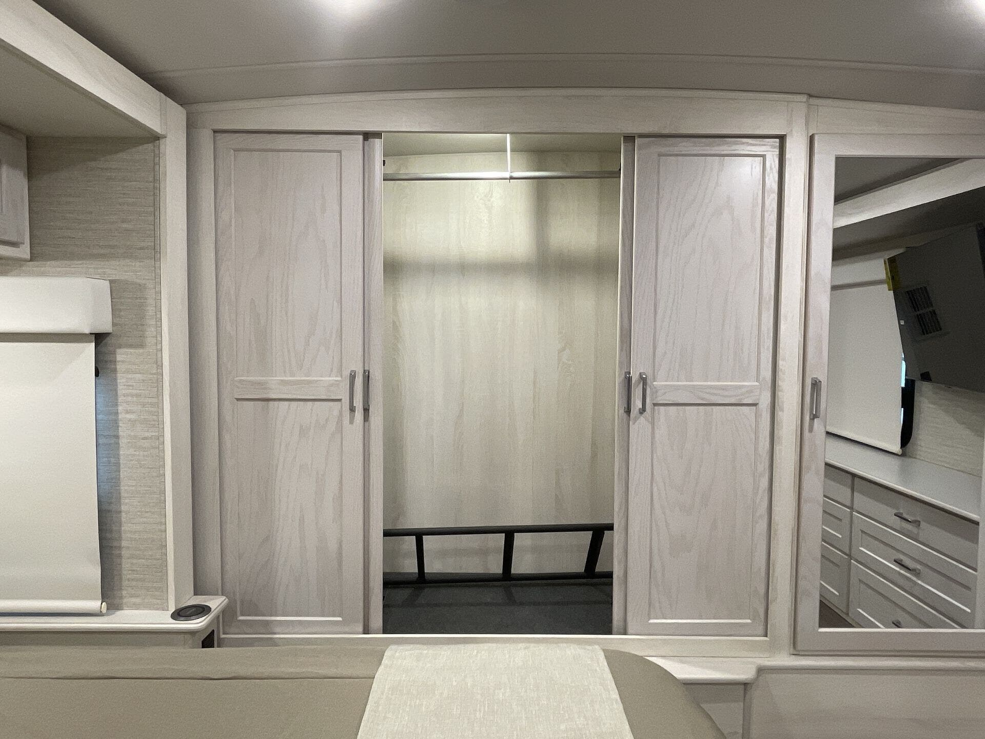 The Forza provides ample space with a length of approximately 38 feet 2 inches and a width of 8 feet 5 inches, accommodating up to 8 sleepers comfortably. Inside, you'll find an elegant interior featuring modern amenities such as a cozy Queen bed, booth dinette, fireplace, and spacious bathroom with a shower and toilet. The RV’s interior is designed for relaxation and convenience, with well-thought-out storage options like medicine cabinets and skylights for natural light.