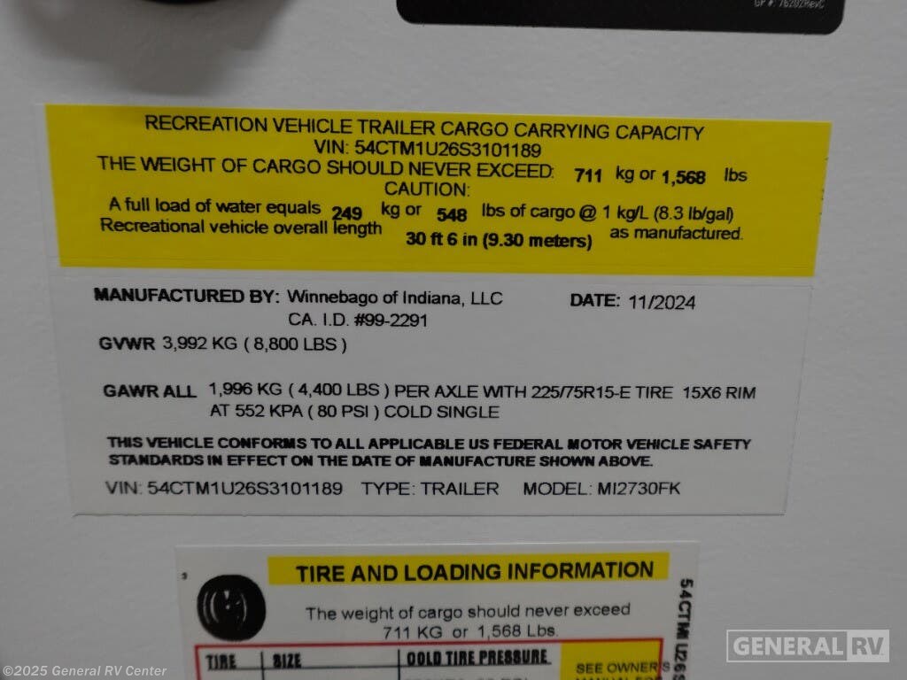 2025 Winnebago Minnie 2730FK Specifications