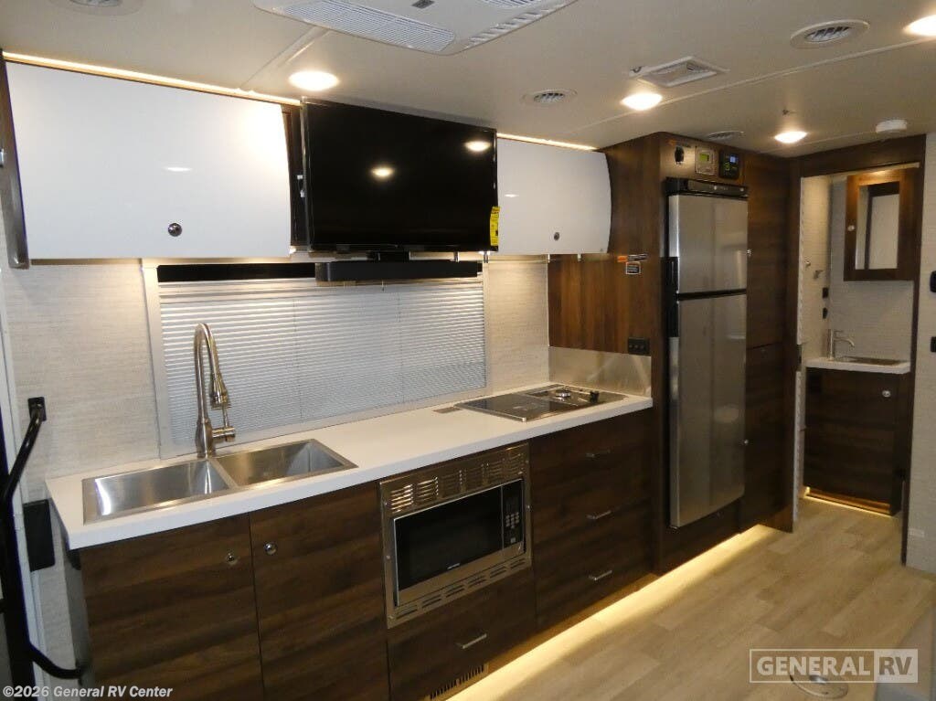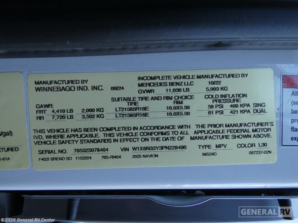 Experience the ultimate blend of luxury and functionality with the 2025 Winnebago Navion 24D. This compact yet spacious RV is designed on a robust Mercedes-Benz Sprinter 3500 chassis, powered by a reliable V6 diesel engine. With a length of 25.5 feet, it offers a smooth and efficient ride, perfect for both short getaways and extended adventures. The Navion 24D features a sleek and modern design, highlighted by a 16 ft. powered retractable awning, providing ample outdoor space to relax and enjoy the scenery. Inside, the Navion 24D is thoughtfully designed to maximize comfort and convenience. The innovative floorplan includes a front living area with a cozy U-shaped dinette and a versatile Murphy bed that transforms into a spacious sleeping area. The center kitchen is equipped with a full-size electric refrigerator and a two-burner cooktop, ideal for preparing delicious meals on the road. The rear bath offers privacy and convenience, with a shower enclosed in stylish plastic and glass. With a sleeping capacity for up to six people, this RV is perfect for family trips or gatherings with friends. For more details or to explore this model in person, visit your nearest General RV dealership.