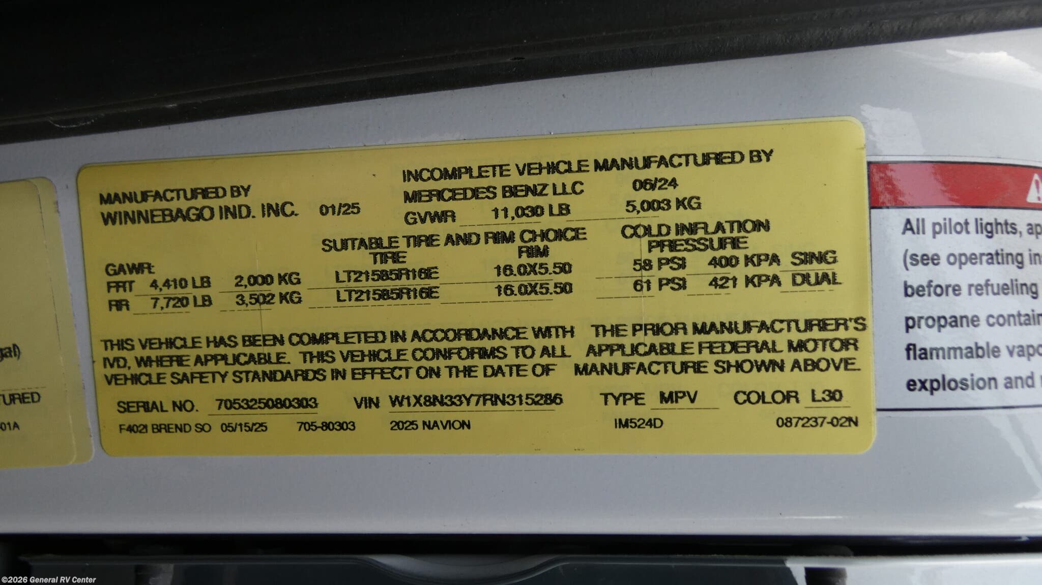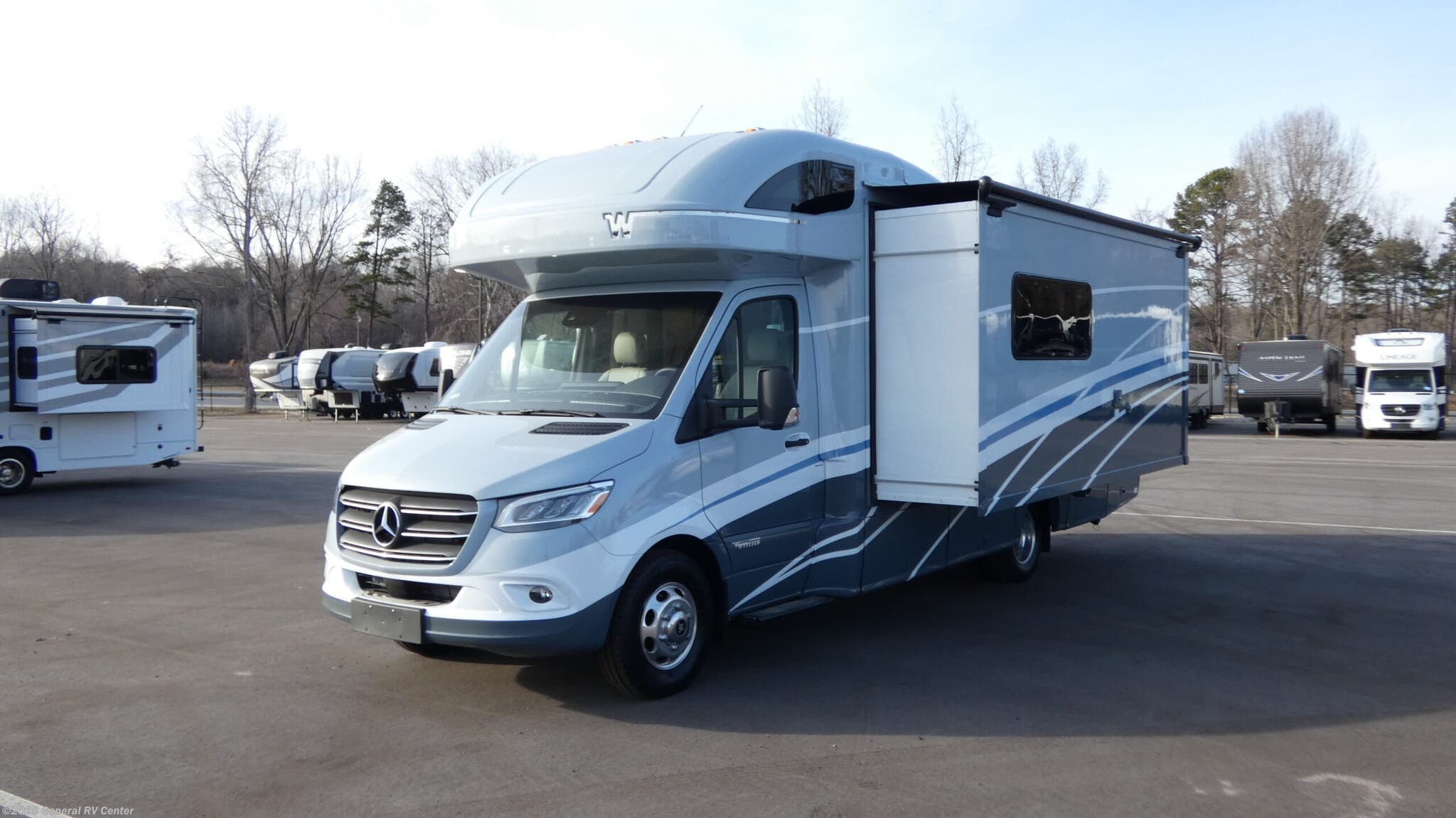 Experience the ultimate blend of luxury and functionality with the 2025 Winnebago Navion 24D. This compact yet spacious RV is designed on a robust Mercedes-Benz Sprinter 3500 chassis, powered by a reliable V6 diesel engine. With a length of 25.5 feet, it offers a smooth and efficient ride, perfect for both short getaways and extended adventures. The Navion 24D features a sleek and modern design, highlighted by a 16 ft. powered retractable awning, providing ample outdoor space to relax and enjoy the scenery. Inside, the Navion 24D is thoughtfully designed to maximize comfort and convenience. The innovative floorplan includes a front living area with a cozy U-shaped dinette and a versatile Murphy bed that transforms into a spacious sleeping area. The center kitchen is equipped with a full-size electric refrigerator and a two-burner cooktop, ideal for preparing delicious meals on the road. The rear bath offers privacy and convenience, with a shower enclosed in stylish plastic and glass. With a sleeping capacity for up to six people, this RV is perfect for family trips or gatherings with friends. For more details or to explore this model in person, visit your nearest General RV dealership.