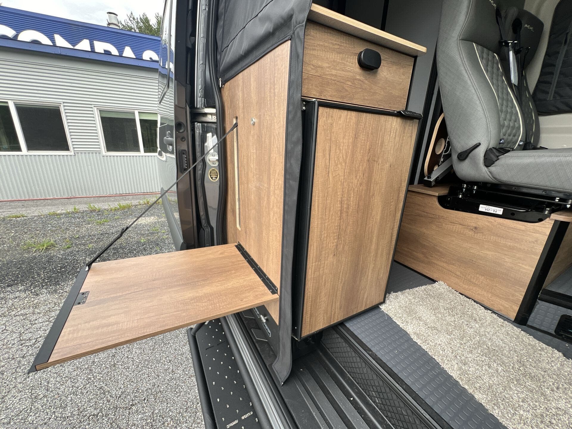 Looking for adventure yet not sure which road you'll take? This camper van offers the outdoor enthusiast a way to venture the unknown. Once at your destination, you can easily set up the interior including a power lift bed in the rear. The cab seats swivel around and there is a bench seat with adjustable table for easy dining opposite. There is even a fold-down outside table to dine outdoors if you want. You will find storage throughout including in the gear garage below the bed where you can store your hiking sticks and backpacks. The cook will have a portable single induction range top, a stainless steel sink, and a counter extension for more prep space plus a refrigerator below the counter. There is also a wet bath to stay clean and refreshed!