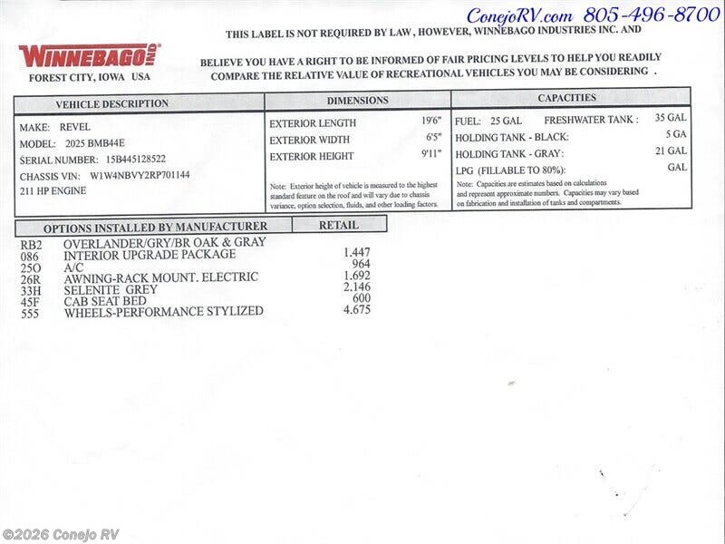 Request More Info on this 2025 Winnebago Revel 44E Offered for sale by Conejo RV