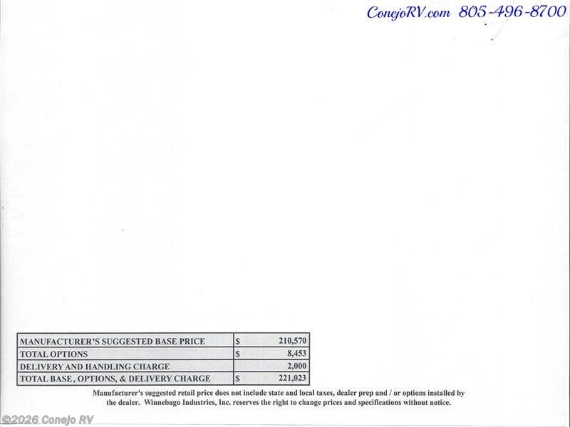 2025 Winnebago Revel Sport 44N AWD Sprinter Mercedes Turbo Diesel, 4.1kWh Lithionics Lithium System ***MSRP is $221,023, Our Discounted Price $149,990*** Built on a Fully Featured Mercedes-Benz® AWD Sprinter Chassis 2.0L High-Output, Turbo-Diesel 4-Cylinder, 9-Speed Automatic Transmission with Overdrive, Active Braking Assist, Active Lane Keeping Assist, Blind Spot Assist, Attention Assist (driver alert), Traffic Sign Assist, Adaptive Cruise Control, 4-Wheel ABS Brakes, 4.1 kWh Lithionics® Lithium-ion Battery w/Dedicated Second Alternator to Charge the System, Bluetooth Control and Pack Heating System, 2,000-Watt Inverter/Charger and 215-Watts of Solar, Rear Bedroom with Power Lift Bed Flex Bed System, Under Bed Storage Pockets, Under-Bed Storage with Removable Cargo Tie-Down Anchors, Flexible Showerhead, Wet Bath 31"x26", 2 Removable Shelves Convert to Wet Storage Cabinet, Swiveling Cassette Toilet, Stowable Single Burner Induction Stove Top, Larger 3.0 cu. ft. Compressor Driven Refrigerator/Freezer, Stowable Counter Top Extension, Pantry, Fold-Down Exterior Table, Pedestal Dinning Table With 3 Point Seat Belt, Tinted Dual-Pane Euro Acrylic Windows, Radio/Rearview Monitor System, MBUX® Touchscreen Multimedia Infotainment Center w/Navigation, Wi-Fi Hotspot, Intelligent Voice Control and Rear Camera, Cab Seats Slide/Swivel/Recline, Dual Airbags, Cruise Control, 12-volt Powerpoints, Trailer Hitch 5,000-lb. Drawbar/500-lb. Maximum Vertical Tongue Weight, Side Screen Door, Rear Screen Door, Powered Patio Awning With Bluetooth Controls, Running Boards with Ground Effect Lighting & Rocker Trim with Mud Guard, Rear Ladder, Luggage Rack, Hydronic Heating System, Roof Air Conditioner, TrueLevel™ Holding Tank Monitoring System, On-Demand Water Pump, Heated Gray Water Holding Tank, Insulated/Heated Fresh Water Tank, 360 Degree Camera, Cab Bed, Brand New & Just Arrived! ***MSRP is $221,023, Our Discounted Price $149,990*** ***Our Pricing is Inclusive of any Winnebago Customer Cash or Financing Promotions***We have some fantastic financing and take trades also! It is our #1 goal that your experience with our company is an enjoyable one with our staff of industry professionals, Conejo Wholesale Auto & RV, Exclusive Ventura County Dealer For Winnebago Navion, Revel, Solis, Ekko, and Travato, All Storyteller Products, Outside Van Syncline and Approach, Tiffin GH1, All Roadtrek Products, We Also Carry Some Quality Pre-Owned Motorhomes which come with Our 45 Day/1000 Mile In-House Warranty at No Charge, Conejo RV, 661 E. Thousand Oaks Blvd, Thousand Oaks, CA 91360, 805-496-8700, Open 7 Days, 9am to 6pm, All Coaches Fully Inspected, Serviced and Detailed, Come Experience the No Pressure No Haggle Sales Approach at Conejo RV, We Also Buy Clean Late Model Coaches, 1 Year Free Camping Membership Included Ask For Details! (***plus tax & license fees***)