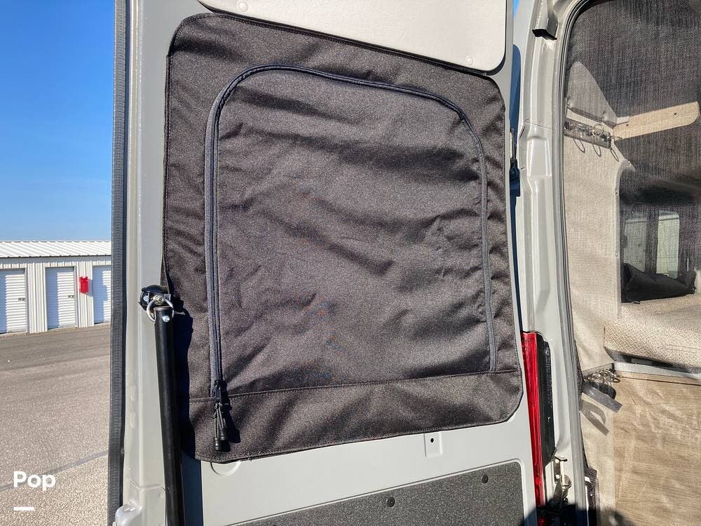 The front windshield and side windows have removable, insulated blackout covers.