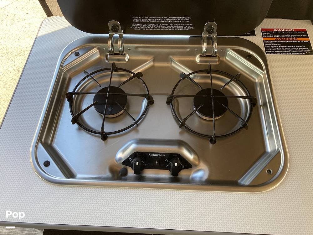 The kitchen has a mini refrigerator, a 2-burner gas stove top with cover, a 25 lb. liquid propane tank, and a 2.6-gallon water heater.