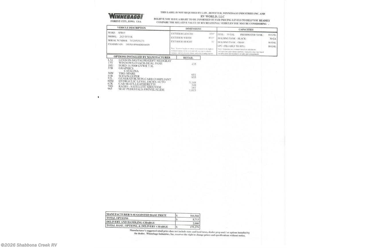 Request More Info on this 2025 Winnebago Spirit 31K * Offered for sale by Shabbona Creek RV