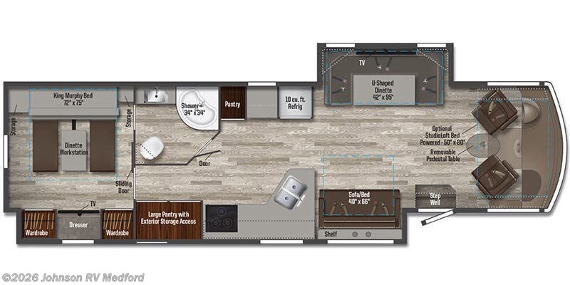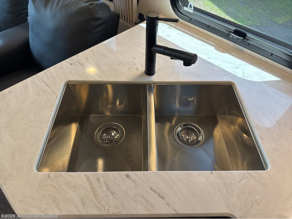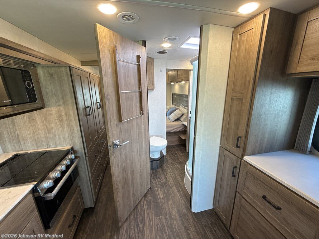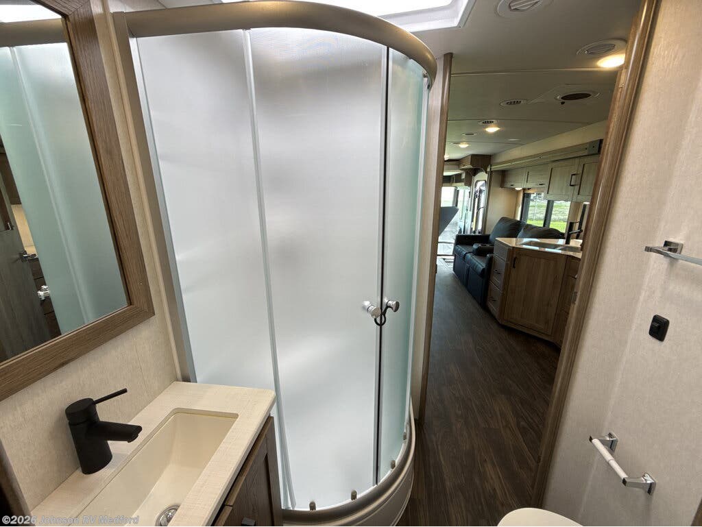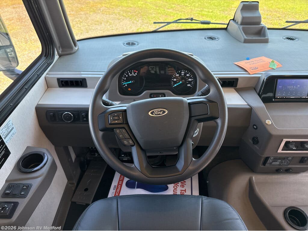 Features Include: 210-Amp Alternator, Hydraulic Brakes ABS, Swivel Cab Seats, Awning LED Lights, Auto Entry Steps, LED Interior Lights, Sofa Bed 40x66 (vbm), Pantry, Stainless Steel Sink, 12v Refrigerator, Auto Leveling System, Entertainment System, Overbed Storage, Reading Lights, King Bed 72x75, Nightstands, Wardrobes, Storage Under Bed, TV Prep Bathroom, Medicine Cabinet, Vanity Sink, Linen Storage, Skylight, Shower, Toilet, Solar Panel Prep, 76# LP Capacity, 30-Amp Service, 1000w Inverter, Low-Profile Furnace, Heated Tanks, Aluminum Framework, Fiberglass Roof, High-Gloss Sidewalls