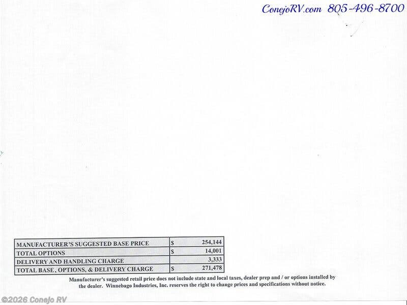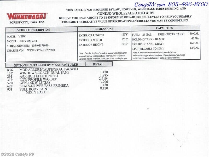 2025 Winnebago View 24T Slide-Out Murphy Bed Mercedes Turbo Diesel Full Body Paint 8K Miles *** Our Price is Only $147,990*** Mercedes-Benz® Sprinter Chassis, 2.0L High-Output, Turbo-Diesel 4-Cylinder Engine, 9-Speed Automatic Transmission W/Overdrive, 250-Amp Alternator, Adaptive ESP Technology, Hydraulic Brakes W/ABS, 4.0KW Onan LP/Gas Generator, Driver and Passenger Side & Curtain Airbags, 2000 Watt Inverter, 15k BTU Ducted Roof Air with Heat Pump, 25,000 BTU Low-Profile Ducted Furnace, Expandable (2) 120-watt Flexible Surface Solar Panel/Battery Charger Controller, Driver Side Slide with Power Reclining Theater Seats That Covert Into Queen Size Murphy Bed with Euro-Suspension System & Gel Topper, Passenger Side Pop Up Dinette, Adjustable Living Room 32” HD Led Flat screen TV With JBL Soundbar, Private Full Bath with Toilet and Full Shower, Wardrobe, Stainless Steel 2 Door Fridge, Nice Kitchen With 1 True Induction Cooktop & 1 Burner Stovetop, Large Basin Stainless Sink, Solid Surface Like Counter Tops with Matching Sink Covers, Pop Up Counter Top Extension, Pull Out Pantry, Convection Microwave Oven, LED Accent Lighting, Front Overhead Cabinets, Ultra-Leather Swivel/Recline Captain’s Chairs that Rotate to Function as Coach Seating with Adjustable Lumbar Support, 10” Touchscreen Infotainment Center With Voice Recognition, WI-FI Hotspot, USB Connections, Apple CarPlay and Android Auto, & Advanced GPS Navigation, Large Power Patio Awning with Integrated LED Lighting, Full Basement Storage, Hydraulic Levelers, Outside Shower, Tankless Water Heater, Heated Holding Tanks, Tow Package, Key less Entry, Chrome Alloy Wheels, High Gloss Full Body Paint, Other Models Available and More Arriving Soon, Custom Orders Available, *** Our Price is Only $147,990*** We have some fantastic financing and take trades also! It is our #1 goal that your experience with our company is an enjoyable one with our staff of industry professionals, Conejo Wholesale Auto & RV, Exclusive Ventura County Dealer For Winnebago Navion, Revel, Solis, Ekko, and Travato, All Storyteller Products, Outside Van Syncline and Approach, Tiffin GH1, All Roadtrek Products, We Also Carry Some Quality Pre-Owned Motorhomes which come with Our 45 Day/1000 Mile In-House Warranty at No Charge, Conejo RV, 661 E. Thousand Oaks Blvd, Thousand Oaks, CA 91360, 805-496-8700, Open 7 Days, 9am to 6pm, All Coaches Fully Inspected, Serviced and Detailed, Come Experience the No Pressure No Haggle Sales Approach at Conejo RV, We Also Buy Clean Late Model Coaches, 1 Year Free Camping Membership Included Ask For Details! (***plus tax & license fees***)