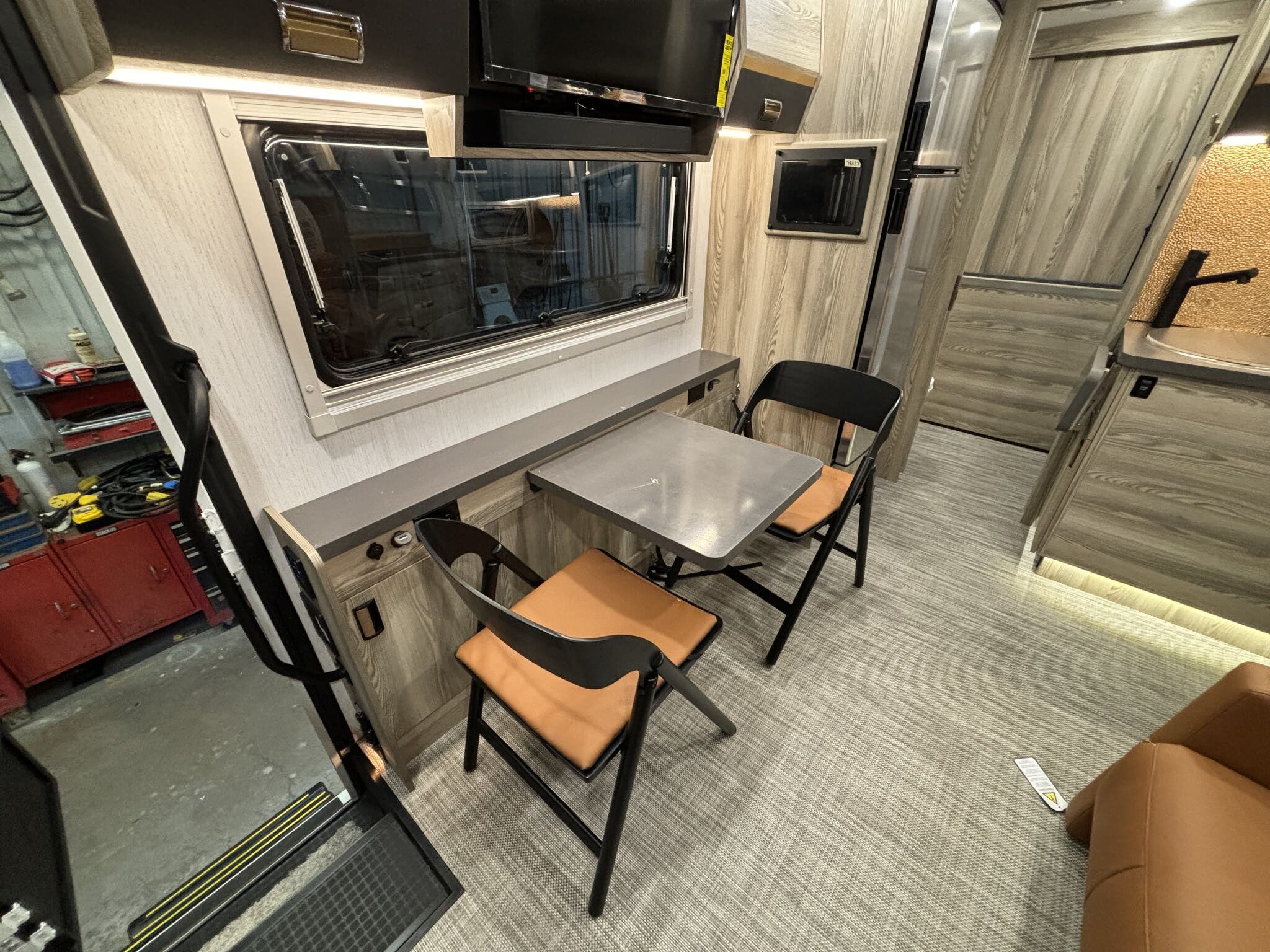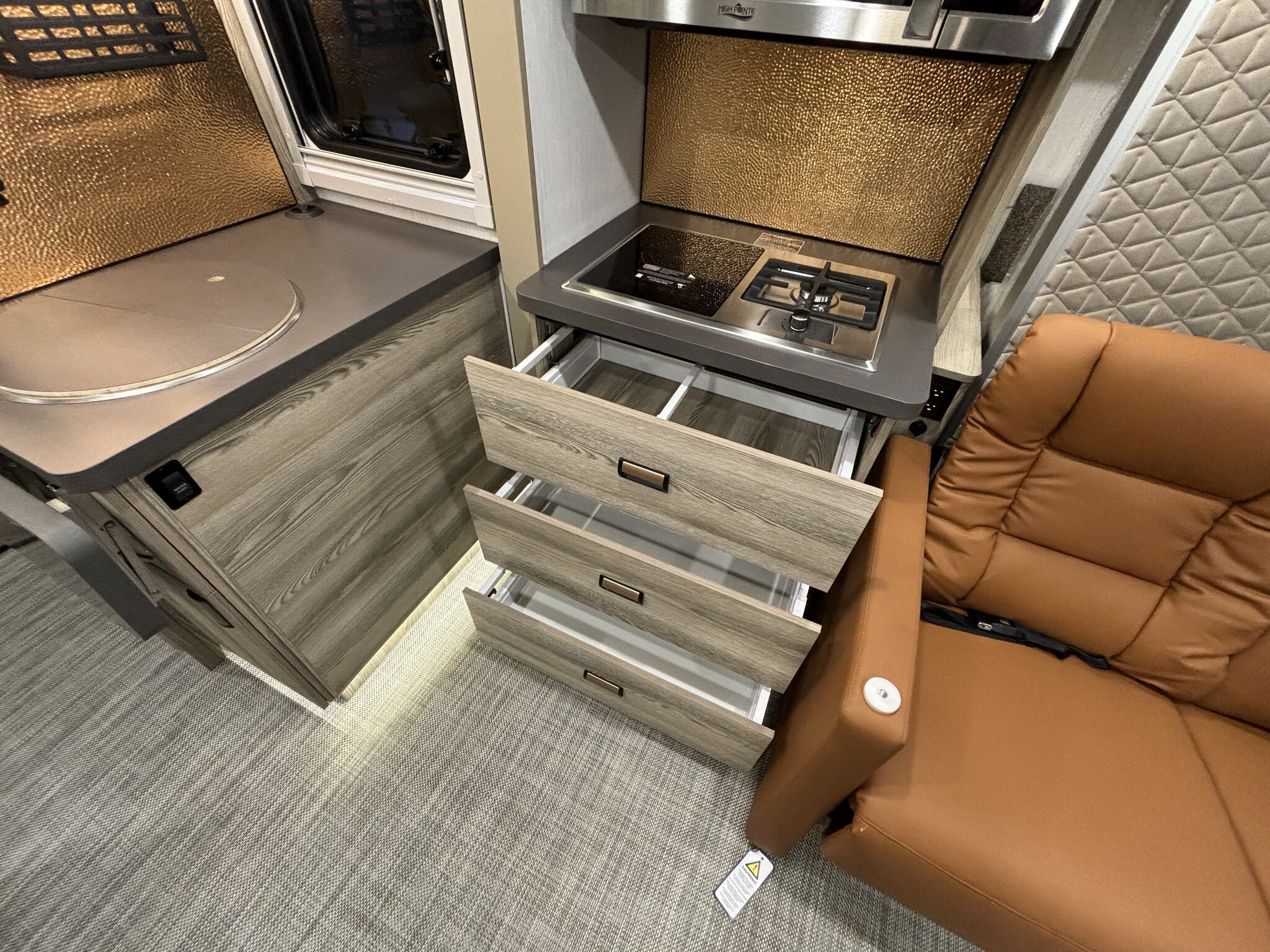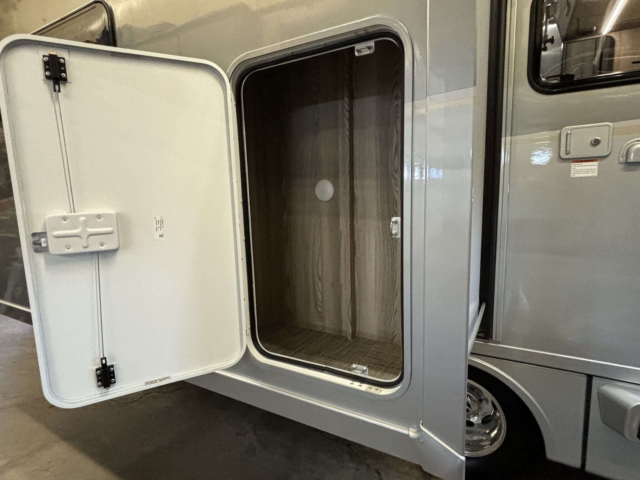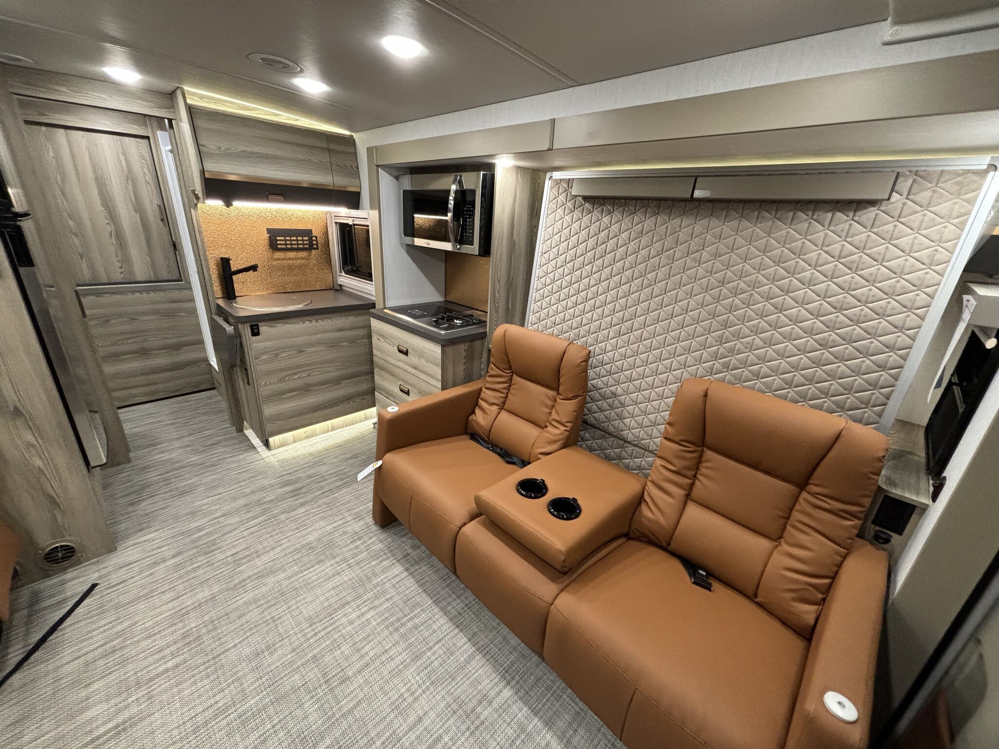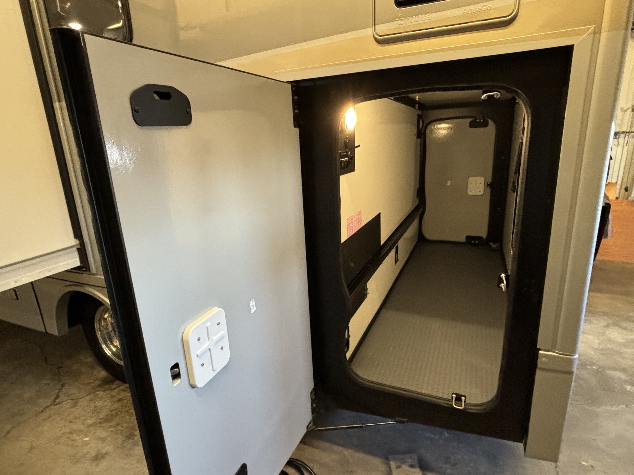 - Heated gear garage w/L-track cargo tie down system, 110V/12V charging ports, and LED lighting