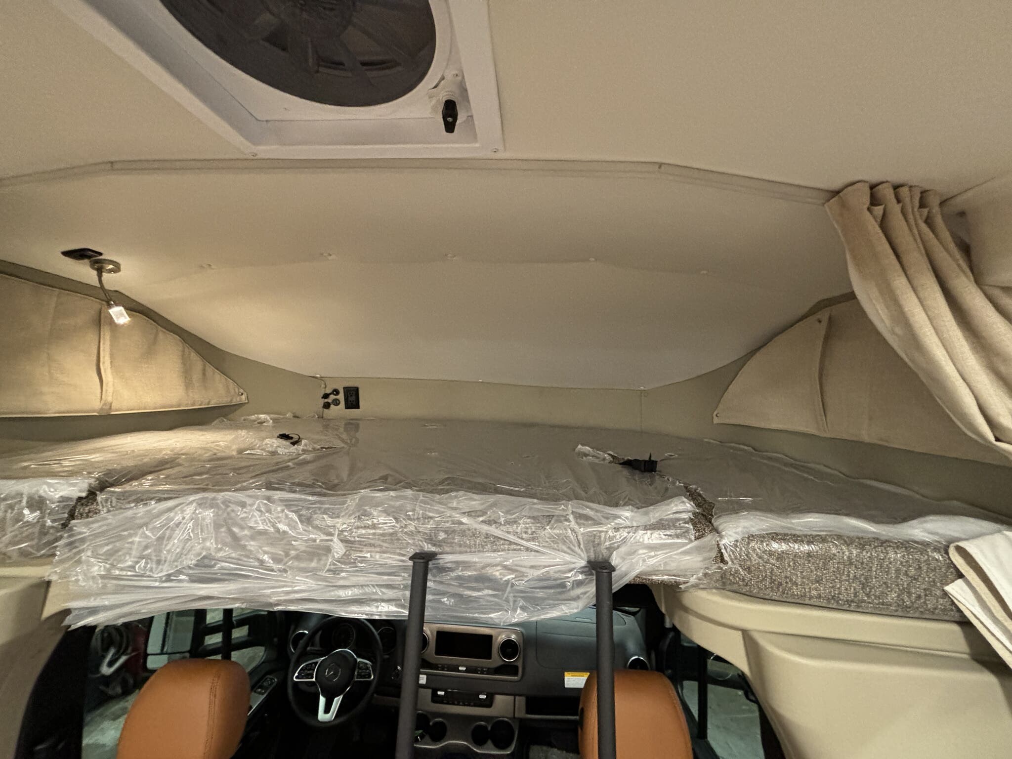 - Powered roof vent w/rain cover, electric lift, remote control, thermostat operation (front bunk/lounge)