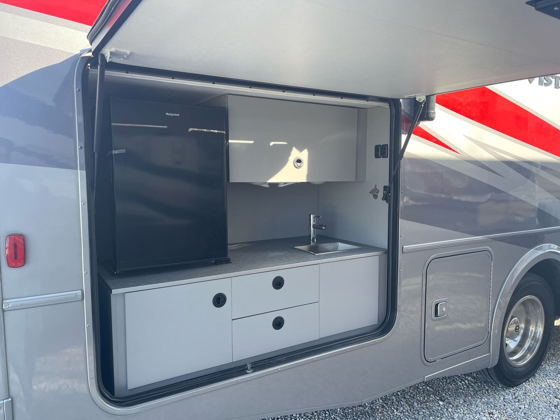 The Vista’s intelligently designed interior centers around practical living, with a dinette area that doubles as additional seating or sleeping space. The queen bed provides a comfortable night’s rest, while the shower, glass shower door, and medicine cabinet contribute to a home-like feel on the road.