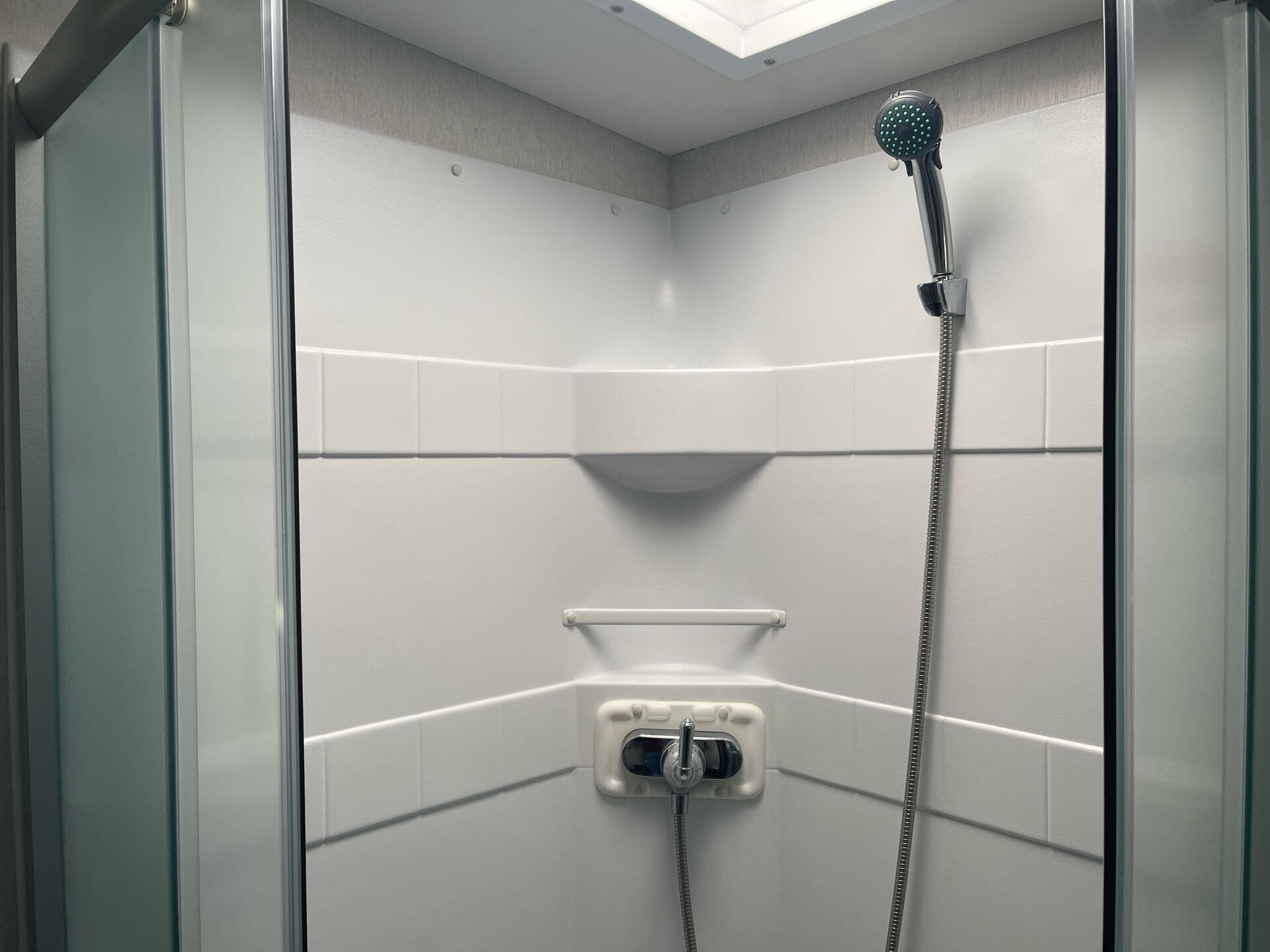 - Living area details: dinette with glass shower door, shower, and toilet for comfort and convenience