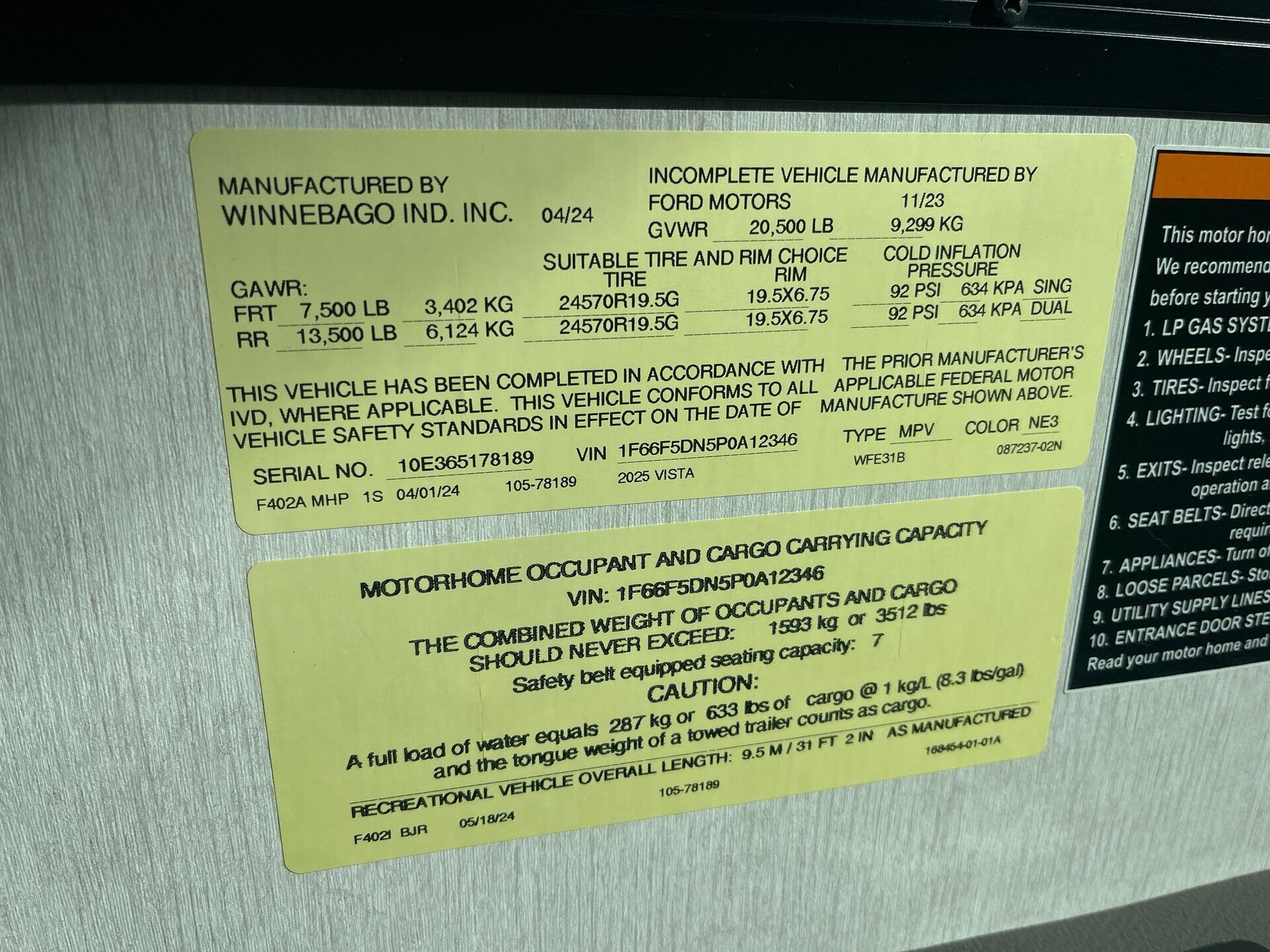 2025 Winnebago Vista 31B Specifications