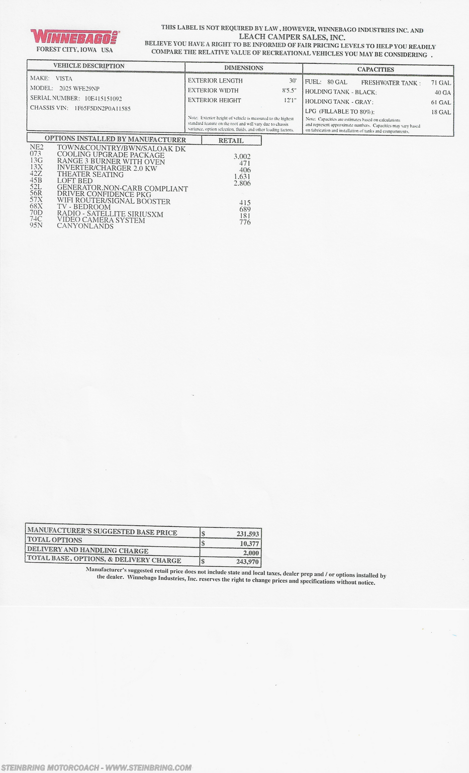 Request More Info on this 2025 Winnebago Vista NPF 29NP Offered for sale by Steinbring Motorcoach
