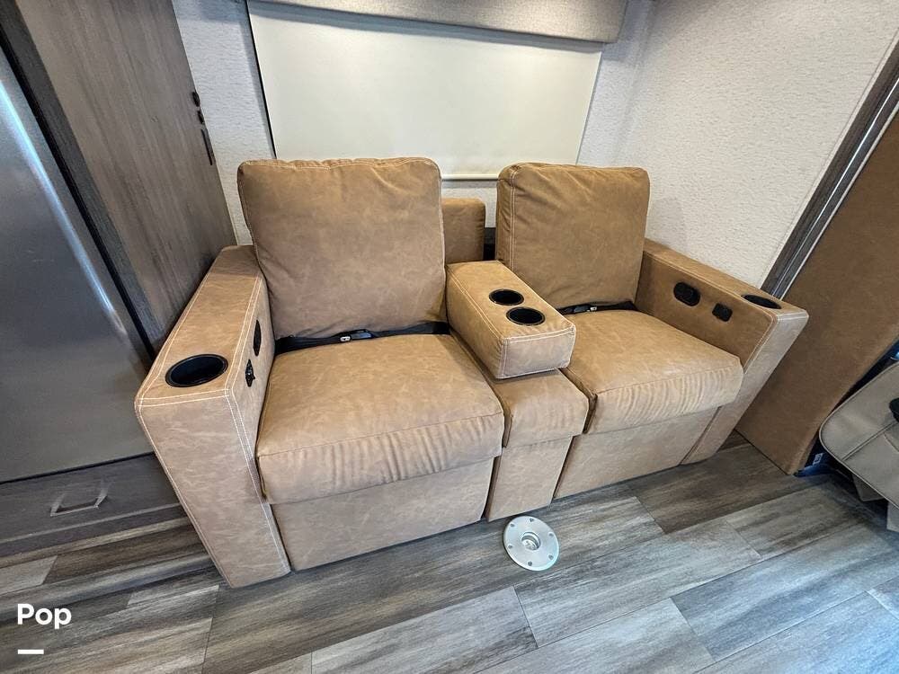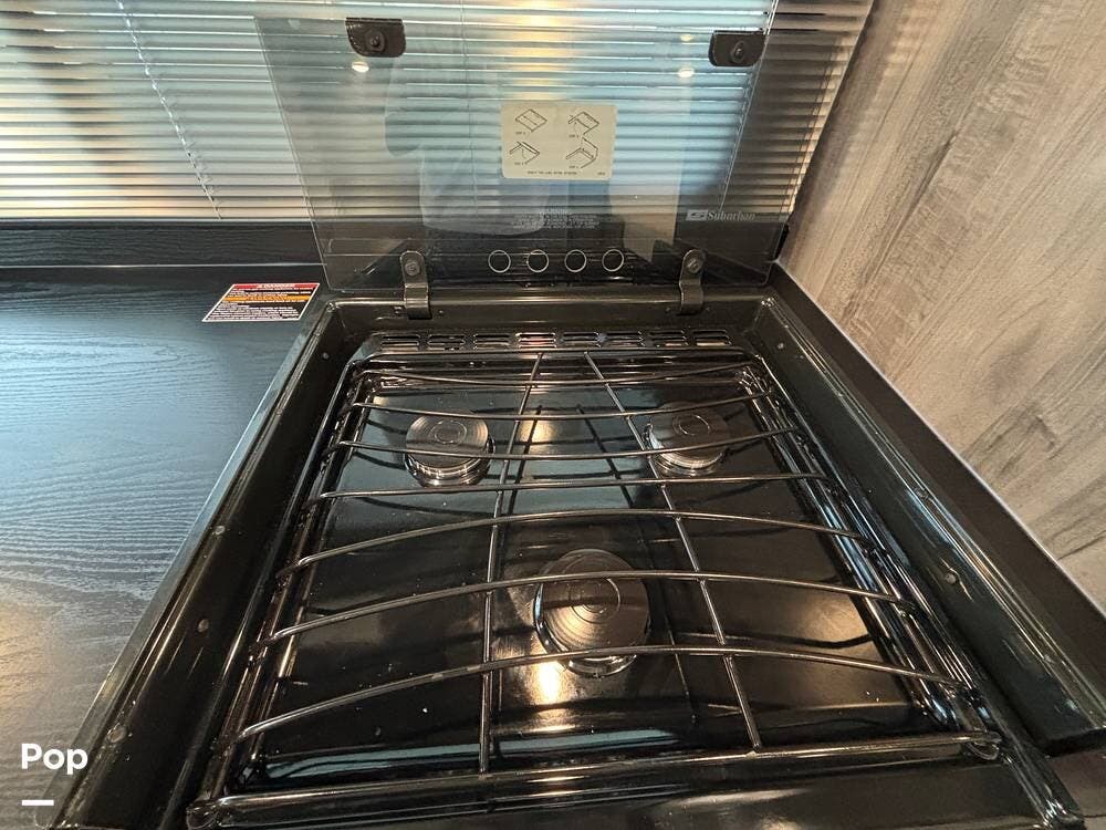 You will find an open layout with dual recliners, a cab-over bunk, and a queen-sized bed, along with a full kitchen and bath, making it comfortable for four to travel.