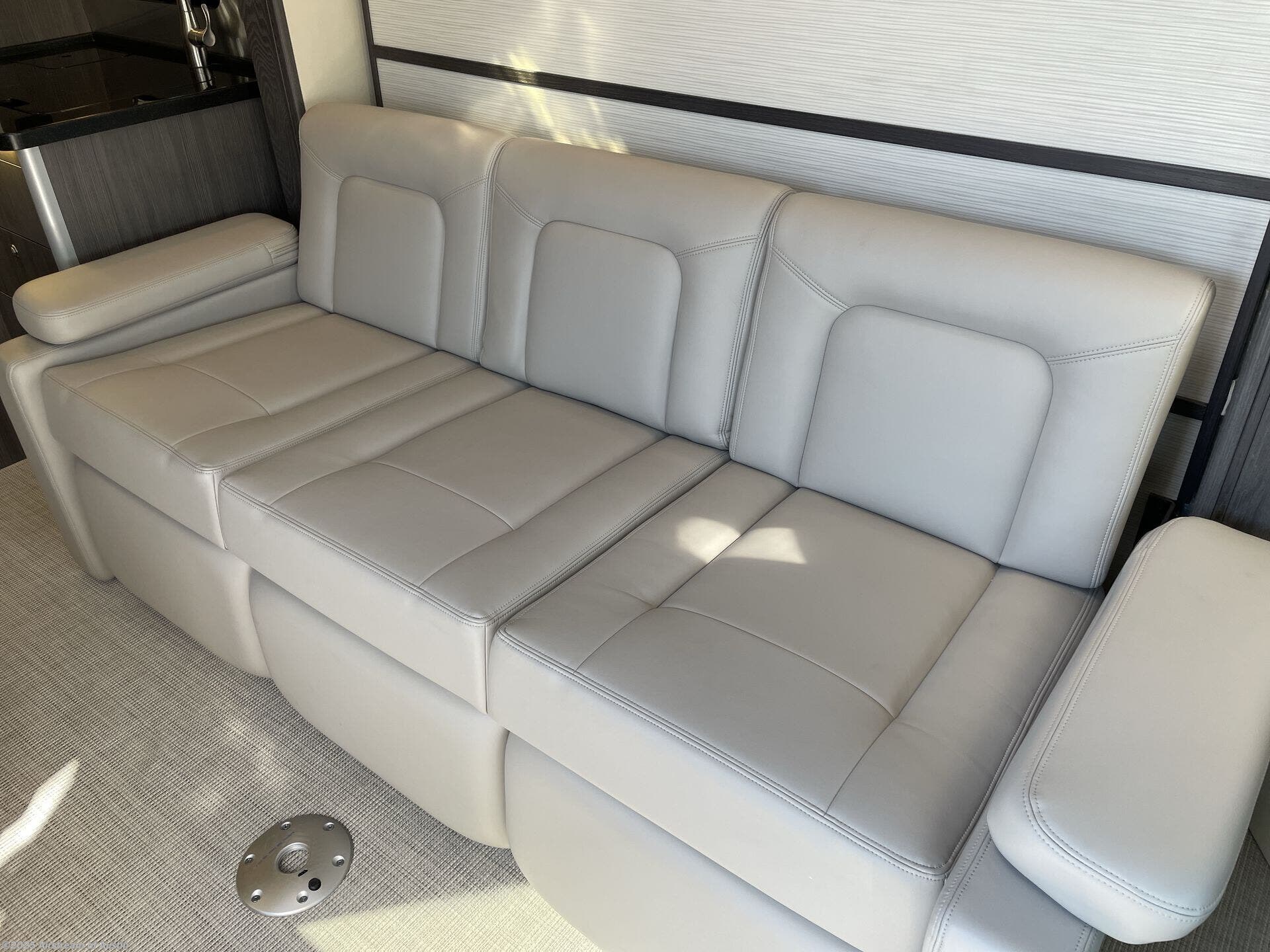 Get ready to explore, unwind and "glamp" where ever you decide! This coach brings you everything you will need, plus much much more! The power slide offers a Murphy suite that retracts and fits seamlessly with the luxury automotive body style. With a touch of a button on the multiplex control panel, you will have more floor space to relax on the reclining sofa that includes two seatbelts or pull down the Murphy bed at night. There is more seating on the captain's chairs that swivel around to face the interior, and there are two tables that adjust to different heights for your needs. The kitchen provides a two-burner gas stove and large stainless steel Kohler sink and faucet, and there is a convection microwave, a slide-out pantry and a refrigerator with a freezer a few steps away.