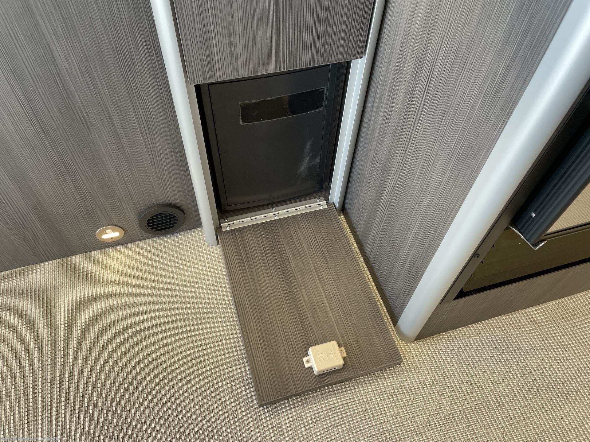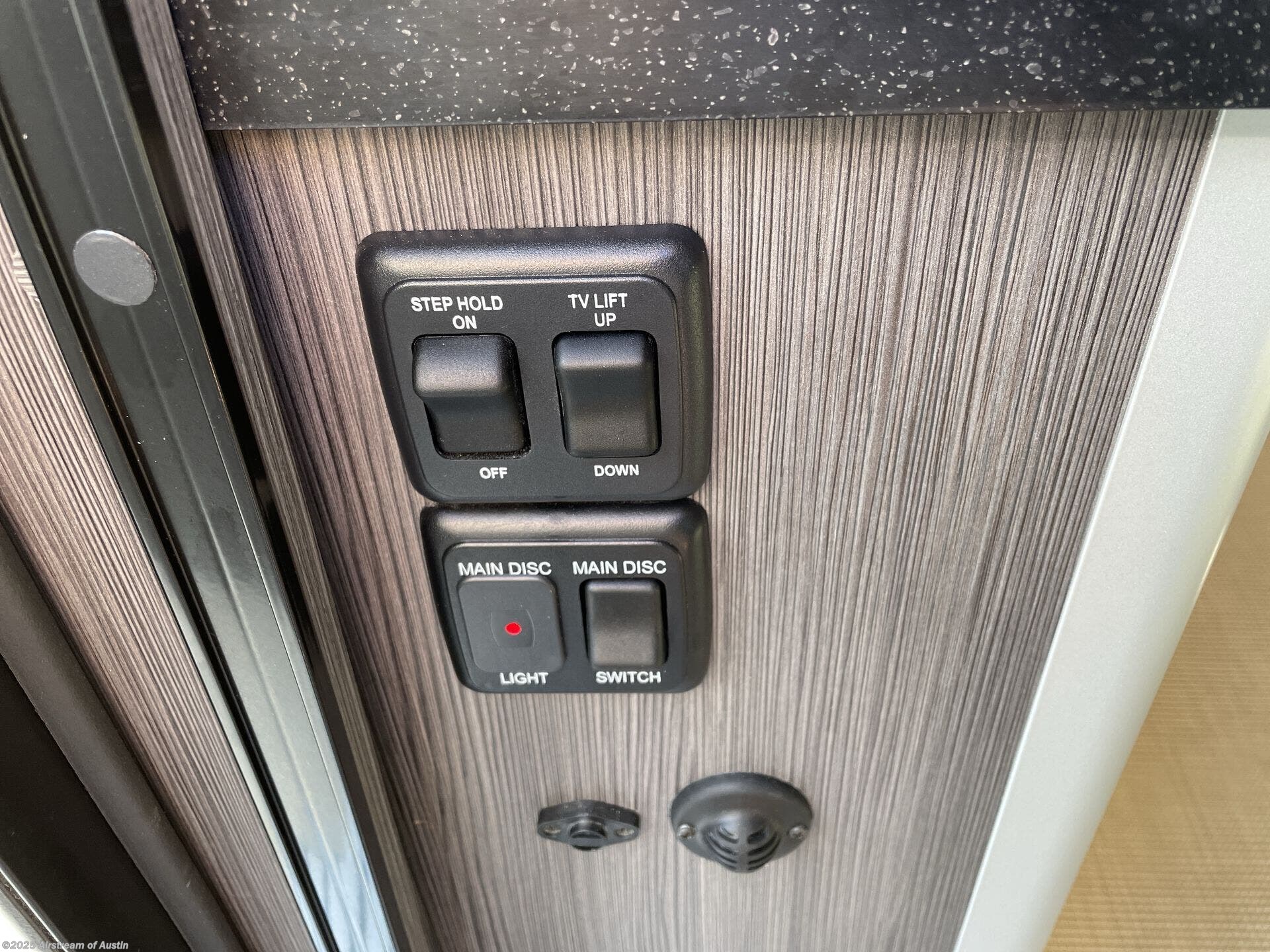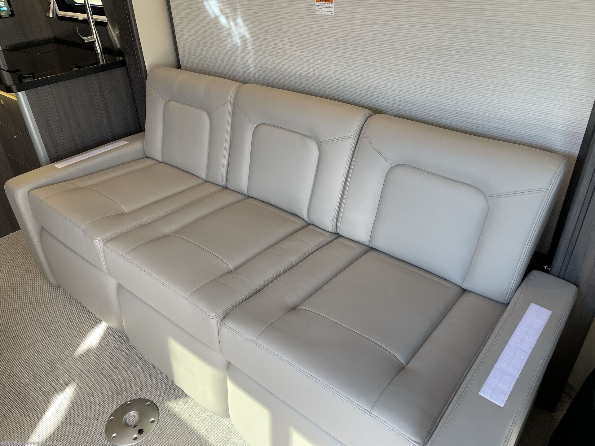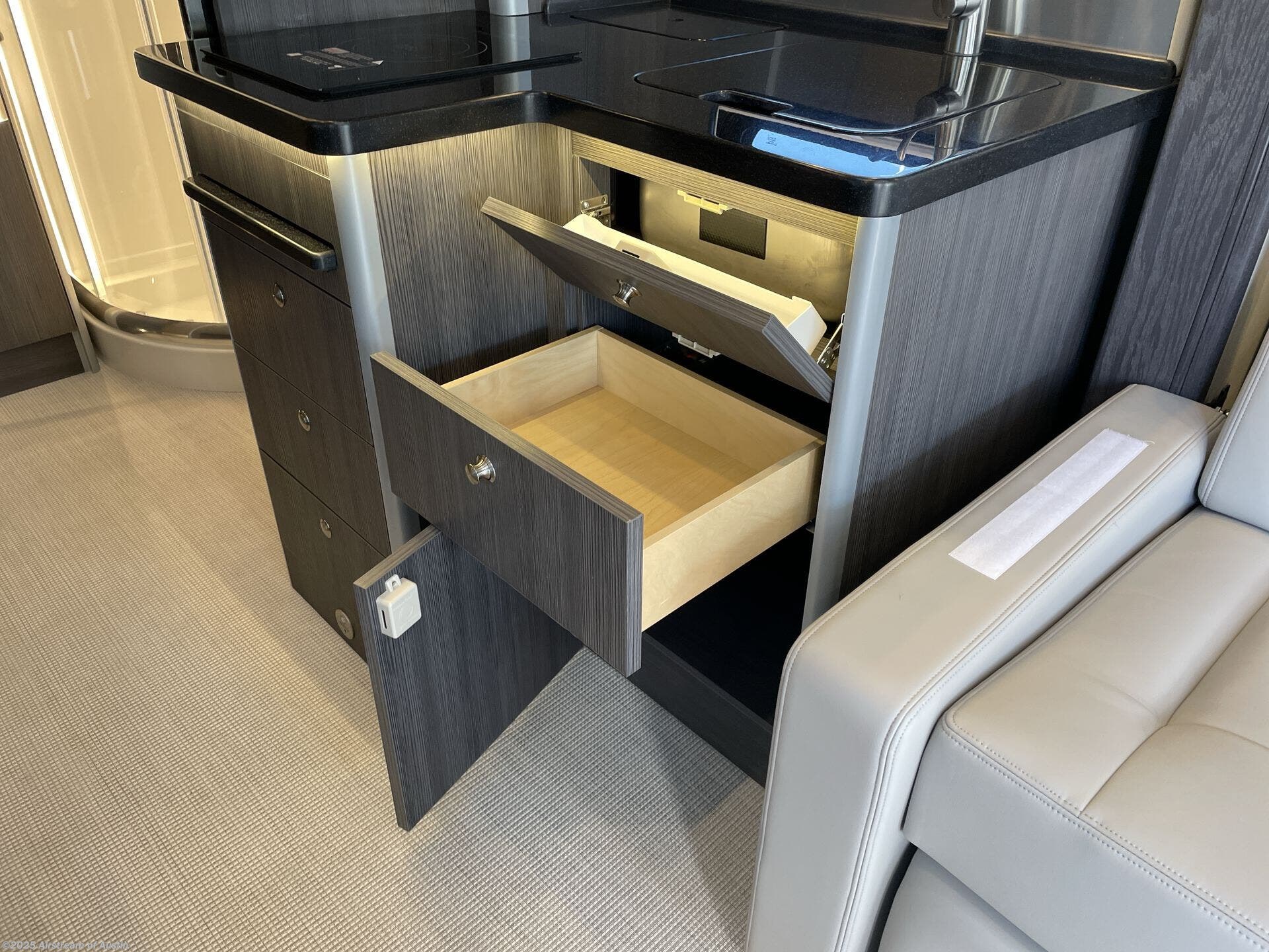 Get ready to explore, unwind and "glamp" where ever you decide! This coach brings you everything you will need, plus much much more! The power slide offers a Murphy suite that retracts and fits seamlessly with the luxury automotive body style. With a touch of a button on the multiplex control panel, you will have more floor space to relax on the reclining sofa that includes two seatbelts or pull down the Murphy bed at night. There is more seating on the captain's chairs that swivel around to face the interior, and there are two tables that adjust to different heights for your needs. The kitchen provides a cooktop and large stainless steel Kohler sink and faucet, and there is a convection microwave, a slide-out pantry and a refrigerator with a freezer a few steps away.