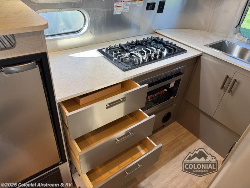 You'll always have a stylish and comfortable place to stay with the Airstream Caravel travel trailer! The manual Zip Dee patio awning can be paired with matching optional window awnings that can help keep the interior cool and private. The rear polished bumper with storage will help you keep your tools, cords, and more hidden away in a bonus storage space, and the JL Audio stereo with Bluetooth connectivity and four speakers, surround sound, and subwoofer will play your music throughout the trailer. You can stay powered while off the grid If you add the optional solar package, depending on the model you choose, and the blackout curtains will let you have privacy when you head to bed. The stainless steel front stone guard protection will prevent damage to the body of your trailer while towing, and the panoramic windows will make the interior fresh and bright with natural sunlight.