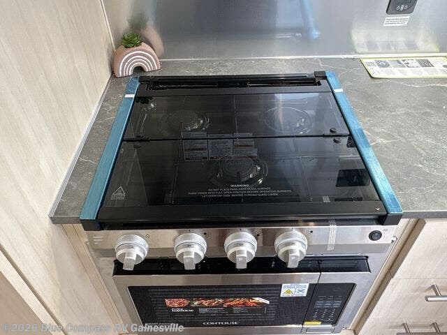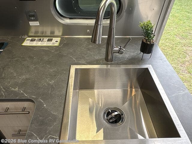 With each Flying Cloud travel trailer by Airstream, there are two axles, and each is built for ease of towing, plus there is a rear-view camera to make reversing and parking easier, and stainless-steel front stone guards to protect the lower segments from road debris. The iconic Airstream design is created outside and inside by the semi-monocoque aluminum superstructure, the temperature reducing one-piece white aluminum roof, the panoramic front windows, and the stylish aluminum wheels. The interior will have you feeling right at home with handcrafted cabinetry, plenty of storage and counter space, sleek roller blinds and blackout curtains, plus residential style faucets!