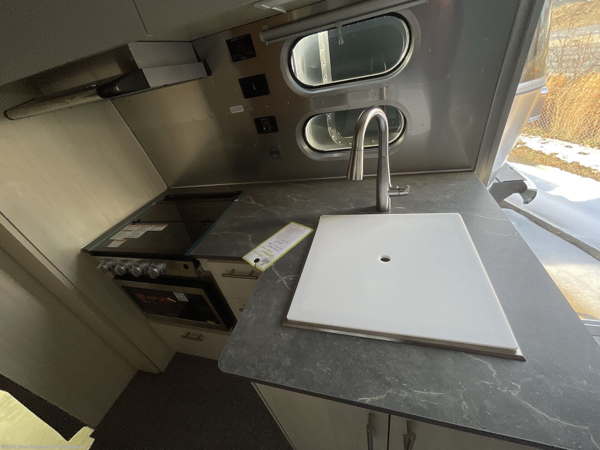 With each Flying Cloud travel trailer by Airstream, there are two axles, and each is built for ease of towing, plus there is a rear-view camera to make reversing and parking easier, and stainless-steel front stone guards to protect the lower segments from road debris. The iconic Airstream design is created outside and inside by the semi-monocoque aluminum superstructure, the temperature reducing one-piece white aluminum roof, the panoramic front windows, and the stylish aluminum wheels. The interior will have you feeling right at home with handcrafted cabinetry, plenty of storage and counter space, sleek roller blinds and blackout curtains, plus residential style faucets!