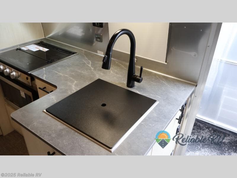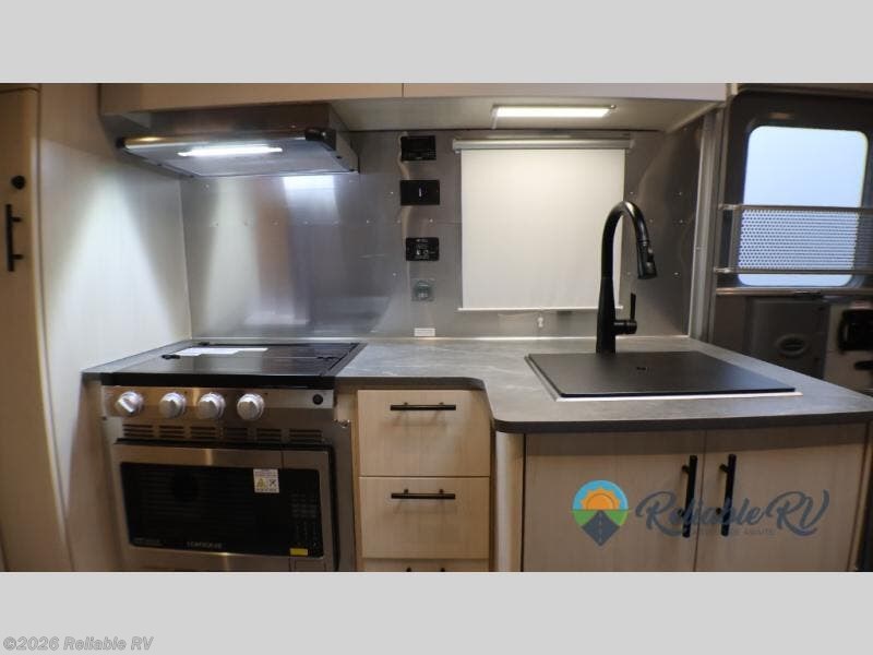 With each Flying Cloud travel trailer by Airstream, there are two axles, and each is built for ease of towing, plus there is a rear-view camera to make reversing and parking easier, and stainless-steel front stone guards to protect the lower segments from road debris. The iconic Airstream design is created outside and inside by the semi-monocoque aluminum superstructure, the temperature reducing one-piece white aluminum roof, the panoramic front windows, and the stylish aluminum wheels. The interior will have you feeling right at home with handcrafted cabinetry, plenty of storage and counter space, sleek roller blinds and blackout curtains, plus residential style faucets!