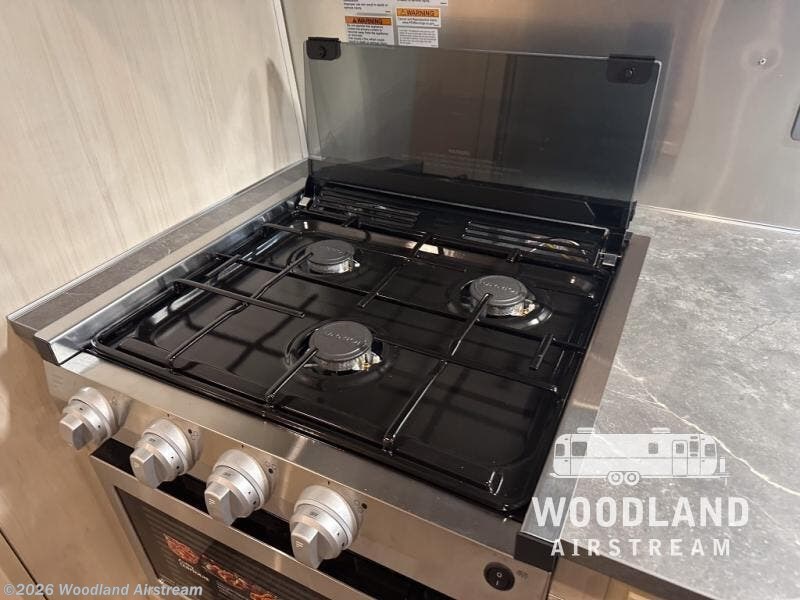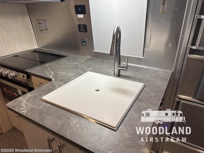 With each Flying Cloud travel trailer by Airstream, there are two axles, and each is built for ease of towing, plus there is a rear-view camera to make reversing and parking easier, and stainless-steel front stone guards to protect the lower segments from road debris. The iconic Airstream design is created outside and inside by the semi-monocoque aluminum superstructure, the temperature reducing one-piece white aluminum roof, the panoramic front windows, and the stylish aluminum wheels. The interior will have you feeling right at home with handcrafted cabinetry, plenty of storage and counter space, sleek roller blinds and blackout curtains, plus residential style faucets!